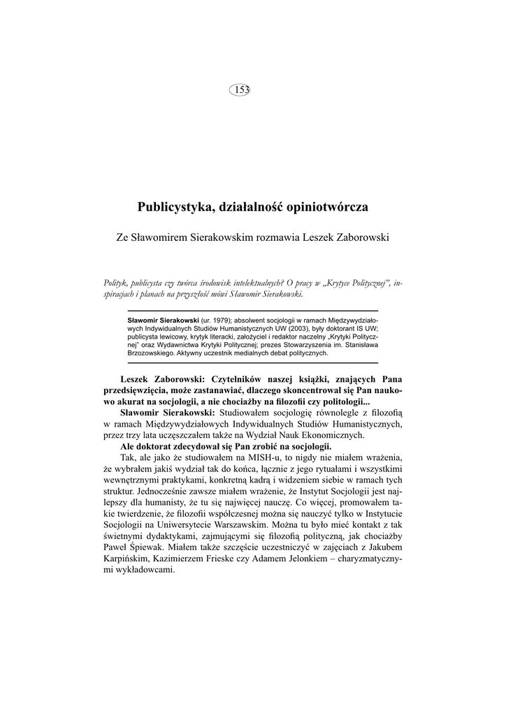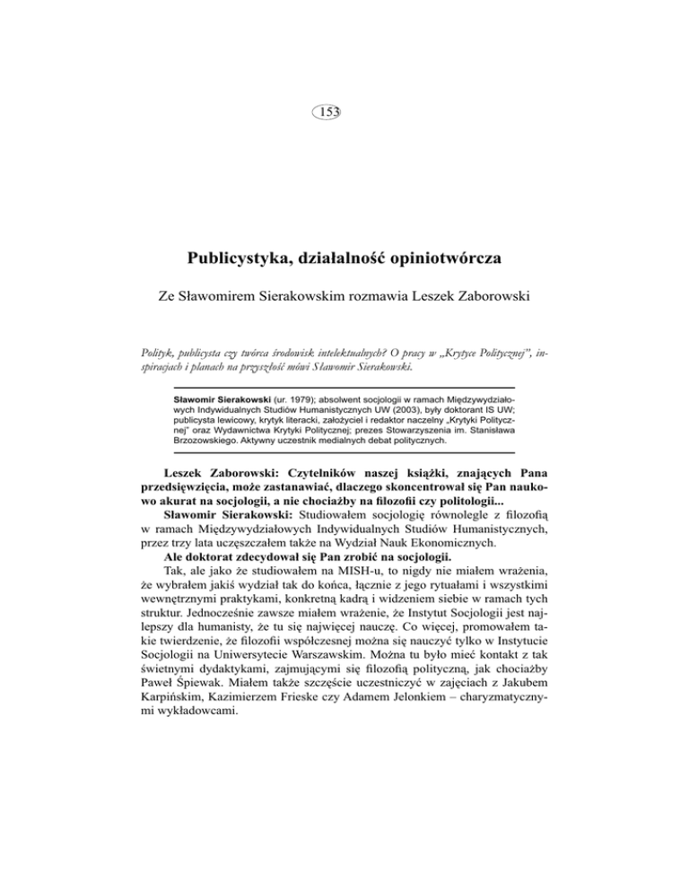 153 Publicystyka, działalność opiniotwórcza Ze Sławomirem Sierakowskim rozmawia Leszek Zaborowski Polityk, publicysta czy twórca środowisk intelektualnych? O pracy w „Krytyce Politycznej”, inspiracjach i planach na przyszłość mówi Sławomir Sierakowski. Sławomir Sierakowski (ur. 1979); absolwent socjologii w ramach Międzywydziałowych Indywidualnych Studiów Humanistycznych UW (2003), były doktorant IS UW; publicysta lewicowy, krytyk literacki, założyciel i redaktor naczelny „Krytyki Politycznej” oraz Wydawnictwa Krytyki Politycznej; prezes Stowarzyszenia im. Stanisława Brzozowskiego. Aktywny uczestnik medialnych debat politycznych. Leszek Zaborowski: Czytelników naszej książki, znających Pana przedsięwzięcia, może zastanawiać, dlaczego skoncentrował się Pan naukowo akurat na socjologii, a nie chociażby na filozofii czy politologii... Sławomir Sierakowski: Studiowałem socjologię równolegle z filozofią w ramach Międzywydziałowych Indywidualnych Studiów Humanistycznych, przez trzy lata uczęszczałem także na Wydział Nauk Ekonomicznych. Ale doktorat zdecydował się Pan zrobić na socjologii. Tak, ale jako że studiowałem na MISH-u, to nigdy nie miałem wrażenia, że wybrałem jakiś wydział tak do końca, łącznie z jego rytuałami i wszystkimi wewnętrznymi praktykami, konkretną kadrą i widzeniem siebie w ramach tych struktur. Jednocześnie zawsze miałem wrażenie, że Instytut Socjologii jest najlepszy dla humanisty, że tu się najwięcej nauczę. Co więcej, promowałem takie twierdzenie, że filozofii współczesnej można się nauczyć tylko w Instytucie Socjologii na Uniwersytecie Warszawskim. Można tu było mieć kontakt z tak świetnymi dydaktykami, zajmującymi się filozofią polityczną, jak chociażby Paweł Śpiewak. Miałem także szczęście uczestniczyć w zajęciach z Jakubem Karpińskim, Kazimierzem Frieske czy Adamem Jelonkiem – charyzmatycznymi wykładowcami. 154 Publicystyka, działalność opiniotwórcza Socjologia była najsilniejsza kadrowo, co przekładało się na najatrakcyjniejszą siatkę zajęć – bardzo zróżnicowaną. Miałem też świadomość, że to właśnie na socjologii dostanę najlepsze ogólnohumanistyczne wykształcenie. Nie szedłem tam po to, żeby wybrać jeden z typowo socjologicznych zawodów. Wiedziałem, że prawdopodobnie nie będę funkcjonował w jakiś klasyczny sposób. To znaczy, nie wybiorę któregoś z najbardziej popularnych scenariuszy życiowych, według których idzie się na rynek pracy po skończeniu studiów. Prowadzi Pan bardzo różnorodną działalność – polityczną, publicystyczną, wydawniczą. Jest Pan także krytykiem literackim. Ostatnio współtworzył Pan sztukę teatralną. Czy realizowanie się w tak różnych sferach nie sprawiało Panu nigdy trudności? Może z którąś z tych ról wiązał się szczególny wysiłek? Ja zawsze chciałem się zajmować polityką. Ale polityką rozumianą w ambitniejszy sposób niż to, co zazwyczaj z nią utożsamiamy, to znaczy jako partyjne rytuały władzy. Polityka jest wpływaniem na kształt życia społecznego. A na ten kształt można i należy wpływać różnymi kanałami, zwłaszcza w czasach, kiedy maleje znaczenie instytucji tradycyjnie kojarzonych z uprawianiem polityki. Nie trzeba nawet kończyć socjologii, wystarczy ją chociażby zacząć, żeby wiedzieć, że polityka umyka współcześnie z takich instytucji jak parlament czy rząd. Rośnie za to rola mediów, kultury, trzeciego sektora. To tam determinuje się spektrum dominujących idei, wokół których obraca się życie polityczne. W „Krytyce Politycznej” byliśmy inspirowani wizją polityczności wyniesioną z czasów opozycji antypeerelowskiej. Polityki, którą uprawia się słowem, pisaniem esejów, tworzeniem środowiska. Byliśmy zainteresowaniem powrotem do koncepcji inteligencji zaangażowanej. Właśnie w Instytucie Socjologii takie typowe inteligenckie postawy się zachowały, lub przynajmniej pamięć o nich trwa. Choć oczywiście jest tam także wiele osób, które uważają się za inteligentów i jednocześnie akceptują niesprawiedliwy kształt transformacji społecznej. Czyli cały czas istnieje pewien wspólny punkt wyjścia dla tych wszystkich pomysłów. Coś, co łączy tak – pozornie – różne rzeczy jak choćby współtworzenie gazety relacjonującej strajk pielęgniarek i pisanie sztuki teatralnej? Tak, mam takie poczucie, że cały czas uczestniczę w tej samej grze: czy piszę tekst krytycznoliteracki, czy razem z Jankiem Klatą przygotowuję sztukę, czy zajmuję się działalnością wydawniczą – tak jak w tej chwili, kiedy przygotowujemy serię ekonomiczną. My próbujemy zbudować wszystkie potrzebne fundamenty pod lewicę. Staramy się zorganizować liczne środowisko, stworzyć sprawną organizację, Ze Sławomirem Sierakowskim rozmawia Leszek Zaborowski 155 ale także zaangażować znaczącą grupę artystów różnych dyscyplin do zainteresowania się życiem społecznym, budujemy instytut badawczy nakierowany na tematykę prawno-ekonomiczną. Ale pierwszym z tych fundamentów jest reaktywacja postawy inteligenckiej, wywodzącej się ze wschodnioeuropejskiego rozumienia inteligencji, czyli z głęboko aksjologicznej wizji służby społecznej, w którą angażuje się inteligencja na rzecz zasypania społecznej przepaści między klasami. W tej wizji inteligent jest kimś, kto ma pewien dług wobec społeczeństwa, kto dąży do tego, żeby stać przy nim. Takie przedsięwzięcia jak wydawnictwo, jak nasza aktywność w mediach masowych, jak tworzenie Klubów KP od Krakowa po Pleszew albo nasze zaangażowanie w strajk pielęgniarek, w przyjazd żon górników... To nie są tematy przypadkowo ze sobą związane. Nieprzypadkowy jest także nasz patron, Stanisław Brzozowski. To był człowiek, który się zajmował filozofią, krytyką literacką, był ideologiem politycznym, pisarzem, krytykiem te