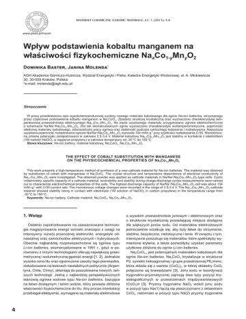 MATERIA£Y CERAMICZNE /CERAMIC MATERIALS/, 67, 1, (2015), 4-8 www.ptcer.pl/mccm Wpływ podstawienia kobaltu manganem na właściwości fizykochemiczne NaxCo1-yMnyO2 Dominika Baster, Janina Molenda* AGH Akademia Górniczo-Hutnicza, Wydział Energetyki i Paliw, Katedra Energetyki Wodorowej, al. A. Mickiewicza 30, 30-059 Kraków, Polska *e-mail: [email protected] Streszczenie W pracy przedstawiono opis wysokotemperaturowej syntezy nowego materiału katodowego dla ogniw Na-ion batteries, otrzymanego przez częściowe podstawienie kobaltu manganem w NaxCoO2. Zbadano strukturę krystaliczną oraz wyznaczono charakterystykę temperaturową przewodnictwa elektrycznego Na0,7Co0,7Mn0,3O2. Na bazie uzyskanego materiału przygotowano ogniwa elektrochemiczne o schemacie Na/Na+/NaxCo0,7Mn0,3O2. Dla tak skonstruowanych ogniw wyznaczono charakterystyki woltamperometryczne, pojemność właściwą materiału katodowego, odwracalność pracy ogniwa oraz stabilność podczas cyklicznego ładowania i rozładowania. Najwyższa uzyskana pojemność rozładowania ogniwa Na/Na+/NaxCo0,7Mn0,3O2 wynosiła 104 mAh·g-1 przy szybkości rozładowania C/35. Monotoniczną zmianę potencjału zarejestrowano w zakresie 2,5-3,4 V. Materiał katodowy Na0,7Co0,7Mn0,3O2 jest stabilny w kontakcie z elektrolitem (1M roztwór NaClO4 w węglanie propylenu) w zakresie temperatury od -30 °C do 150 °C. Słowa kluczowe: Na-ion battery, materiał katodowy, NaxCoO2, NaxCo0,7Mn0,3O2 THE EFFECT OF COBALT SUBSTITUTION WITH MANGANESE ON THE PHYSICOCHEMICAL PROPERTIES OF NaxCo1-yMnyO2 This work presents a high-temperature method of synthesis of a new cathode material for Na-ion batteries. The material was obtained by substitution of cobalt with manganese in NaxCoO2. The crystal structure and temperature dependence of electrical conductivity of Na0.7Co0.7Mn0.3O2 were investigated. The obtained powder was applied as cathode materials in Na/Na+/NaxCo0.7Mn0.3O2-type cells. Cyclic voltammetry, specific capacity of a cathode material, reversibility and stability during charge-discharge cycles measurements were carried out to characterize electrochemical properties of the cells. The highest discharge capacity of Na/Na+/NaxCo0.7Mn0.3O2 cell was about 104 mAh·g-1 with C/35 current rate. The monotonous voltage changes were recorded in the range of 2.5-3.4 V. The Na0.7Co0.7Mn0.3O2-cathode material showed stability being in contact with electrolyte (1M solution of NaClO4 in carbon propylene) in the temperature range from -30 °C to 150 °C. Keywords: Na-ion battery, Cathode material, NaxCoO2, NaxCo0.7Mn0.3O2. 1. Wstęp Ostatnio zapotrzebowanie na zaawansowane technologie magazynowania energii wzrosło znacząco z uwagi na intensywny rozwój przenośnej elektroniki, energetyki odnawialnej oraz samochodów elektrycznych i hybrydowych. Obecnie najbardziej rozpowszechnione są ogniwa typu Li-ion batteries, skomercjalizowane w 1991 r., gdyż w porównaniu z innymi technologiami oferują największą grawimetryczną i wolumetryczną gęstość energii [1, 2]. Jednakże wysoka cena litu oraz ograniczone zasoby tego pierwiastka, zlokalizowane na terenach niestabilnych politycznie (Argentyna, Chile, Chiny), skłaniają do poszukiwania nowych, tańszych technologii. Jedną z najbardziej perspektywicznych stanowią ogniwa sodowe typu Na-ion batteries, bazujące na łatwo dostępnym i tanim sodzie, który posiada zbliżone właściwości fizykochemiczne do litu. Aby proces interkalacji przebiegał efektywnie, wymagane są materiały elektrodowe 4 o wysokim przewodnictwie jonowym i elektronowym oraz o strukturze krystalicznej posiadającej miejsca dostępne dla większych jonów sodu. Od materiałów elektrodowych jednocześnie oczekuje się, aby były łatwe do otrzymania, stabilne, bezpieczne, nietoksyczne i tanie. W związku z tym, intensywnie poszukuje się materiałów, które spełniałyby wymienione kryteria, a także pozwoliłyby uzyskać parametry użytkowe zbliżone do ogniw Li-ion batteries. NaxCoO2-y jest potencjalnym materiałem katodowym dla ogniw Na-ion batteries. NaxCoO2 krystalizuje w strukturze P2, symetrii heksagonalnej i grupie przestrzennej P63/mmc, która składa się z warstw (CoO2)n, w której oktaedry CoO6 połączone są krawędziami [3]. Jony sodu w koordynacji trygonalno-pryzmatycznej zajmują dwa typy pozycji krystalograficznych w przestrzeniach międzywarstwowych (CoO2)n [3]. Pryzmy trygonalne NaO6 wokół jonu sodu w pozycji typu Na(1) łączą się płaszczyznami z oktaedrami CoO6, natomiast w pozycji typu Na(2) pryzmy trygonalne Wpływ podstawienia kobaltu manganem na właściwości fizykochemiczne NaxCo1-yMnyO2 wokół jonu sodu przylegają tylko krawędziami do oktaedrów CoO6. Położenie jonów sodu w pozycji typu Na(1) jest mniej korzystne energetycznie z powodu elektrostatycznego odpychania pomiędzy jonami sodu i kobaltu [4]. Równoczesne obsadzenie obu pozycji sodu prowadzi do minimalizacji elektrostatycznego odpychania pomiędzy kationami sodu, a zatem do stabilizacji struktury krystalicznej [3-5]. W poprzedniej dekadzie NaxCoO2 wzbudził ogromne zainteresowanie z uwagi na jego unikalne właściwości, takie jak wysoka wartość siły termoelektrycznej (rzędu 80 μV·K-1) dla x ≈ 0,65, 0,70, 0,75 oraz przewodnictwo elektryczne typu metalicznego [6]. Następnie odkryto nadprzewodnictwo uwodnionego NaxCoO2 (x ≈ 0,35) w T ≈ 4,2 K [7]. Badania NaxCoO2-y jako materiału katodowego dla ogniw Na-ion batteries ujawniły nietypowy, schodkowy kształt krzywej rozładowania ogniwa z kilkoma charakterystycznymi pseudo-plateaus potencjału, który jest niekorzystny w aspekcie aplikacyjnym [3-5]. Przeprowadzono próbę poprawy właściwości elektrochemicznych NaxCoO2 poprzez częściowe podstawienie kobaltu manganem, uzyskując skład Na2/3Co2/3Mn1/3O2 [8]. Materiał ten wykazuje ciągłą zmianę potencjału (3,2- 2,4 V) w szerokim zakresie zawartości sodu. W Na0,66Co0,66Mn0,33O2 można odwracalnie wprowadzać i wyprowadza