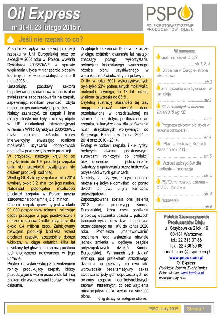 Oil Express nr 30-II, 23 lutego 2015 r. Jeśli nie rzepak to co? Zasadniczy wpływ na rozwój produkcji rzepaku w Unii Europejskiej oraz po akcesji w 2004 roku w Polsce, wywarła Dyrektywa 2003/30/WE w sprawie wspierania użycia w transporcie biopaliw lub innych paliw odnawialnych z dnia 8 maja 2003 r. Umacniając podstawy sektora biopaliwowego spowodowała ona istotne zwiększenie zapotrzebowania na rzepak, zapewniając rolnikom pewność zbytu nasion, co gwarantowały jej przepisy. Należy zaznaczyć, że rzepak i inne rośliny oleiste nie były i nie są objęte w UE działaniami interwencyjnymi w ramach WPR. Dyrektywa 2003/30/WE miała natomiast pośredni wpływ interwencyjny stwarzając rolnikom możliwość uzyskania dodatkowych dochodów przez zwiększenie produkcji. W przypadku naszego kraju to po przystąpieniu do UE produkcja rzepaku stała się najszybciej rozwijającym się działem produkcji roślinnej. Według GUS zbiory rzepaku w roku 2014 wyniosły około 3,2 mln ton jego nasion. Natomiast potencjalne możliwości produkcji rzepaku w Polsce można szacować na co najmniej 3,5 mln ton. Obecnie rzepak uprawiany jest w około 90 000 gospodarstw rolnych i wliczając osoby pracujące w jego przetwórstwie i otoczeniu stanowi źródło utrzymania dla około 0,4 miliona osób. Zainicjowany rozwojem produkcji biodiesla wzrost produkcji rzepaku szczególnie dobrze widoczny w ciągu ostatnich kilku lat uzyskany był głównie za sprawą postępu technologicznego notowanego w jego uprawie. Postęp ten wykorzystują z powodzeniem rolnicy produkujący rzepak, którzy pozostają jemu wierni przez wiele lat i są znakomicie wyedukowani i sprawni w tym działaniu. Znajduje to odzwierciedlenie w fakcie, że w ciągu ostatnich dwunastu lat nastąpił znaczący postęp wykorzystaniu potencjału hodowlanego wyrażonego różnica plonu uzyskiwanego w warunkach doświadczalnych i polowych. O ile w roku 2001 wykorzystywanych było tylko 53% potencjalnych możliwości materiału siewnego, to 13 lat później wielkość ta wzrosła do 65 %. Czytelną ilustrację słuszności tej tezy mogą stanowić również dane przedstawione w przedstawionej na stronie 2 tabeli dotyczące ilości odmian rzepaku, kukurydzy oraz dla porównania roślin strączkowych wpisywanych do Krajowego Rejestru w latach 2004 – 2014 oraz 2010 - 2014. Postęp w hodowli rzepaku i kukurydzy, będących dwoma podstawowymi surowcami rolniczymi do produkcji biokomponentów, jednoznacznie świadczy o upatrywaniu przez hodowców przyszłości w tych gatunkach. Niestety, z przyczyn, których obecnie można się jedynie domyślać od ponad dwóch lat trwa unijna kampania antyrzepakowa. Zapoczątkowana została ona jesienią 2012 roku propozycją Komisji Europejskiej, która chce obniżenia o połowę wskaźnika udziału w paliwach transportowych paliw tzw. I generacji przewidzianego na 10% do końca 2020 roku. Późniejsze „manewrowanie” poziomem tego wskaźnika niewiele jednak zmienia w ogólnym osądzie antyrzepakowych działań Komisji Europejskiej. W ramach tych działań Komisja, pod pretekstem szkodliwego działania na pszczoły, na dwa lata wprowadziła bezalternatywny zakaz stosowania jedynych dopuszczonych do ochrony rzepaku neonikotynoidowych zapraw nasiennych, co bez wątpienia musi negatywnie skutkować na wielkość plonu. Ciąg dalszy na następnej stronie. W numerze: Jeśli nie rzepak to co? …………..………….......str.1, 2, 3 Biopaliwa w Europie- strona internetowa ………..…………….…............str.3 Zmniejszenie cen żywności - w tym oleju ………..……………................str.3 Bilans oleistych w sezonie 2014/2015 wg KE ……………… …………….…..str.4 Prognoza zbiorów oleistych w sezonie 2015/2016 ……..…………….……….......str. 4 Plan Urzędowej Kontroli Pasz na rok 2015 …………………...……………str. 5 Wzrost subsydiów dla biodiesla - Indonezja …………………………………str. 5 PSPO ma nowego członka – STAOIL Sp. z o.o. …………………………………str. 5 Notowania ………..……...………………...str.6 Polskie Stowarzyszenie Producentów Oleju ul. Grzybowska 2 lok. 49 00-131 Warszawa tel.: 22 313 07 88 fax.: 22 436 39 66 e-mail: [email protected] www.pspo.com.pl Oil Express: Redakcja: Joanna Żuchniewicz Foto: własne, www.freefoto.pl, www.pixabay.com PSPO Luty 2015 Strona 1 Oil Express nr 30-II, 23 lutego 2015 P Jeśli nie rzepak to co? – cd. Wobec rozpoczęcia przez KE kampanii antyrzepakowej zasadne staje się uzyskanie odpowiedzi na pytanie Jeśli nie rzepak to co? Wyczerpująca odpowiedź na tak postawione pytanie powinna składać się z odpowiedzi na dwa inne pytania. Co w zakresie skutków gospodarczych oraz co w zamian w zakresie surowców do produkcji biopaliw? Co w zakresie skutków gospodarczych? W przypadku Polski wspomniana uprzednio propozycja ograniczenia udziału biopaliw I generacji spowoduje znaczne ograniczenie produkcji rzepaku skutkujące destabilizacją produkcji rolniczej w postaci obniżki dochodów rolników przez znaczne ograniczenie produkcji rzepaku, a także: utratą źródła utrzymania przez kilkaset tysięcy osób, ograniczeniem przerobu nasion rzepaku, co może się równać z koniecznością zamknięcia części krajowych zakładów przetwórczych koniecznością odłogowania około pół miliona hektarów gruntów ornych wysokiej jakości. poważnymi zakłóceniami w produkcji zbóż, a głównie pszenicy. Jednym z najgroźniejszych skutków takich działań będzie istotne osłabienie konkurencyjności unijnych producentów i przetwórców rzepaku wobec jego pozaunijnych producentów i przetwórców, którzy są wolni od różnych obciążających unijnych przedsiębiorców zobowiązań. Znaczne ograniczenie produkcji biopaliw I generacji spowoduje istotne pogorszenie bilansu paszowego będące skutkiem zmniejszenia produkcji pasz rzepakowych nawet o 2/3 i konieczno