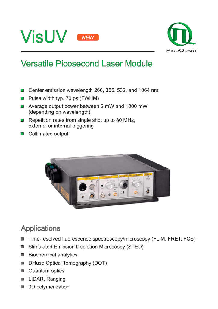 VisUV NEW PICOQUANT Versatile Picosecond Laser Module Center emission wavelength 266, 355, 532, and 1064 nm Pulse width typ. 70 ps (FWHM) Average output power between 2 mW and 1000 mW (depending on wavelength) Repetition rates from single shot up to 80 MHz, external or internal triggering Collimated output Applications Time-resolved fluorescence spectroscopy/microscopy (FLIM, FRET, FCS) Stimulated Emission Depletion Microscopy (STED) Biochemical analytics Diffuse Optical Tomography (DOT) Quantum optics LIDAR, Ranging 3D polymerization The VisUV laser is a versatile and flexible platform based on a Master Oscillator Fiber Amplifier (MOFA) concept with frequency conversion. The master oscillator generates infrared picosecond pulses at 1064 nm with variable repetition rates up to 80 MHz using the proven gain-switching techniques from PicoQuant. The output of this seed laser is directly connected to a multi-stage fiber amplifier, which boosts the output from the seed laser by several dB while maintaining the other characteristics of the seed laser beam like the emission wavelength, polarization and the pulse width. Flexible wavelength configuration The high pulse energies of the amplified 1064 nm infrared laser permit efficient wavelength conversions using second, third, and fourth harmonic generation (SHG, THG, FHG). In that way it is possible to generate picosecond pulses at 1064, 532, 355, and 266 nm with average optical power values of more than 1000, 750, 10 and 2 mW respectively. While any wavelength is available individually, 266, 355 and 532 nm can also be offered in combination of two or three wavelengths. Each wavelength is emitted from a separate beam output equipped with an individual shutter. Flexible repetition rate The VisUV can be operated at 12 different internally selectable repetition rates between 31.25 kHz and 80 MHz and can also be triggered externally by TTL or NIM signals at any repetition rate between single shot and 80 MHz. Excellent beam quality The VisUV features nearly perfectly circular and gaussian shaped beam profiles (TEM00) which can be specified as a value of M² < 1.1 and M² < 1.2 at 532 nm and 355 nm, respectively. Compact stand alone device The VisUV is a stand alone device with a special design optimized for maximum heat dissipation. It includes all driving functions of the established PDL series laser driver such as choice of repetition rate and trigger source. An optional remote control for the VisUV allows to set the trigger source, the repetition rate, and the general output power of the laser. Specifications VisUV versions with 2 or 3 output wavelengths Optical output Center wavelength* . . . . . . . . . . . . . . . . . . . . . . . 266 ± 1 nm. . . . . . . . . . . . 355 ± 1 nm . . . . . . . . . . . 532 ± 2 nm Maximum average output power . . . . . . . . . . . . . > 2 mW . . . . . . . . . . . . . . > 5 mW . . . . . . . . . . . . . . > 250 mW Pulse width (FWHM) . . . . . . . . . . . . . . . . . . . . . . < 70 ps. . . . . . . . . . . . . . . < 70 ps. . . . . . . . . . . . . . . < 70 ps Spectral width . . . . . . . . . . . . . . . . . . . . . . . . . . . << 1 nm . . . . . . . . . . . . . . << 1 nm . . . . . . . . . . . . . . << 1 nm Output . . . . . . . . . . . . . . . . . . . . . . . . . . . . . . . . . collimated beam** . . . . . . collimated beam . . . . . . . collimated beam Divergence . . . . . . . . . . . . . . . . . . . . . . . . . . . . . < 2 mrad . . . . . . . . . . . . . < 0.5 mrad . . . . . . . . . . . . < 0.5 mrad Beam diameter . . . . . . . . . . . . . . . . . . . . . . . . . . 1.0 mm ± 0.2 mm. . . . . . . 1.5 mm ± 0.2 mm. . . . . . . 2.1 mm ± 0.2 mm Beam quality . . . . . . . . . . . . . . . . . . . . . . . . . . . . M² < 1.1 (vertical), . . . . . . M² < 1.2 (typ. ~ 1.1), . . . . M² < 1.1 (typ. ~ 1.02), M² < 1.5 (horizontal) TEM00 TEM00 Max time delay between outputs . . . . . . . . . . . . . < 1 ns. . . . . . . . . . . . . . . . < 1 ns. . . . . . . . . . . . . . . . < 1 ns PER . . . . . . . . . . . . . . . . . . . . . . . . . . . . . . . . . . . > 25 dB . . . . . . . . . . . . . . > 25 dB . . . . . . . . . . . . . . > 25 dB Power stability (12 hours, Tambient < 0.5 K) . . . . . < 3 % rms . . . . . . . . . . . . < 3 % rms . . . . . . . . . . . . < 3 % rms VisUV versions with single output wavelength VisUV-266 VisUV-355 VisUV-532 Optical output Center wavelength* . . . . . . . . . . . . . . . . . . . . . . . 266 ± 1 nm. . . . . . . . . . . . 355 ± 1 nm . . . . . . . . . . . 532 ± 2 nm Maximum average output power . . . . . . . . . . . . . > 2 mW . . . . . . . . . . . . . . > 10 mW . . . . . . . . . . . . . > 300 mW Pulse width (FWHM) . . . . . . . . . . . . . . . . . . . . . . < 70 ps. . . . . . . . . . . . . . . < 70 ps. . . . . . . . . . . . . . . < 70 ps Spectral width . . . . . . . . . . . . . . . . . . . . . . . . . . . << 1 nm . . . . . . . . . . . . . . << 1 nm . . . . . . . . . . . . . . << 1 nm Output . . . . . . . . . . . . . . . . . . . . . . . . . . . . . . . . . collimated beam** . . . . . . collimated beam . . . . . . . collimated beam Divergence . . . . . . . . . . . . . . . . . . . . . . . . . . . . . < 2 mrad . . . . . . . . . . . . . < 0.5 mrad . . . . . . . . . . . . < 0.5 mrad Beam diameter . . . . . . . . . . . . . . . . . . . . . . . . . . 1.0 mm ± 0.2 mm. . . . . . . 1.5 mm ± 0.2 mm. . . . . . . 2.1 mm ± 0.2 mm Beam quality . . . . . . . . . . . . . . . . . . . . . . . . . . . . M² < 1.1 (vertical), . . . . . . M² < 1.2 (typ. ~ 1.1), . . . . M² < 1.1 (typ. ~ 1.02), M² < 1.5 (horizontal) TEM00 TEM00 Max time delay between outputs . . . . . . . . . . . . . none (one beam only) . . . none (one beam only) . . . none (one beam only) PER . . . . . . . . . . . . . . . . . . . . . . . . . . . . . . . . . . . > 25 dB . . . . . . . . . . . . . . > 25 dB . . . . . . . . . . . . . . > 25 dB Power stability (12 hours, Tambient < 0.5 K) . . . . . < 3 % rms . . . . . . . . . . . . < 3 % rms . . . . . . . . . . .