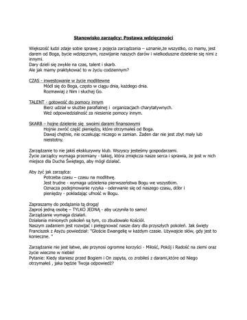 Stanowisko zarządcy: Postawa wdzięczności Większość ludzi zdaje sobie sprawę z pojęcia zarządzania – uznanie,że wszystko, co mamy, jest darem od Boga, bycie wdzięcznym, rozwijanie naszych darów i wielkoduszne dzielenie się nimi z innymi. Dary dzieli się zwykle na czas, talent i skarb. Ale jak mamy praktykować to w życiu codziennym? CZAS - inwestowanie w życie modlitewne Módl się do Boga, często w ciągu dnia, każdego dnia. Rozmawiaj z Nim i słuchaj Go. TALENT - gotowość do pomocy innym Bierz udział w służbie parafialnej i organizacjach charytatywnych. Weź odpowiedzialność za niesienie pomocy innym. SKARB – hojne dzielenie się swoimi darami finansowymi Hojnie zwróć część pieniędzy, które otrzymałeś od Boga. Dawaj chętnie, nie oczekując niczego w zamian. Żaden dar nie jest zbyt mały lub nieistotny. Zarządzanie to nie jakiś ekskluzywny klub. Wszyscy jesteśmy gospodarzami. Życie zarządcy wymaga przemiany - takiej, która zmiękcza nasze serca i sprawia, że jest w nich miejsce dla Ducha Świętego, aby mógł działać. Aby żyć jak zarządca: Potrzeba czasu – czasu na modlitwę. Jest trudne - wymaga udzielenia pierwszeństwa Bogu we wszystkim. Oznacza podejmowanie ryzyka - oderwanie się od naszego czasu, dóbr i pieniędzy - pokładając ufność w Bogu. Zapraszamy do podążania tą drogą! Zaproś jedną osobę – TYLKO JEDNĄ - aby uczyniła to samo! Zarządzanie wymaga działań. Działania minionych pokoleń są tym, co zbudowało Kościół. Naszym zadaniem jest rozwijać i pielęgnować nasze dary dla przyszłych pokoleń. Jak święty Franciszek z Asyżu powiedział: "Głoście Ewangelię w każdym czasie. Używajcie słów, gdy jest to konieczne. " Zarządzanie nie jest łatwe, ale przynosi ogromne korzyści - Miłość, Pokój i Radość na ziemi oraz życie wieczne w niebie! Pytanie: Kiedy staniesz przed Bogiem i On zapyta, co zrobiłeś z darami,które od Niego otrzymałeś , jaka będzie Twoja odpowiedź?