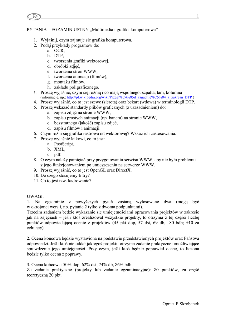 1 PYTANIA – EGZAMIN USTNY „Multimedia i grafika komputerowa” 1. Wyjaśnij, czym zajmuje się grafika komputerowa. 2. Podaj przykłady programów do: a. OCR, b. DTP, c. tworzenia grafiki wektorowej, d. obróbki zdjęć, e. tworzenia stron WWW, f. tworzenia animacji (filmów), g. montaŜu filmów, h. zakładu poligraficznego. 3. Proszę wyjaśnić, czym się róŜnią i co mają wspólnego: szpalta, łam, kolumna (informacje, np.: http://pl.wikipedia.org/wiki/Przegl%C4%85d_zagadnie%C5%84_z_zakresu_DTP ) 4. Proszę wyjaśnić, co to jest szewc (sierota) oraz bękart (wdowa) w terminologii DTP. 5. Proszę wskazać standardy plików graficznych (z uzasadnieniem) do: a. zapisu zdjęć na stronie WWW, b. zapisu prostych animacji (np. banera) na stronie WWW, c. bezstratnego (jakość) zapisu zdjęć, d. zapisu filmów i animacji. 6. Czym róŜni się grafika rastrowa od wektorowej? WskaŜ ich zastosowania. 7. Proszę wyjaśnić laikowi, co to jest: a. PostScript, b. XML, c. pdf. 8. O czym naleŜy pamiętać przy przygotowaniu serwisu WWW, aby nie było problemu z jego funkcjonowaniem po umieszczeniu na serwerze WWW. 9. Proszę wyjaśnić, co to jest OpenGL oraz DirectX. 10. Do czego stosujemy filtry? 11. Co to jest tzw. kadrowanie? UWAGI: 1. Na egzaminie z powyŜszych pytań zostaną wylosowane dwa (mogą być w okrojonej wersji, np. pytanie 2 tylko z dwoma podpunktami). Trzecim zadaniem będzie wykazanie się umiejętnościami opracowania projektów w zakresie jak na zajęciach – jeśli ktoś zrealizował wszystkie projekty, to otrzyma z tej części liczbę punktów odpowiadającą ocenie z projektów (45 pkt dop, 57 dst, 69 db, 80 bdb; +10 za celujący). 2. Ocena końcowa będzie wystawiona na podstawie przedstawionych projektów oraz Państwa odpowiedzi. Jeśli ktoś nie oddał jakiegoś projektu otrzyma zadanie praktyczne umoŜliwiające sprawdzenie jego umiejętności. Przy czym, jeśli ktoś będzie poprawiał ocenę, to liczona będzie tylko ocena z poprawy. 3. Ocena końcowa: 50% dop, 62% dst, 74% db, 86% bdb Za zadania praktyczne (projekty lub zadanie egzaminacyjne): 80 punktów, za część teoretyczną 20 pkt. Oprac. P.Skrobanek