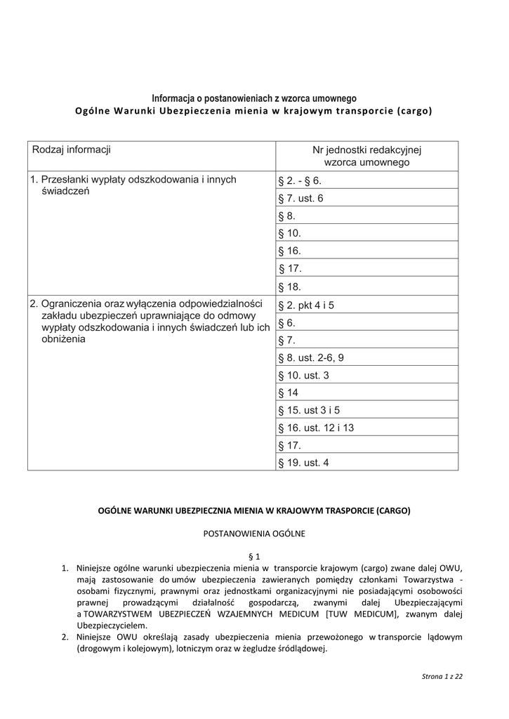 Informacja o postanowieniach z wzorca umownego Ogólne Warunki Ubezpieczenia mienia w krajowym transporcie (cargo) Rodzaj informacji Nr jednostki redakcyjnej wzorca umownego 1. Przesłanki wypłaty odszkodowania i innych świadczeń § 2. - § 6. § 7. ust. 6 § 8. § 10. § 16. § 17. § 18. 2. Ograniczenia oraz wyłączenia odpowiedzialności § 2. pkt 4 i 5 zakładu ubezpieczeń uprawniające do odmowy wypłaty odszkodowania i innych świadczeń lub ich § 6. obniżenia § 7. § 8. ust. 2-6, 9 § 10. ust. 3 § 14 § 15. ust 3 i 5 § 16. ust. 12 i 13 § 17. § 19. ust. 4 OGÓLNE WARUNKI UBEZPIECZNIA MIENIA W KRAJOWYM TRASPORCIE (CARGO) POSTANOWIENIA OGÓLNE §1 1. Niniejsze ogólne warunki ubezpieczenia mienia w transporcie krajowym (cargo) zwane dalej OWU, mają zastosowanie do umów ubezpieczenia zawieranych pomiędzy członkami Towarzystwa osobami fizycznymi, prawnymi oraz jednostkami organizacyjnymi nie posiadającymi osobowości prawnej prowadzącymi działalność gospodarczą, zwanymi dalej Ubezpieczającymi a TOWARZYSTWEM UBEZPIECZEŃ WZAJEMNYCH MEDICUM [TUW MEDICUM], zwanym dalej Ubezpieczycielem. 2. Niniejsze OWU określają zasady ubezpieczenia mienia przewożonego w transporcie lądowym (drogowym i kolejowym), lotniczym oraz w żegludze śródlądowej. Strona 1 z 22 3. Umowę ubezpieczenia można zawrzeć także na cudzy rachunek, z tym że Ubezpieczony imiennie wskazany jest w umowie lub też w zależności od rodzaju zawartej umowy Ubezpieczenia nie jest wskazany w umowie. Zarzuty mające wpływ na odpowiedzialność Ubezpieczyciela może on podnieść także przeciwko Ubezpieczonemu. 4. W razie zawarcia umowy ubezpieczenia na cudzy rachunek postanowienia niniejszych OWU stosuje się odpowiednio do osoby, na której rachunek zawarto umowę ubezpieczenia, z zastrzeżeniem, że roszczenie o zapłatę składki przysługuje wyłącznie przeciwko Ubezpieczającemu. 5. Za porozumieniem stron, do umowy ubezpieczenia mogą być wprowadzone postanowienia odmienne od ustalonych w niniejszych OWU, w szczególności zakres ubezpieczenia przewidziany postanowieniami OWU może zostać zmodyfikowany na podstawie odpowiednich klauzul i warunków dodatkowych. 6. Warunki odbiegające od postanowień niniejszych OWU ustala się w formie pisemnej pod rygorem nieważności. 7. Wszystkie zmiany umowy ubezpieczenia muszą być, pod rygorem ich nieważności, sporządzone na piśmie w formie aneksu do umowy ubezpieczenia. DEFINICJE §2 W rozumieniu niniejszych OWU poniższe określenia, użyte w OWU lub wniosku o zawarcie umowy ubezpieczenia, polisie, innym dokumencie potwierdzającym zawarcie umowy ubezpieczenia, a także innych pismach i oświadczeniach składanych w związku z umową ubezpieczenia, oznaczają: 1. Akty terroru – nielegalne działania i akcje organizowane z pobudek ideologicznych, politycznych lub społecznych, indywidualne lub grupowe, prowadzone przez osoby działające samodzielnie lub na rzecz bądź z ramienia jakiejkolwiek organizacji lub rządu, skierowane przeciwko osobom, obiektom lub społeczeństwu, mające na celu wywarcie wpływu na rząd, wprowadzenie chaosu, zastraszenie ludności i dezorganizację życia publicznego przy użyciu przemocy lub groźby użycia przemocy; 2. Deszcz nawalny – opad deszczu, potwierdzony przez Instytut Meteorologii i Gospodarki Wodnej (IMiGW), o współczynniku wydajności co najmniej 4 (cztery) według stosowanej przez IMiGW skali. W przypadku braku możliwości uzyskania opinii IMiGW, bierze się pod uwagę stan faktyczny i rozmiar szkód w miejscu ubezpieczenia, świadczące o działaniu deszczu nawalnego; 3. Dokument przewozowy – list przewozowy lub inny dokument przewozowy, posiadający cechy listu przewozowego; 4. Franszyza integralna – kwota, do wysokości której Ubezpieczyciel nie ponosi odpowiedzialności, o ile wartość szkody nie przekracza tej kwoty; 5. Franszyza redukcyjna – ustalona w umowie ubezpieczenia wartość wyrażona procentowo lub kwotowo, pomniejszająca łączne odszkodowanie za wszystkie szkody wynikłe z jednego zdarzenia; 6. Grad – opad atmosferyczny składający się z bryłek lodu; 7. Handel obwoźny (obnośny) – sprzedaż detaliczna towarów z samochodu lub innego pojazdu, walizy, kosza, skrzyni; 8. Huragan – działanie wiatru o prędkości nie mniejszej niż 17,5 m/s, wyrządzającego masowe szkody, potwierdzone przez Instytut Meteorologii i Gospodarki Wodnej (IMiGW). W przypadku braku możliwości uzyskania opinii IMiGW, bierze się pod uwagę stan faktyczny i rozmiar szkód w miejscu ubezpieczenia, świadczące o działaniu huraganu; 9. Jeden środek transportu: – pojazd drogowy z naczepą lub przyczepą, – samolot, – zestaw wagonów kolejowych (skład), – barka lub zespół barek, które są ze sobą połączone, – statek. Strona 2 z 22 10. Jednostkowa umowa ubezpieczenia – ubezpieczenie ściśle określonego rodzaju mienia, w pojedynczym transporcie, na określonej trasie przewozu. Umowę ubezpieczenia według polisy jednostkowej zawiera się na czas trwania przewozu mienia; 11. Komisarz awaryjny – niezależny rzeczoznawca upoważniony przez Ubezpieczyciela do likwidacji szkody; 12. Kradzież z włamaniem – zabór mienia przez sprawcę w następstwie usunięcia – za pomocą użycia siły i narzędzi – zabezpieczenia (przeszkody materialnej), będącego częścią konstrukcji środka transportu lub specjalnym jego zamknięciem bądź zabezpieczeniem, utrudniającym dostęp do jego wnętrza lub zdjęcie przewożonego mienia; za kradzież z włamaniem uważa się również zabór mienia przez sprawcę z jednoczesnym dokonaniem zaboru środka transportu lub jego czasowym zawłaszczeniem; 13. Lawina – gwałtowne zsuwanie się lub staczanie mas śniegu, lodu, skał, kamieni, ziemi lub błota ze zboczy górskich; 14. Mienie – przedmiot ubezpieczenia określony w umowie ubezpieczenia (ładunek, towar, przesyłka towarowa, rzeczy przyjęte do przewozu), przewożony na 