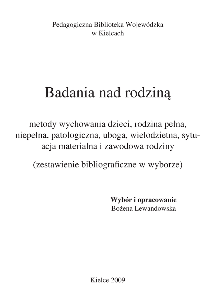 Pedagogiczna Biblioteka Wojewódzka w Kielcach Badania nad rodziną metody wychowania dzieci, rodzina pełna, niepełna, patologiczna, uboga, wielodzietna, sytuacja materialna i zawodowa rodziny (zestawienie bibliograficzne w wyborze) Wybór i opracowanie Bożena Lewandowska Kielce 2009 2 Metody wychowania – badania 1. Bryłka, Róża : Wpływ rodziny na powstawanie agresji u dzieci / Róża Bryłka // „Problemy Opiekuńczo-Wychowawcze”. – 2000, nr 9, s. 47-50 [Analiza wyników badań] Czytelnia Pedagogicznej Biblioteki Wojewódzkiej 2. Olubiński, Andrzej : Przemoc jako norma stosunków społeczno-wychowawczych / Andrzej Olubiński // „Wychowanie na co Dzień”. – 1996, nr 4/5, s. 3-6 Czytelnia Pedagogicznej Biblioteki Wojewódzkiej 3. Jak postępować z dziećmi : z badań CBOS : podsumowanie badań // „Problemy Opiekuńczo-Wychowawcze”. – 1995, nr 1, s. 13-15 Czytelnia Pedagogicznej Biblioteki Wojewódzkiej 4. Janukowicz, Maria : Kochani i ośmieszani / Maria Janukowicz // „Wychowanie na co Dzień”. – 2004, nr 4/5, s. 13-15 Czytelnia Pedagogicznej Biblioteki Wojewódzkiej 5. Korycka, Anna : Nagroda i kara w wychowaniu / Anna Korycka // „Nowa Szkoła”. – 2003, nr 8, s. 59-60 Czytelnia Pedagogicznej Biblioteki Wojewódzkiej 6. Kromolicka, Barbara : Przystosowanie szkolne uczniów z rodzin zrekonstruowanych / Barbara Kromolicka // „Problemy Rodziny”. – 1998, nr 1, s. 46-49 [Oddziaływanie wychowawcze w rodzinie. Omówienie badań] Czytelnia Pedagogicznej Biblioteki Wojewódzkiej 7. Kupisiewicz, Małgorzata : Pieniądze w procesie wychowania w rodzinie – badania nad dziecięcymi umiejętnościami dysponowania kieszonkowym / Małgorzata Kupisiewicz // „Kwartalnik Pedagogiczny”. – 2003, nr 3, s. 147-172. – Bibliogr. Czytelnia Pedagogicznej Biblioteki Wojewódzkiej 3 8. Pielkowa, Józefa Anna : Wychowanie dziecka w rodzinie nauczycielskiej / Józefa Anna Pielkowa // „Roczniki Socjologii Rodziny”. – 2001, t. 13, s. 127-136. – Bibliogr. [Omówienie badań] 9. Pietrzyk, Agnieszka : Style wychowania dzieci w polskich rodzinach ubogich i zamożnych : podobieństwa i różnice / Agnieszka Pietrzyk // „Problemy Rodziny”. – 2001, nr 2, s. 29-34 Czytelnia Pedagogicznej Biblioteki Wojewódzkiej 10. Sztuka, Mariusz : Akceptacja wartości w środowisku rodzin „problemowych” : wyniki badań / Mariusz Sztuka // „Opieka – Wychowanie – Terapia”. – 1993, nr 4, s. 30-36 Czytelnia Pedagogicznej Biblioteki Wojewódzkiej Rodzina (pełna, niepełna, patologiczna, uboga, wielodzietna) – badania 11. Bałandynowicz, Andrzej : Środowisko rodzinne a zachowania dewiacyjne dzieci i młodzieży / Andrzej Bałandynowicz // „Problemy Alkoholizmu”. – 2005, nr 1, s. 4-12. – Bibliogr. [Badania nad przestępczością. Postawy rodzicielskie, czynniki zewnętrzne (np. sąsiedztwo) sprzyjające niewłaściwej socjalizacji dziecka] Czytelnia Pedagogicznej Biblioteki Wojewódzkiej 12. Balcerzak-Paradowska Bożena : Sytuacja materialna młodych rodzin w Polsce (badania) / Bożena Balcerzak-Paradowska // „Problemy Rodziny”. – 1993, nr 4, s. 33-36 Czytelnia Pedagogicznej Biblioteki Wojewódzkiej 13. Brągiel, Józefa : Pozycja dziecka z rodziny niepełnej w grupie rówieśniczej / Józefa Brągiel // „Wychowanie w Przedszkolu”. – 1992, nr 3, s. 131-136 [Na podstawie badań] Czytelnia Pedagogicznej Biblioteki Wojewódzkiej 4 14. Czyżewska, Monika : Jak pracownicy szkoły opisują krzywdzenie dzieci ? : badania praskie / Monika Czyżewska // „Niebieska Linia”. – 2008, nr 1, s. 22-25 [Fragmenty badań dotyczących postaw pracowników szkoły wobec przemocy doświadczanej przez uczniów w rodzinie] Czytelnia Pedagogicznej Biblioteki Wojewódzkiej 15. Daszyńska, Maria : Sytuacja bytowa rodzin : tendencje zmian / Maria Daszyńska // „Polityka Społeczna”. – 2002, nr 4, s. 14-18 [Rodzina polska w latach 1998-2000 – omówienie badań] Czytelnia Pedagogicznej Biblioteki Wojewódzkiej 16. Dykcik, Władysław : Odpowiedzialność rodzicielska matek i ojców samotnie wychowujących dzieci / Władysław Dykcik // „Problemy Rodziny”. – 1992, nr 3, s. 18-21 [Na podstawie badań] Czytelnia Pedagogicznej Biblioteki Wojewódzkiej 17. Fojcik, Małgorzata : Dziecko a migracja zarobkowa rodziców / Małgorzata Fojcik // „Życie Szkoły”. – 2007, nr 7, s. 12-15. – Bibliogr. [Wpływ migracji zarobkowej jednego z rodziców (najczęściej ojca) na życie rodziny. Sposoby zapobiegania negatywnym skutkom rozłąki, ich wpływ na przygotowanie dzieci do życia rodzinnego w dorosłym wieku. Badania przeprowadzone wśród rodzin czasowo niepełnych] Czytelnia Pedagogicznej Biblioteki Wojewódzkiej 18. Graniewska, Danuta : Praca a rodzina / Danuta Graniewska // „Polityka Społeczna”. – 2007, nr 8, s. 19-21. – Bibliogr. [Realizacja funkcji rodziny w aspekcie materialnych warunków bytowania – badania socjologiczne] Czytelnia Pedagogicznej Biblioteki Wojewódzkiej 5 19. Kotlarska-Michalska, Anna : Więź w rodzinach wielodzietnych / Anna Kotlarska-Michalska // „Roczniki Socjologii Rodziny”. – 2002, t. 14, s. [57]-70. – Bibliogr. [Więź rodzinna i jej wskaźniki. Więź socjalizacyjno-wychowawcza, kulturalna i małżeńska w rodzinach wielodzietnych] 20. Kowalczyk-Szymańska, Mirosłąwa : O badaniach zagrożeń dla przebiegu procesu wychowania we współczesnej rodzinie polskiej w konfrontacji z rzeczywistością wychowawczą / Mirosława Kowalczyk-Szymańska // „Rocznik Edukacji Alternatywnej”. – 2006, [nr] 1, s. 17-33 [Proces wychowania dziecka. Rzeczywistość a opinie – zagadnienia metodologiczne. Zagrożenia dla przebiegu procesu wychowania – opinie badanych] 21. Łukasik, Izabella : Dyscyplinowanie dzieci przez samotne matki / Izabella Łukasik // „Problemy Rodziny”. – 2001, nr 3, s. 48-[51] [Omówienie badań] Czytelnia Pedagogicznej Biblioteki Wojewódzkiej 22. Marzec, Helena : Psychospołeczne aspe