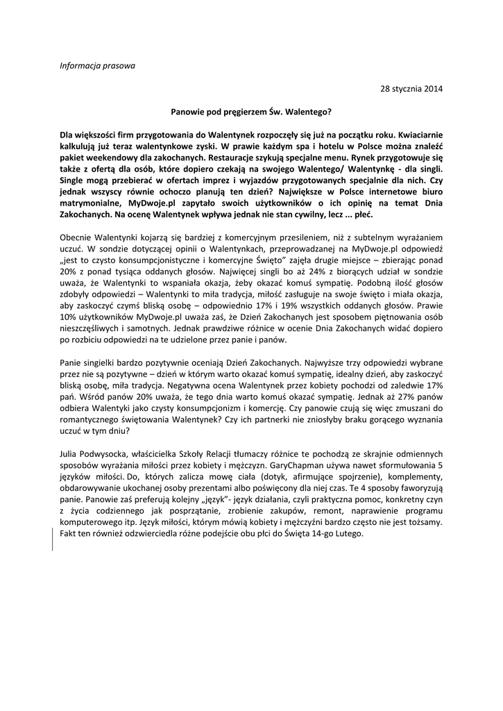 Informacja prasowa 28 stycznia 2014 Panowie pod pręgierzem Św. Walentego? Dla większości firm przygotowania do Walentynek rozpoczęły się już na początku roku. Kwiaciarnie kalkulują już teraz walentynkowe zyski. W prawie każdym spa i hotelu w Polsce można znaleźć pakiet weekendowy dla zakochanych. Restauracje szykują specjalne menu. Rynek przygotowuje się także z ofertą dla osób, które dopiero czekają na swojego Walentego/ Walentynkę - dla singli. Single mogą przebierać w ofertach imprez i wyjazdów przygotowanych specjalnie dla nich. Czy jednak wszyscy równie ochoczo planują ten dzień? Największe w Polsce internetowe biuro matrymonialne, MyDwoje.pl zapytało swoich użytkowników o ich opinię na temat Dnia Zakochanych. Na ocenę Walentynek wpływa jednak nie stan cywilny, lecz ... płeć. Obecnie Walentynki kojarzą się bardziej z komercyjnym przesileniem, niż z subtelnym wyrażaniem uczuć. W sondzie dotyczącej opinii o Walentynkach, przeprowadzanej na MyDwoje.pl odpowiedź „jest to czysto konsumpcjonistyczne i komercyjne Święto” zajęła drugie miejsce – zbierając ponad 20% z ponad tysiąca oddanych głosów. Najwięcej singli bo aż 24% z biorących udział w sondzie uważa, że Walentynki to wspaniała okazja, żeby okazać komuś sympatię. Podobną ilość głosów zdobyły odpowiedzi – Walentynki to miła tradycja, miłość zasługuje na swoje święto i miała okazja, aby zaskoczyć czymś bliską osobę – odpowiednio 17% i 19% wszystkich oddanych głosów. Prawie 10% użytkowników MyDwoje.pl uważa zaś, że Dzień Zakochanych jest sposobem piętnowania osób nieszczęśliwych i samotnych. Jednak prawdziwe różnice w ocenie Dnia Zakochanych widać dopiero po rozbiciu odpowiedzi na te udzielone przez panie i panów. Panie singielki bardzo pozytywnie oceniają Dzień Zakochanych. Najwyższe trzy odpowiedzi wybrane przez nie są pozytywne – dzień w którym warto okazać komuś sympatię, idealny dzień, aby zaskoczyć bliską osobę, miła tradycja. Negatywna ocena Walentynek przez kobiety pochodzi od zaledwie 17% pań. Wśród panów 20% uważa, że tego dnia warto komuś okazać sympatię. Jednak aż 27% panów odbiera Walentyki jako czysty konsumpcjonizm i komercję. Czy panowie czują się więc zmuszani do romantycznego świętowania Walentynek? Czy ich partnerki nie zniosłyby braku gorącego wyznania uczuć w tym dniu? Julia Podwysocka, właścicielka Szkoły Relacji tłumaczy różnice te pochodzą ze skrajnie odmiennych sposobów wyrażania miłości przez kobiety i mężczyzn. GaryChapman używa nawet sformułowania 5 języków miłości. Do, których zalicza mowę ciała (dotyk, afirmujące spojrzenie), komplementy, obdarowywanie ukochanej osoby prezentami albo poświęcony dla niej czas. Te 4 sposoby faworyzują panie. Panowie zaś preferują kolejny „język”- język działania, czyli praktyczna pomoc, konkretny czyn z życia codziennego jak posprzątanie, zrobienie zakupów, remont, naprawienie programu komputerowego itp. Język miłości, którym mówią kobiety i mężczyźni bardzo często nie jest tożsamy. Fakt ten również odzwierciedla różne podejście obu płci do Święta 14-go Lutego. Wyniki Sondy z MyDwoje.pl przeprowadzonej w dniach 1.-31.01.2014 Więcej informacji: Magdalena Nahurska, Tel. Kom.: 887 79 09 15 [email protected]
