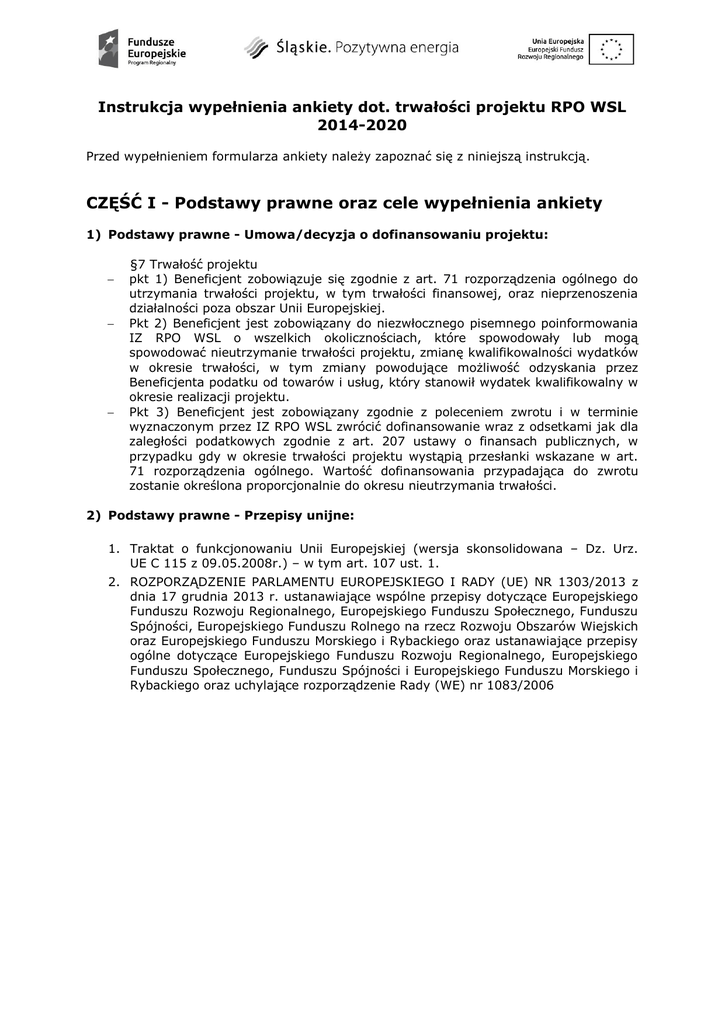 Instrukcja wypełnienia ankiety dot. trwałości projektu RPO WSL 2014-2020 Przed wypełnieniem formularza ankiety należy zapoznać się z niniejszą instrukcją. CZĘŚĆ I - Podstawy prawne oraz cele wypełnienia ankiety 1) Podstawy prawne - Umowa/decyzja o dofinansowaniu projektu: §7 Trwałość projektu pkt 1) Beneficjent zobowiązuje się zgodnie z art. 71 rozporządzenia ogólnego do utrzymania trwałości projektu, w tym trwałości finansowej, oraz nieprzenoszenia działalności poza obszar Unii Europejskiej. Pkt 2) Beneficjent jest zobowiązany do niezwłocznego pisemnego poinformowania IZ RPO WSL o wszelkich okolicznościach, które spowodowały lub mogą spowodować nieutrzymanie trwałości projektu, zmianę kwalifikowalności wydatków w okresie trwałości, w tym zmiany powodujące możliwość odzyskania przez Beneficjenta podatku od towarów i usług, który stanowił wydatek kwalifikowalny w okresie realizacji projektu. Pkt 3) Beneficjent jest zobowiązany zgodnie z poleceniem zwrotu i w terminie wyznaczonym przez IZ RPO WSL zwrócić dofinansowanie wraz z odsetkami jak dla zaległości podatkowych zgodnie z art. 207 ustawy o finansach publicznych, w przypadku gdy w okresie trwałości projektu wystąpią przesłanki wskazane w art. 71 rozporządzenia ogólnego. Wartość dofinansowania przypadająca do zwrotu zostanie określona proporcjonalnie do okresu nieutrzymania trwałości. 2) Podstawy prawne - Przepisy unijne: 1. Traktat o funkcjonowaniu Unii Europejskiej (wersja skonsolidowana – Dz. Urz. UE C 115 z 09.05.2008r.) – w tym art. 107 ust. 1. 2. ROZPORZĄDZENIE PARLAMENTU EUROPEJSKIEGO I RADY (UE) NR 1303/2013 z dnia 17 grudnia 2013 r. ustanawiające wspólne przepisy dotyczące Europejskiego Funduszu Rozwoju Regionalnego, Europejskiego Funduszu Społecznego, Funduszu Spójności, Europejskiego Funduszu Rolnego na rzecz Rozwoju Obszarów Wiejskich oraz Europejskiego Funduszu Morskiego i Rybackiego oraz ustanawiające przepisy ogólne dotyczące Europejskiego Funduszu Rozwoju Regionalnego, Europejskiego Funduszu Społecznego, Funduszu Spójności i Europejskiego Funduszu Morskiego i Rybackiego oraz uchylające rozporządzenie Rady (WE) nr 1083/2006 3) Podstawy prawne - Przepisy krajowe: 1. ustawy z dnia 27 sierpnia 2009 r. o finansach publicznych (tekst jednolity: Dz. U. z 2013 r. poz. 885 z późn. zm.); 2. Ustawa z dnia 29 stycznia 2004 r. Prawo zamówień Publicznych, (Dz. U. z 2013 r. poz. 907 z późn. zm.). 4) Pojęcie trwałości projektu oraz informacja dot. rozpoczęcia biegu terminu trwałości projektu Instytucja Zarządzająca RPO WSL zapewnia oraz monitoruje, w okresie trwałości, tj. w okresie co najmniej 5 lat od daty zakończenia projektu 1, iż: Utrzymane zostały założone cele i rezultaty projektu; Projekt nie został poddany zasadniczej modyfikacji w rozumieniu art. 71 rozporządzenia Rady (WE) nr 1303/2013 W przypadku gdy nie było możliwości obiektywnego oszacowania dochodu z wyprzedzeniem, czy dochód wygenerowany w okresie pięciu lat od zakończenia projektu został odliczony od wydatków zadeklarowanych Komisji Europejskiej; Beneficjent wywiązał się z obowiązków nałożonych w umowie o dofinansowanie, m.in. w zakresie użytkowania i wymiany sprzętu ruchomego, informowania o dofinansowaniu ze środków UE, przechowywania i archiwizacji dokumentów. Beneficjent jest zobowiązany zgodnie z poleceniem zwrotu i w terminie wyznaczonym przez IZ RPO WSL zwrócić dofinansowanie wraz z odsetkami jak dla zaległości podatkowych zgodnie z art. 207 ustawy o finansach publicznych, w przypadku gdy w okresie trwałości projektu wystąpią przesłanki wskazane w art. 71 rozporządzenia ogólnego. Wartość dofinansowania przypadająca do zwrotu zostanie określona proporcjonalnie do okresu nieutrzymania trwałości. Procedury monitorowania dochodu generowanego przez projekty, po zakończeniu ich realizacji dostarczają w szczególności informacji na temat: czy w ramach projektu pojawiły się inne lub nowe źródła przychodów, które nie zostały wzięte pod uwagę w analizie sporządzanej na etapie wniosku o dofinansowanie przy obliczaniu luki w finansowaniu, a które spełniają przesłanki przychodów, o których mowa w art. 61 rozporządzenia Rady (WE) nr 1303/2013 oraz czy od momentu przyznania dofinansowania nastąpiły istotne zmiany w stosowanej dotychczas przez Beneficjenta polityce taryfowej. Monitorowanie projektów w okresie trwałości projektów uzupełniane jest prowadzeniem kontroli trwałości projektów. 5) Cele ankiety, częstotliwość składania Celem ankiety jest sprawdzenie utrzymania trwałości projektu realizowanego w ramach RPO WSL na lata 2014-2020 pod kątem zgodności z zapisami umowy o dofinansowanie projektu oraz z obowiązującymi przepisami prawa. Beneficjenci RPO WSL zobowiązani są do składania ankiety w terminie wskazanym przez IZ RPO WSL - po otrzymaniu pisma wzywającego do uzupełnienia i dostarczenia ankiety. za datę zakończenia Projektu dla potrzeb trwałości Projektu, przyjmuje się dzień, w którym zostały spełnione łącznie wymienione kryteria: czynności w ramach Projektu zostały faktycznie przeprowadzone (zakończenie rzeczowe projektu) oraz wszystkie wydatki Beneficjenta oraz odnośnego wkładu publicznego zostały opłacone 1 str. 2 Ankieta skierowana jest do Beneficjentów, którzy zakończyli realizację projektu realizowanego na podstawie umowy o dofinansowanie projektu w ramach RPO WSL, za wyjątkiem: projektów Pomocy Technicznej, projektów nieinwestycyjnych projektów, z którymi rozwiązano umowę o dofinansowanie. W przypadku gdy Beneficjent: przedstawi informacje wskazujące na podejrzenie wystąpienia mogącego skutkować wystąpieniem nieprawidłowości, nie odpowie na skierowaną prośbę o wypełnienie ankiety, naruszenia może zostać przeprowadzona kontrola trwałości projektu. Projekty, dla których nie przedstawiono w ankietach informacji wskazujących na wyst