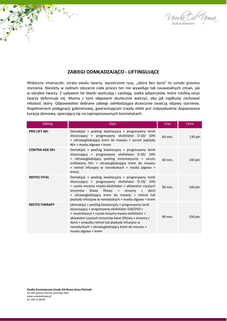 ZABIEGI ODMŁADZAJĄCO - LIFTINGUJĄCE Widoczne zmarszczki, utrata owalu twarzy, wyostrzone rysy, „skóra bez życia” to oznaki procesu starzenia. Niestety w żadnym obszarze ciała proces ten nie wywołuje tak zauważalnych zmian, jak w obrębie twarzy. Z upływem lat tkanki wiotczeją i zanikają, siatka adipocytów, które rzeźbią zarys twarzy deformuje się. Można z tymi objawami skutecznie walczyć, aby jak najdłużej zachować młodość skóry. Odpowiednio dobrane zabiegi odmładzające skutecznie zwalczą objawy starzenia. Dopełnieniem pielęgnacji gabinetowej, gwarantującym trwały efekt jest indywidualnie dopasowana kuracja domowa, opierająca się na zaproponowanych kosmetykach. Zabieg PRO LIFT 40+ CONTRA AGE 50+ REFITO VITAL REFITO THERAPY Opis Demakijaż + peeling kawitacyjny + progresywny tonik złuszczający + progresywny eksfoliator D-10/ 10% + ultrawygładzający krem do masażu + serum peptydy 40+ + maska algowa + krem Demakijaż + peeling kawitacyjny + progresywny tonik złuszczający + progresywny eksfoliator D-10/ 10% + ultrawygładzający peeling enzymatyczny + serum izoflawony 50+ + ultrawygładzający krem do masażu + retinol infuzyjny w nanodyskach + maska algowa + krem) Demakijaż + peeling kawitacyjny + progresywny tonik złuszczający + progresywny eksfoliator D-10/ 10% + czyste enzymy maska-eksfoliator + aktywator czystych enzymów (kwas fitowy + enzymy z dyni) + ultrawygładzający krem do masażu + retinol lub peptydy infuzyjne w nanodyskach + maska algowa + krem (demakijaż + peeling kawitacyjny + progresywny tonik złuszczający + progresywny eksfoliator D30/D50 + + neutralizacja + czyste enzymy maska eksfoliator + aktywator czystych enzymów kwas (fitowy + enzymy z dyni) + ampułka retinol lub peptydy infuzyjne w nanodyskach + ultrawygładzający krem do masażu + maska algowa + krem Studio Kosmetyczne Uroda Od Nowa Anna Pietrzyk 43-140 Lędziny Zawiszy Czarnego 28/a www.urodaodnowa.pl tel. 693 72 88 00 Czas Cena 60 min. 130 pln 60 min. 140 pln 90 min. 140 pln 90 min. 150 pln