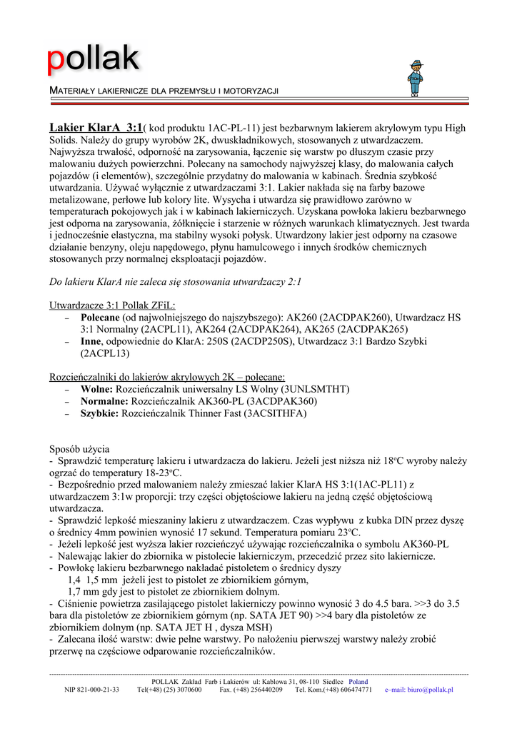 MATERIAŁY LAKIERNICZE DLA PRZEMYSŁU I MOTORYZACJI Lakier KlarA 3:1( kod produktu 1AC-PL-11) jest bezbarwnym lakierem akrylowym typu High Solids. Należy do grupy wyrobów 2K, dwuskładnikowych, stosowanych z utwardzaczem. Najwyższa trwałość, odporność na zarysowania, łączenie się warstw po dłuszym czasie przy malowaniu dużych powierzchni. Polecany na samochody najwyższej klasy, do malowania całych pojazdów (i elementów), szczególnie przydatny do malowania w kabinach. Średnia szybkość utwardzania. Używać wyłącznie z utwardzaczami 3:1. Lakier nakłada się na farby bazowe metalizowane, perłowe lub kolory lite. Wysycha i utwardza się prawidłowo zarówno w temperaturach pokojowych jak i w kabinach lakierniczych. Uzyskana powłoka lakieru bezbarwnego jest odporna na zarysowania, żółknięcie i starzenie w różnych warunkach klimatycznych. Jest twarda i jednocześnie elastyczna, ma stabilny wysoki połysk. Utwardzony lakier jest odporny na czasowe działanie benzyny, oleju napędowego, płynu hamulcowego i innych środków chemicznych stosowanych przy normalnej eksploatacji pojazdów. Do lakieru KlarA nie zaleca się stosowania utwardzaczy 2:1 Utwardzacze 3:1 Pollak ZFiL: – Polecane (od najwolniejszego do najszybszego): AK260 (2ACDPAK260), Utwardzacz HS 3:1 Normalny (2ACPL11), AK264 (2ACDPAK264), AK265 (2ACDPAK265) – Inne, odpowiednie do KlarA: 250S (2ACDP250S), Utwardzacz 3:1 Bardzo Szybki (2ACPL13) Rozcieńczalniki do lakierów akrylowych 2K – polecane: – Wolne: Rozcieńczalnik uniwersalny LS Wolny (3UNLSMTHT) – Normalne: Rozcieńczalnik AK360-PL (3ACDPAK360) – Szybkie: Rozcieńczalnik Thinner Fast (3ACSITHFA) Sposób użycia - Sprawdzić temperaturę lakieru i utwardzacza do lakieru. Jeżeli jest niższa niż 18oC wyroby należy ogrzać do temperatury 18-23oC. - Bezpośrednio przed malowaniem należy zmieszać lakier KlarA HS 3:1(1AC-PL11) z utwardzaczem 3:1w proporcji: trzy części objętościowe lakieru na jedną część objętościową utwardzacza. - Sprawdzić lepkość mieszaniny lakieru z utwardzaczem. Czas wypływu z kubka DIN przez dyszę o średnicy 4mm powinien wynosić 17 sekund. Temperatura pomiaru 23oC. - Jeżeli lepkość jest wyższa lakier rozcieńczyć używając rozcieńczalnika o symbolu AK360-PL - Nalewając lakier do zbiornika w pistolecie lakierniczym, przecedzić przez sito lakiernicze. - Powłokę lakieru bezbarwnego nakładać pistoletem o średnicy dyszy 1,4 1,5 mm jeżeli jest to pistolet ze zbiornikiem górnym, 1,7 mm gdy jest to pistolet ze zbiornikiem dolnym. - Ciśnienie powietrza zasilającego pistolet lakierniczy powinno wynosić 3 do 4.5 bara. >>3 do 3.5 bara dla pistoletów ze zbiornikiem górnym (np. SATA JET 90) >>4 bary dla pistoletów ze zbiornikiem dolnym (np. SATA JET H , dysza MSH) - Zalecana ilość warstw: dwie pełne warstwy. Po nałożeniu pierwszej warstwy należy zrobić przerwę na częściowe odparowanie rozcieńczalników. --------------------------------------------------------------------------------------------------------------------------------------------------------------------------------------POLLAK Zakład Farb i Lakierów ul: Kablowa 31, 08-110 Siedlce Poland NIP 821-000-21-33 Tel(+48) (25) 3070600 Fax. (+48) 256440209 Tel. Kom.(+48) 606474771 e–mail: [email protected] MATERIAŁY LAKIERNICZE DLA MOTORYZACJI - Najlepsze wyniki uzyskuje się, jeżeli lakier zostanie zużyty w czasie pierwszych 30 minut po zmieszaniu z utwardzaczem. Po upływie tego czasu, a w szczególności w wysokich temperaturach należy ponownie skorygować lepkość za pomocą rozcieńczalnika do 17s DIN4. - Przed montażem detali nadwozia pojazdu malowane elementy pozostawić na 8-12 godzin w temperaturze pokojowej lub wygrzewać w kabinie lakierniczej około 30 minut, licząc czas od osiągnięcia temperatury 60oC elementów blaszanych nadwozia. Zamiast wygrzewania w kabinie możliwe jest stosowanie promienników podczerwieni. NIP 821-000-21-33 POLLAK Zakład Farb i Lakierów ul: Kablowa 31, 08-110 Siedlce Poland Tel(+48) (25) 3070600 Fax. (+48) 256440209 Tel. Kom.(+48) 606474771 e–mail: [email protected]