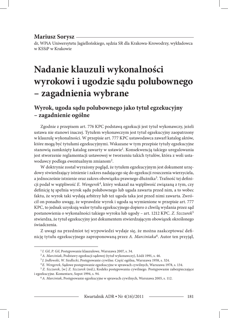 Mariusz Sorysz dr, WPiA Uniwersytetu Jagiellońskiego, sędzia SR dla Krakowa-Krowodrzy, wykładowca w KSSiP w Krakowie Nadanie klauzuli wykonalności wyrokowi i ugodzie sądu polubownego – zagadnienia wybrane Wyrok, ugoda sądu polubownego jako tytuł egzekucyjny – zagadnienie ogólne Zgodnie z przepisem art. 776 KPC podstawą egzekucji jest tytuł wykonawczy, jeżeli ustawa nie stanowi inaczej. Tytułem wykonawczym jest tytuł egzekucyjny zaopatrzony w klauzulę wykonalności. W przepisie art. 777 KPC ustawodawca zawarł katalog aktów, które mogą być tytułami egzekucyjnymi. Wskazane w tym przepisie tytuły egzekucyjne stanowią zamknięty katalog zawarty w ustawie1. Konsekwencją takiego uregulowania jest stworzenie reglamentacji ustawowej w tworzeniu takich tytułów, która z woli ustawodawcy podlega ewentualnym zmianom2. W doktrynie został wyrażony pogląd, że tytułem egzekucyjnym jest dokument urzędowy stwierdzający istnienie i zakres nadającego się do egzekucji roszczenia wierzyciela, a jednocześnie istnienie oraz zakres obowiązku prawnego dłużnika3. Trafność tej definicji podał w wątpliwość E. Wengerek4, który wskazał na wątpliwość związaną z tym, czy definicję tę spełnia wyrok sądu polubownego lub ugada zawarta przed nim, a to wobec faktu, że wyrok taki wydają arbitrzy lub też ugoda taka jest przed nimi zawarta. Zwrócił on ponadto uwagę, że wprawdzie wyrok i ugoda są wymienione w przepisie art. 777 KPC, to jednak uzyskują walor tytułu egzekucyjnego dopiero z chwilą wydania przez sąd postanowienia o wykonalności takiego wyroku lub ugody – art. 1212 KPC. Z. Szczurek5 stwierdza, że tytuł egzekucyjny jest dokumentem stwierdzającym obowiązek określonego świadczenia. Z uwagi na przedmiot tej wypowiedzi wydaje się, że można zaakceptować definicję tytułu egzekucyjnego zaproponowaną przez A. Marciniaka 6. Autor ten przyjął, 1 I. Gil, P. Gil, Postępowanie klauzulowe, Warszawa 2007, s. 34. Marciniak, Podstawy egzekucji sądowej (tytuł wykonawczy), Łódź 1991, s. 46. 3 J. Jodłowski, W. Siedlecki, Postępowanie cywilne. Część ogólna, Warszawa 1958, s. 324. 4 E. Wengerek, Sądowe postępowanie egzekucyjne w sprawach cywilnych, Warszawa 1978, s. 134. 5 Z. Szczurek, [w:] Z. Szczurek (red.), Kodeks postępowania cywilnego. Postępowanie zabezpieczające i egzekucyjne. Komentarz, Sopot 1994, s. 94. 6 A. Marciniak, Postępowanie egzekucyjne w sprawach cywilnych, Warszawa 2005, s. 112. 2 A. Kwartalnik ADR • Nr 4(16)/2011 181 Sorysz że t ytułem egzekucyjnym jest określony ustawowo akt prawny ustalający istnienie normy prawnej indywidualno-konkretnej o charakterze nakazującym lub zakazującym, niezbędny do przymusowego urzeczywistnienia tej normy w drodze egzekucji. Charakter prawny postępowania klauzulowego Na wstępie należy zastanowić się nad charakterem prawnym postępowania klauzulowego, ponieważ jego ustalenie ma istotne znaczenie z punktu widzenia zasad i wykładni dokonywanej w tym postępowaniu. W doktrynie zagadnienie to było przedmiotem wielu wypowiedzi. Dokonując analizy tych wypowiedzi, da się wyróżnić w tym względzie odmienne stanowiska. Można je podzielić na trzy grupy. Do pierwszej zaliczymy poglądy, zgodnie z którymi postępowanie klauzulowe jest częścią postępowania rozpoznawczego. Drugą grupę stanowią wypowiedzi zaliczające to postępowanie do części postępowania egzekucyjnego. Trzecia grupa przedstawicieli nauki uważa, że postępowanie to ma charakter samodzielny. Pierwsze stanowisko reprezentuje m.in. F. Kruszelnicki7, który uważał nadanie klauzuli wykonalności „za dalszy akt procesu”. Autor ten, uzasadniając swoją tezę, zwrócił uwagę na unormowanie właściwości sądu w postępowaniu o nadanie klauzuli wykonalności oraz na to, że wierzyciel mimo uzyskania takiego tytułu może zaniechać realizacji obowiązku stwierdzonego w tym tytule. Autor ten zwracał również uwagę, że postępowanie egzekucyjne rozpoczyna się dopiero z momentem złożenia wniosku o wszczęcie i przeprowadzenie egzekucji. Stanowisko to nie znalazło akceptacji w doktrynie. Jak to słusznie podkreślił M. Muliński8, postępowanie rozpoznawcze kończy się z chwilą uprawomocnienia się orzeczenia kończącego to postępowanie. Nie ulega wątpliwości, że do powstania tytułu egzekucyjnego może dojść z pominięciem postępowania rozpoznawczego, w ramach którego sąd rozstrzyga sprawę cywilną. Kodeks wprost wymienia tu takie tytuły jak akt notarialny – art. 777 § 1 pkt 4, 5, 6 KPC, bankowy tytuł egzekucyjny, ugoda zawarta przed geodetą – art. 34 ustawy – Prawo geodezyjne i kartograficzne. W literaturze międzywojennej nie eksponowano postępowania o nadanie klauzuli wykonalności, uznając, że stanowi ono integralną część postępowania egzekucyjnego9. Za przynależnością postępowania klauzulowego do postępowania egzekucyjnego wypowiedział się E. Wengerek. Stanął on na stanowisku, że w postępowaniu tym sąd nie podejmuje czynności procesowych, ale czynności wykonawcze10. Zdaniem tego autora sąd w postępowaniu o nadanie klauzuli wykonalności bada, czy przedstawiony dokument jest tytułem egzekucyjnym, któremu można nadać klauzulę wykonalności, na podstawie którego dopuszczalne 7 F. Kruszelnicki, Zarys systemu polskiego prawa egzekucyjnego i zabezpieczającego, Warszawa 1934, s. 78. 8 M. Muliński, Postępowanie o nadanie klauzuli wykonalności krajowemu tytułowi egzekucyjnemu, Warszawa 2005, s. 8. 9 M. Allerhand, Kodeks postępowania cywilnego. Część druga. Postępowanie egzekucyjne i zabezpieczające, Lwów 1933; J. Korzonek, Postępowanie egzekucyjne i zabezpieczające. Część druga kodeksu postępowania cywilnego, Kraków 1934. 10 E. Wengerek, Sądowe postępowanie egzekucyjne…, s. 83; tenże, Pojęcie, przedmiot i przesłanki postępowania egzekucyjnego zabezpieczającego, [w:] J. Jodłowski (red.), Wstęp do systemu prawa p