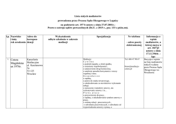 Lista stałych mediatorów prowadzona przez Prezesa Sądu Okręgowego w Legnicy na podstawie art. 157 b ustawy z dnia 27.07.2001r.Prawo o ustroju sądów powszechnych (Dz.U. z 2015 r., poz. 133 z późn.zm). l.p. Nazwisko Adres do i imię koresponrok urodzenia dencji 1. Cetera Magdalena ur.1976r. Kancelaria Mediacyjna ul. Kasztanowa 3a 53-125 Wrocław Wykształcenie odbyte szkolenia w zakresie mediacji Specjalizacja Nr telefonu - adres poczty elektronicznej Mediacje: C y w i l n e: o podział majątku ,o dział spadku, o zniesienie współwłasności , o ustanowienie drogi koniecznej, o ustalenie sposobu korzystania z rzeczy wspólnej i inne; G o s p o d a r c z e: o zapłatę, o prawo do znaku towarowego, o odszkodowanie za niewłaściwe wykonanie usługi; o naruszenie warunków umowy, nie wykonywanie umowy i in… P r a w a p r a c y: o przywrócenie do pracy , o zapłatę, o odszkodowanie tytułem umowy o pracę , o zmianę relacji pracowniczych , o odwołanie pracowniczych, o odwołanie od wypowiedzenia umowy o pracę, o Tel. 606 47 98 67 [email protected] Informacja o wpisie mediatorów, o której mowa w art. 1832§3 ustawy z dnia 17.11.1964r. kpc Decyzja o wpisie na listę mediatorów stałych wydana przez Prezesa Sądu Okręgowego we Wrocławiu wynagrodzenie i in. R o d z i n n e: o pojednanie o prawa opiekuńcze, o alimenty, o formę sprawowania opieki nad dzieckiem i in. 2. Czarniecki Leszek ur.1961r. 71-252 Technolog zbiorowego Szczecin Żywienia. ul. Unii Lubelskiej 17 B -Uniwersytet Wrocławski, Wydział Nauk 3. Gronowska 59-101 Społecznych- studia podyplomowe zawodu Bożena Sobin MEDIATOR; -Dolnośląska Szkoła Wyższa Edukacji, ur.1968r. ul. Pedagogiki-studia magisterskie Polkowicka Wydział PORADNICTWO PEDAGOGICZNE; 79a -Dolnośląska Szkoła Wyższa Edukacji, Tel. 500 555 000 Mediacje : - cywilne - karne i nieletnich - rodzinne - gospodarcze Tel. 795 526 925 Mediacje : -cywilne -rodzinne -gospodarcze -karne - z zakresu prawa pracy Tel. Wydział Pedagogiki Specjalnej – studia licencjackie RESOCJALIZACJA; -Wyższa Szkoła Handlowa we WrocławiuMANAGER WYŻSZEGO SZCZEBLA. 4. Fedorowska 53-329 Dorota Wrocław ur.1965r. Kancelaria Mediacyjna PRIMUM CONSNSUS Pl. Powstańców Śl. 17 a, pok.222 Decyzja o wpisie na listę stałych mediatorów wydana przez Prezesa Sądu Okręgowego w biuro@lcmmediacje. Szczecinie pl Mediacje : - cywilne - gospodarcze - karne Decyzja o wpisie na listę stałych mediatorów Bozena.gronowska@ wydana przez gmail.com Prezesa Sadu Okręgowego w Legnicy 602 124 560 mediacje@fedoro wska.pl Decyzja o wpisie na listę stałych mediatorów wydana przez Prezesa Sadu Okręgowego we Wrocławiu 5. JaworskaŚmietana Magdalena ur.1976r. Wykształcenie wyższe - Wydział Prawa i Mediacje: 67-200 Administracji Uniwersytetu im. - gospodarcze, Głogów A .Mickiewicza w Poznaniu; - karne, cywilne, StudiaPodypl._zarzadzania przedsiębiorstwem - rodzinne ul. Zarządzanie Wizerunkiem i - mediacje pracownicze,, Św. Jadwigi -kierunek Promocją Przedsięb. –Centrum Kształcenia -mediacje sprawach z umów ubezpieczenia, Śląskiej Kadr menedżerskich w Poznaniu; spory z udziałem konsumenta, Studia podyplomowe- Zarządzanie Zasobami - mediacje w sprawach o prawa autorskie i 31a Ludzkimi Centrum Kadr Menedżerskich w naruszenie własności intelektualnej. Poznaniu; - spory okołorozwodowe, Studia Podyplomowe -Prawo karne, skarbowe - spory sąsiedzkie, I Prawo gospodarcze –Uniwersytet - konfliktu społecznego i inne . Jagielloński w Krakowie Studia Podyplomowe –Master of Business Mediation-Mediator–Uniwersytet Ekonomiczny we Wrocławiu; Udział w konferencji z cyklu Arbitraż i Mediacja w teorii i praktyce ”Funkcjonowanie stałych sadów polubownych i ośrodków mediacyjnych, Sad Arbitrażowy przy Nowotomyskiej Izbie Gospodarczej; Współautorka publikacji „Mediacje Gospodarcze” pod red. A. Binsztoka Wydawnictwo Marina; Certyfikat udziału w konferencji Min. Sprawiedliwości pt. „Mediacja, rozmowa, zrozumienie, rozwiązanie; Udział w projekcie Fundacji Unii Regionalnych Centrów Mediacji w ramach projektu „Regionalne Centra Mediacji silne dla obywateli”-Mediacje-Palestra-Casusy; Profesjonalne warsztaty doskonalącosuperwizyjne dla mediatorów. 6. Maślikowska 52-234 Jolanta Wrocław ur.1967r. Kancelaria Mediacje: -gospodarcze /w tym spory międzynarodowe, budowlane, wykonanie usług, sprawy ubezpieczeniowe, Tel. 531 142 500 m. jaworska@ wp.pl Tel. 603 138 491 kancelaria@mediacje Decyzja o wpisie na listę stałych mediatorów wydana przez Prezesa Sądu Okręgowego w Legnicy Decyzja o wpisie na listę stałych mediatorów wydana przez Mediacyjna ul. Smardzewska 24 Maziarz 7. Monika Anna ur.1975r. 59-220 Legnica ul. Głogowska 41/4 7. Walczak Agata ur. 1984r. 50-148 Wrocław Kancelaria Adwokacka ul. Krawiecka 3 Lok.81 medyczne,, transportowe, z udziałem -maslikowska.pl obcokrajowców/ - cywilne / w tym spory okołorozwodowe, podział majątku, sprawy spadkowe, - pracownicze / w tym spory o: przywrócenie do pracy, zapłatę, odszkodowanie tytułem umowy o pracę, zmianę relacji pracowniczych, odwołanie od wypowiedzenia umowy o pracę, wynagrodzenie i inne/ -rodzinne /możliwość prowadzenie mediacji w języku angielskim/ Akademia Ekonomiczna we Wrocławiu- Mediacje: studia podyplomowe w zakresie - gospodarcze /w tym prawo pracy/ rachunkowości; - prawo cywilne, Wyższa Szkoła Pedagogiczna w Zielonej - prawo rodzinne Górze- studia wyższe magisterskie ,kierunek: zarządzanie i marketing ; Świadectwo kwalifikacyjne Ministra Finansów potwierdzające spełnienie wymogów kwalifikacyjnych określonych dla osób prowadzących usługowo księgi rachunkowe; Certyfikat ukończenia szkolenia „Mediacje”; Certyfikat ukończenia kursu i uzyskania stopnia Menadżera Dyscypliny Sportu i Piłki nożnej. Mediacje : -cywilne -gospodarcze, -rodzinne -pracownicze Prezesa Sądu Okręgowego we Wrocławiu Decyzja o wpisie na listę stałych mediatorów wydana prze