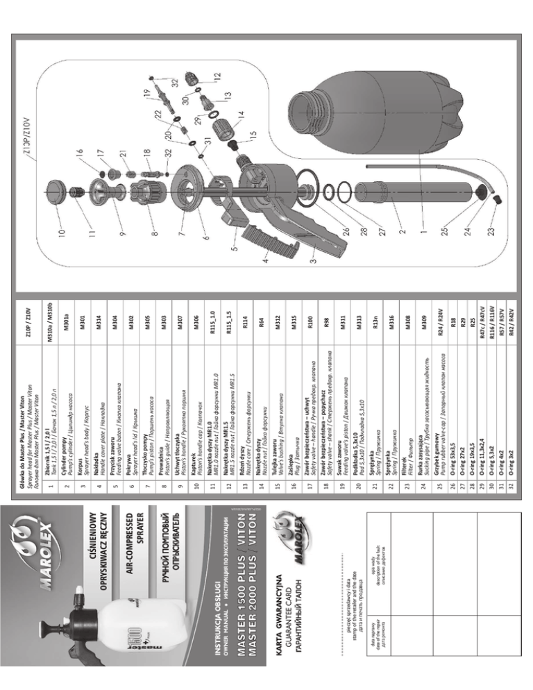 ИНСТРУКЦИЯ ПО ЭКСПЛУАТАЦИИ data naprawy date of the repair дата ремонта opis wady description of the fault описание дефектов pieczęć sprzedawcy i data stamp of the retailer and the date дата и печать продавца ГАРАНТИЙНЫЙ ТАЛОН KARTA GWARANCYJNA GUARANTEE CARD MASTER 1500 PLUS / VITON MASTER 2000 PLUS / VITON OWNER MANUAL INSTRUKCJA OBSŁUGI РУЧНОЙ ПОМПОВЫЙ ОПРЫСКИВАТЕЛЬ AIR-COMPRESSED SPRAYER CIŚNIENIOWY OPRYSKIWACZ RĘCZNY 052/PL,GB,RUS/2010/A M301a M301 M314 M304 M302 M305 M303 M307 M306 R115_1.0 R115_1.5 R114 R64 M312 M315 R100 R98 M311 M313 R13n M316 M308 M309 R24 / R24V R18 R29 R25 R47c / R47cV R116 / R116V R57 / R57V Cylinder pompy Pump’s cylinder / Цилиндр насоса Korpus Sprayer head’s body / Корпус Nakładka Handle cover plate / Накладка Przycisk zaworu Feeding valve buton / Кнопка клапана Pokrywa Sprayer head’s lid / Крышка Tłoczysko pompy Pump’s piston / Поршень насоса Prowadnica Piston’s guide / Направляющая Uchwyt tłoczyska Piston’s handle / Рукоятка поршня Kapturek Piston’s handle cap / Колпачок Nakrętka dyszy MR1.0 MR1.0 nozzle nut / Гайка форсунки MR1.0 Nakrętka dyszy MR1.5 MR1.5 nozzle nut / Гайка форсунки MR1.5 Rdzeń dyszy Nozzle core / Стержень форсунки Nakrętka dyszy Nozzle nut / Гайка форсунки Tulejka zaworu Valve’s bushing / Втулка клапана Zaślepka Plug / Затычка Zawór bezpieczeństwa – uchwyt Safety valve – handle / Ручка предохр. клапана Zawór bezpieczeństwa – popychacz Safety valve – shank / Cтержень предохр. клапана Suwak zaworu Feeding valve’s piston / Движок клапана Podkładka 5,3x10 Pad 5,3x10 / Подкладка 5,3x10 Sprężynka Spring / Пружинка Sprężynka Spring / Пружинка Filterek Filter / Фильтр Rurka zasysająca Sucking pipe / Трубка засасывающая жидкость Grzybek gumowy Pump rubber valve-cap / Запорный клапан насоса O-ring 53x3,5 O-ring 27x2 O-ring 19x3,5 O-ring 11,3x2,4 O-ring 5,3x2 O-ring 4x2 O-ring 3x2 2 3 4 5 6 7 8 9 10 11 12 13 14 15 16 17 18 19 20 21 22 23 24 25 26 27 28 29 30 31 32 R42 / R42V M310a / M310b Zbiornik 1,5 l / 2,0 l Tank 1,5 l / 2,0 l / Бачок 1,5 л / 2,0 л Z10P / Z10V 1 Główka do Master Plus / Master Viton Sprayer head for Master Plus / Master Viton Головка для Master Plus / Master Viton MASTER 1500 PLUS / VITON MASTER 2000 PLUS / VITON CIŚNIENIOWY OPRYSKIWACZ RĘCZNY INSTRUKCJA OBSŁUGI PM2000P PM2000V 2100 ml 2000 ml PM1500P PM1500V 1600 ml 1500 ml 0,4 litr/min 0,4 MPa (4 bar) (60 PSI) zawór bezpieczeństwa R03dm 130 mm 340 mm 310 mm 0,52 kg 0,48 kg polipropylen Master 2000 PLUS Master 2000 VITON Master 1500 PLUS Master 1500 VITON 1. Przed odkręceniem główki należy sprawdzić czy opryskiwacz nie jest pod ciśnieniem, unosząc uchwyt zaworu R03dm do góry. 2. Sporządzić ciecz roboczą zgodnie z zaleceniami na opakowaniu środka chemicznego i wlać przez sitko do zbiornika do poziomu wskazanego na podziałce. 3. Po napełnieniu zbiornika cieczą, wkręceniu główki i napompowaniu, opryskiwacz jest gotowy do pracy. 4. Po nadmiernym napompowaniu zawór bezpieczeństwa otwiera się samoczynnie, wypuszczając nadmiar powietrza. UWAGA! Przy maksymalnym napompowaniu opryskiwacza istnieje możliwość wydostania się cieczy przez zawór bezpieczeństwa. 5. Wytrysk cieczy następuje w wyniku naciśnięcia spustu pompki. 6. Strumień przepływu cieczy można regulować obracając końcówką rozpylacza. 7. W miarę potrzeb można zwiększać ciśnienie przez dopompowywanie. 4. PRZYGOTOWANIE I PRACA OPRYSKIWACZA Opryskiwacze 1.5 l i 2.0 l są wygodnym, lekkim i trwałym narzędziem pracy, doskonale sprawdzają się przy zabiegach ochronnych i pielęgnacyjnych roślin w domu i ogrodzie. Opryskiwacze z uszczelnieniami VITON przeznaczone są do agresywnych środków oraz silnych detergentów, używanych w przemyśle chemicznym, warsztatach, zakładach i myjniach. Opryskiwacze te wykorzystywane są również przy likwidacji skażeń oraz dezynfekcji i deratyzacji. 3. ZASTOSOWANIE I PRZEZNACZENIE Opryskiwacz dostępny jest również w wersji wzmocnionej z uszczelnieniami VITON. 1. Kompletny opryskiwacz o pojemności 1,5 l lub 2,0 l. 2. Dodatkowa dysza MR1.0 (znajduje się pod przykrywką uchwytu tłoczyska). 3. Instrukcja obsługi z kartą gwarancyjną. 2. WYPOSAŻENIE OPRYSKIWACZA pojemność całkowita pojemność robocza średni wydatek cieczy ciśnienie robocze max. zabezpieczenie ciśnienia średnica zbiornika wysokość opryskiwacza masa netto materiał zbiornika symbol wyrobu Model 1. DANE TECHNICZNE PL Opryskiwacz raz użyty do środków ochrony roślin nie może być użyty do innych celów ! 1. Niedozwolona jest praca opryskiwaczem: dzieci, kobiet w ciąży, osób chorych zażywających leki, po spożyciu alkoholu i osób zażywających substancje ograniczające koncentracji. 2. Podczas pierwszego uruchomienia należy sprawdzić działanie opryskiwacza, wykorzystując czystą wodę. 3. Pracując z chemicznymi środkami ochrony roślin (także podczas przygotowywania preparatów i niszczenia opakowań) konieczne jest używanie specjalnej odzieży ochronnej: gumowe buty, rękawice, płaszcz, czapka, okulary ochronne, maska lub półmaska. 4. Do pracy ze środkami ochrony roślin nie należy przystępować na czczo, a w czasie pracy nie wolno jeść, pić i palić. Nie wolno pić alkoholu także w przeddzień i po zakończeniu pracy. 5. Resztek cieczy nie wolno wypuszczać do wód otwartych lub biologicznych oczyszczalni ścieków. Należy przy tym przestrzegać obowiązującego Rozporządzenia Ministra Rolnictwa i Rozwoju Wsi z dnia 24 czerwca 2002 roku w sprawie bezpieczeństwa