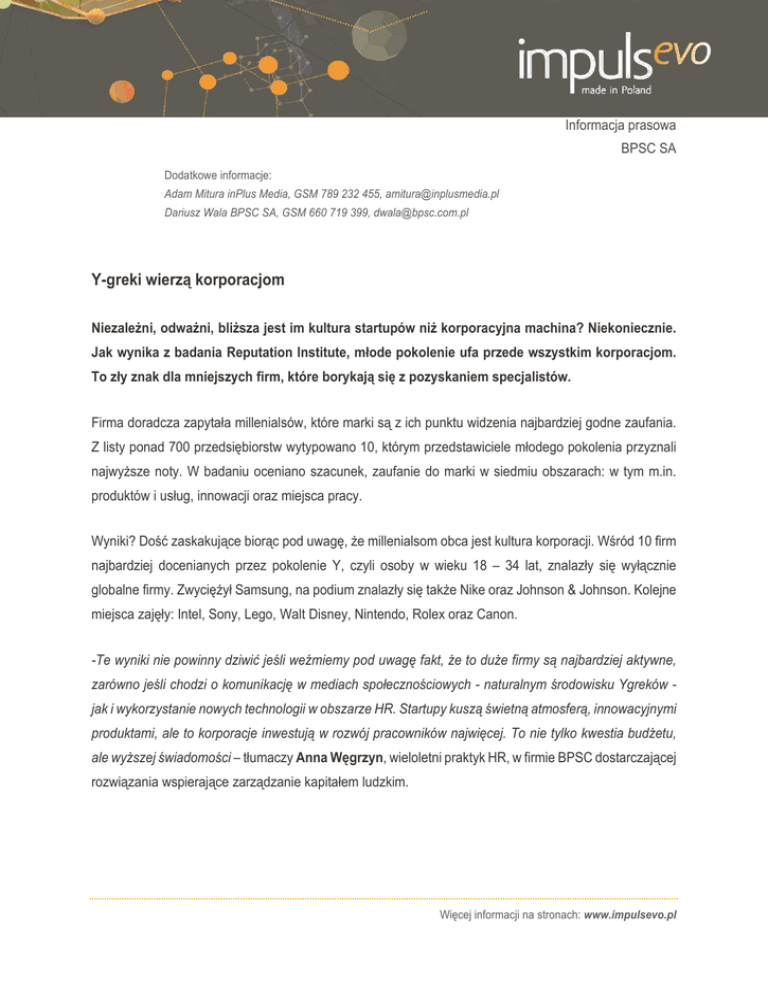 Informacja prasowa BPSC SA Dodatkowe informacje: Adam Mitura inPlus Media, GSM 789 232 455, [email protected] Dariusz Wala BPSC SA, GSM 660 719 399, [email protected] Y-greki wierzą korporacjom Niezależni, odważni, bliższa jest im kultura startupów niż korporacyjna machina? Niekoniecznie. Jak wynika z badania Reputation Institute, młode pokolenie ufa przede wszystkim korporacjom. To zły znak dla mniejszych firm, które borykają się z pozyskaniem specjalistów. Firma doradcza zapytała millenialsów, które marki są z ich punktu widzenia najbardziej godne zaufania. Z listy ponad 700 przedsiębiorstw wytypowano 10, którym przedstawiciele młodego pokolenia przyznali najwyższe noty. W badaniu oceniano szacunek, zaufanie do marki w siedmiu obszarach: w tym m.in. produktów i usług, innowacji oraz miejsca pracy. Wyniki? Dość zaskakujące biorąc pod uwagę, że millenialsom obca jest kultura korporacji. Wśród 10 firm najbardziej docenianych przez pokolenie Y, czyli osoby w wieku 18 – 34 lat, znalazły się wyłącznie globalne firmy. Zwyciężył Samsung, na podium znalazły się także Nike oraz Johnson & Johnson. Kolejne miejsca zajęły: Intel, Sony, Lego, Walt Disney, Nintendo, Rolex oraz Canon. -Te wyniki nie powinny dziwić jeśli weźmiemy pod uwagę fakt, że to duże firmy są najbardziej aktywne, zarówno jeśli chodzi o komunikację w mediach społecznościowych - naturalnym środowisku Ygreków jak i wykorzystanie nowych technologii w obszarze HR. Startupy kuszą świetną atmosferą, innowacyjnymi produktami, ale to korporacje inwestują w rozwój pracowników najwięcej. To nie tylko kwestia budżetu, ale wyższej świadomości – tłumaczy Anna Węgrzyn, wieloletni praktyk HR, w firmie BPSC dostarczającej rozwiązania wspierające zarządzanie kapitałem ludzkim. Więcej informacji na stronach: www.impulsevo.pl To o tyle istotne, że jak wynika z danych Reputation Institute, wysoka pozycja w rankingu oznacza nie tylko tego, że millenialsi chętniej kupią produkty firm o bardzo dobrej reputacji, ale też chętniej podejmą w nich pracę. To ważny sygnał dla mniejszych firm. -Dla pracowników z pokolenia Y najważniejsze są możliwości rozwoju, dlatego już na początku muszą mieć jasno wytyczone cele. To ludzie, którzy chcą mieć aktywny kontakt z pracodawcą i być informowani na bieżąco o tym, co robią dobrze i do czego powinni się bardziej przyłożyć, a sposób przekazywania tych informacji wymaga od menedżerów innego podejścia i formy niż komunikacja z poprzednimi pokoleniami. W tym kontekście np. papierowe arkusze ocen czy brak zdefiniowanych ogólnie dostępnych ścieżek rozwoju z sekwencją stanowisk, wymagań, warunków to anachronizm a wiele firm wciąż z nich przecież korzysta – tłumaczy Anna Węgrzyn z BPSC. Z badań Deloitte wynika, że aż 44% millenialsów chce zmienić swojego pracodawcę w ciągu najbliższych dwóch lat. Ogółem aż 66% przedstawicieli pokolenia Y deklaruje chęć zmiany pracodawcy. Głównym powodem zmiany pracy nie są wbrew pozorom pieniądze (jedynie 4% wskazuje wynagrodzenie jako kluczowy element ich kariery w pierwszych 5 latach pracy), ale brak możliwości awansu, zbyt duża liczba nadgodzin, fakt, że kultura organizacji nie sprzyja pracy zespołowej oraz mała elastyczność pracy. 64% millenialsów gdyby miało taką możliwość, chciałoby okazjonalnie pracować z domu, a 66% zmieniłoby godziny swojej pracy. -Tak jak korporacje realizują swoje cele, tak i to pokolenie realizuje swoje, nie zawsze pokrywające się z celami organizacji – komentuje Anna Węgrzyn z BPSC. ### BPSC SA zajmuje się projektowaniem i wdrażaniem systemów informatycznych wspomagających zarządzanie przedsiębiorstwem. Sztandarowym produktem firmy jest zintegrowany pakiet klasy MRPII/ERP Impuls EVO. System należy w tej chwili do ścisłej czołówki oferowanych na rynku rozwiązań tej klasy. Dzięki swojej kompleksowości i elastyczności kolejne rozwiązania klasy ERP wykorzystywane są przez ponad 650 średnich i dużych przedsiębiorstw z różnych sektorów gospodarki. Firma zatrudnia ponad 240 osób - najwyższej klasy specjalistów w doskonały sposób łączących wiedzę na temat nowych technologii ze znajomością potrzeb współczesnych przedsiębiorstw. Więcej informacji na stronach: www.impulsevo.pl Wśród klientów BPSC są m.in. wybrane przedsiębiorstwa Grupy Tauron Polska Energia, Poczta Polska, PZU Finanse, CN Kopernik, Kler, BIG – STAR, Stalexport-Transroute Autostrada, Organika, Atal, Wiśniowski, Grupa Sokołów, Sokpol, OSM Piątnica, WSP Społem Kielce. Więcej informacji na stronach: www.impulsevo.pl