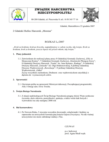 ZWIĄZEK HARCERSTWA RZECZYPOSPOLITEJ 80-288 Gdańsk, ul. Piecewska 9; tel.: 0-58 345 77 16 Gdańsk, Matemblewo 23 grudnia 2007 2 Gdański Hufiec Harcerek „Morena” ROZKAZ L9/2007 „Krok za krokiem, krok po kroczku, najpiękniejsze w całym roczku, idą święta. Krok za krokiem, krok za krokiem, jeszcze lepsze niż przed rokiem, idą święta.” 1. Plany jednostek 1.1. Zatwierdzam do realizacji plany pracy 8 Gdańskiej Gromady Zuchowej „Elfy ze Słonecznej Krainy”, 7 Gdańskiej Gromady Zuchowej „Strażniczki Płonącej Zorzy”, 8 Gdańskiej Drużyny Harcerek „Tendo” im. Jana Bytnara „Rudego”, 9 Gdańskiej Drużyny Harcerek „Gniazdo” im. Olgi Drahonowskiej, 8 próbnej Gdańskiej Druzyny Wędrowniczek „Rewolucja” i 9 próbnej Gdańskiej Drużyny Wędrowniczek „Odlot” Życzę wszystkim zuchenkom, Druhnom oraz wędrowniczkom satysfakcji z dążenia do wyznaczonych celów. 2. Sprawności 2.1. Otwieram próbę na sprawność Mistrzyni dekoracji, Początkującej programistki, Alfy i Omegi sam. Ewie Trocha. 3. Święta Bożego Narodzenia 3.1. Z okazji nadchodzących Świąt Bożego Narodzenia pragnę złożyć Wam serdeczne życzenia, dużo zdrowia, pomyślności, spokoju, a także wielu łask bożych i wytrwałości na cały następny 2008 rok 4. Bal karnawałowy 4.1. Po Nowym Roku, 5 stycznia wszystkie dworzanki, szlachcianki i hrabiny są zapraszane na uroczystość koronacyjną księcia Gajosa Zwycięzcy. Na tak ważnej uroczystości nie może zabraknąć żadnej z Nas. CZUWAJ! p.o. hufcowej pwd. Agata Mrall wędr.