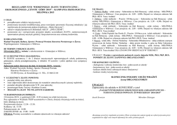 REGULAMIN XVII WIOSENNEGO ZLOTU TURYSTYCZNO – EKOLOGICZNEGO „CZYSTE GÓRY 2015” – KAMPANIA EKOLOGICZNA MILÓWKA 2015 I CELE: porządkowanie szlaków turystycznych; promowanie turystyki kwalifikowanej, przez rozwijanie sprawności fizycznej młodzieży i jej zamiłowania do poznawania piękna krajobrazu „ Małej Ojczyzny”; udział w międzynarodowych obchodach AKCJI - „DNIA ZIEMI”; poznawanie się i zawiązywanie przyjaźni między uczestnikami ZLOTU, zainteresowanych uprawianiem pieszej turystyki górskiej i krajoznawstwem oraz ochroną środowiska. II ORGANIZATOR: Wydział Turystyki, Kultury, Sportu i Promocji Powiatu Starostwa Powiatowego w Żywcu. Współorganizator: Gimnazjum w Milówce. III TERMIN I MIEJSCE ZLOTU: 18 kwietnia 2015 r. /sobota/ z zakończeniem w Gimnazjum w Milówce. IV UCZESTNICTWO I ZGŁOSZENIA: W ZLOCIE uczestniczy 1 do 2 drużyn turystycznych reprezentujących szkołę podstawową, gimnazjum, szkołę ponadgimnazjalną, w składzie 10 uczniów i jeden opiekun oraz sympatycy turystyki. Zgłoszenia należy kierować do dnia 14 kwietnia 2015r. /wtorek / Adres: Wydział Turystyki, Kultury, Sportu i Promocji Powiatu Starostwo Powiatowe w Żywcu 34-300 Żywiec, ul. Krasińskiego 13. TEL. 33 860-22-44 V UCZESTNICY ZLOTU POWINNI: posiadać dobry stan zdrowia; mieć odpowiedni ubiór dostosowany do warunków atmosferycznych i pieszej wędrówki; posiadać aktualne ubezpieczenie N.W. oraz apteczkę; przestrzegać Karty Turysty i Kodeksu Ucznia; DOJAZD NA ZLOT WE WŁASNYM ZAKRESIE. VI HARMONOGRAM IMPREZY: 18 kwietnia 2015r. w godzinach 8:00 - 8:30 wymarsz na szlaki turystyczne. Przy zgłoszeniu w Wydziale TKSP uczestnictwa w Zlocie, drużyny otrzymują worki na śmieci, które składują na mecie. Przyjmowanie drużyn: 12:30 - 13:30. Konkursy: ok. 13:30. Podsumowanie: ok. 14:00. ZAKOŃCZENIE: ok. 15:00 - 16:00 UWAGA: Prosimy uczestników o zabranie rękawiczek we własnym zakresie! VII TRASY: 1. Żabnica Skałka - szlak czarny - Schronisko na Hali Boraczej - szlak zielony - MILÓWKA /Gimnazjum w Milówce/. Czas przejścia: ok. 3,00 - 4,00h. Dojazd we własnym zakresie lub PKS i BUS. Trasa średnia! 2. Żabnica - szlak niebieski - Prusów /1010m.n.p.m./ - Schronisko na Hali Boraczej - szlak zielony MILÓWKA /Gimnazjum w Milówce/. Czas przejścia: ok. 3,30 - 4,30h. Dojazd we własnym zakresie lub PKS i BUS. Trasa średnia! 3 Rajcza - szlak niebieski - Schronisko na Hali Boraczej - szlak zielony - MILÓWKA /Gimnazjum w Milówce/. Czas przejścia: ok. 3,00 - 4,00h. Dojazd we własnym zakresie lub PKS i BUS. Trasa średnia! 4. Cisiec - Szlak Papieski Jan Pawła II - Prusów /1010m.n.p.m. /szlak niebieski/ - Schronisko na Hali Bobaczej - szlak zielony - MILÓWKA /Gimnazjum w Milówce/. Czas przejścia: ok. 4,00 - 4,30h. Dojazd we własnym zakresie lub PKS i BUS. Trasa średnia! 5. Rajcza - szlak żółty - Dolina Nickuliny - Schronisko Młodzieżowe - dalej szlakiem czarnym rowerowym do końca Doliny Nickuliny - dalej prosto ścieżką w górę na Halę Cukiernica Wyżna - szlak niebieski - Schronisko na Hali Boraczej - szlak zielony -MILÓWKA /Gimnazjum w Milówce/. Czas przejścia: ok. 4,00 - 4,30h. Dojazd we własnym zakresie lub PKS i BUS. Trasa średnia! DLA ZNAWCÓW ORIENTACJI W TERENIE!!! UWAGA!!! Prosimy o sprawdzenie podanych czasów dojazdu MZK, PKS, PKP, BUS. POWRÓT ZE ZLOTU ZAPEWNIA ORGANIZATOR!!! VIII KONKURSY GŁÓWNE : - ekologiczny i ochrony środowiska /test - jeden uczeń ze szkoły/ - krajoznawczy /test - jeden uczeń ze szkoły/ - konkurs zbiórki ilości zebranych śmieci /drużynowy/ - konkurs wiedzy turystycznej. SŁONECZNEJ POGODY I DUŻO WRAŻEŃ życzą ORGANIZATORZY UWAGA!!! Zapraszamy do udziału w KONKURSIE o tytuł „NAJAKTYWNIEJSZEGO SZKOLNEGO KOŁA KRAJOZNAWCZO – TURYSTYCZNEGO POWIATU ŻYWIECKIEGO’ 2014/2015” Jacek Seweryn Mirosław Dziergas Akceptując powyższy regulamin uczestnicy Zlotu wyrażają tym samym zgodę na wykorzystywanie przez organizatorów zdjęć oraz innych informacji do celów promocyjnych.