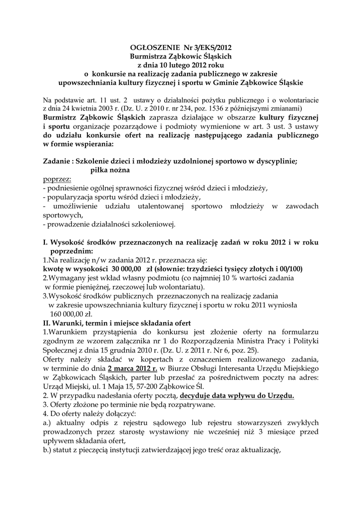OGŁOSZENIE Nr 3/EKS/2012 Burmistrza Ząbkowic Śląskich z dnia 10 lutego 2012 roku o konkursie na realizację zadania publicznego w zakresie upowszechniania kultury fizycznej i sportu w Gminie Ząbkowice Śląskie Na podstawie art. 11 ust. 2 ustawy o działalności pożytku publicznego i o wolontariacie z dnia 24 kwietnia 2003 r. (Dz. U. z 2010 r. nr 234, poz. 1536 z późniejszymi zmianami) Burmistrz Ząbkowic Śląskich zaprasza działające w obszarze kultury fizycznej i sportu organizacje pozarządowe i podmioty wymienione w art. 3 ust. 3 ustawy do udziału konkursie ofert na realizację następującego zadania publicznego w formie wspierania: Zadanie : Szkolenie dzieci i młodzieży uzdolnionej sportowo w dyscyplinie; piłka nożna poprzez: - podniesienie ogólnej sprawności fizycznej wśród dzieci i młodzieży, - popularyzacja sportu wśród dzieci i młodzieży, - umożliwienie udziału utalentowanej sportowo młodzieży w zawodach sportowych, - prowadzenie działalności szkoleniowej. I. Wysokość środków przeznaczonych na realizację zadań w roku 2012 i w roku poprzednim: 1.Na realizację n/w zadania 2012 r. przeznacza się: kwotę w wysokości 30 000,00 zł (słownie: trzydzieści tysięcy złotych i 00/100) 2.Wymagany jest wkład własny podmiotu (co najmniej 10 % wartości zadania w formie pieniężnej, rzeczowej lub wolontariatu). 3.Wysokość środków publicznych przeznaczonych na realizację zadania w zakresie upowszechniania kultury fizycznej i sportu w roku 2011 wyniosła 160 000,00 zł. II. Warunki, termin i miejsce składania ofert 1.Warunkiem przystąpienia do konkursu jest złożenie oferty na formularzu zgodnym ze wzorem załącznika nr 1 do Rozporządzenia Ministra Pracy i Polityki Społecznej z dnia 15 grudnia 2010 r. (Dz. U. z 2011 r. Nr 6, poz. 25). Oferty należy składać w kopertach z oznaczeniem realizowanego zadania, w terminie do dnia 2 marca 2012 r. w Biurze Obsługi Interesanta Urzędu Miejskiego w Ząbkowicach Śląskich, parter lub przesłać za pośrednictwem poczty na adres: Urząd Miejski, ul. 1 Maja 15, 57-200 Ząbkowice Śl. 2. W przypadku nadesłania oferty pocztą, decyduje data wpływu do Urzędu. 3. Oferty złożone po terminie nie będą rozpatrywane. 4. Do oferty należy dołączyć: a.) aktualny odpis z rejestru sądowego lub rejestru stowarzyszeń zwykłych prowadzonych przez starostę wystawiony nie wcześniej niż 3 miesiące przed upływem składania ofert, b.) statut z pieczęcią instytucji zatwierdzającej jego treść oraz aktualizację, c.) sprawozdanie merytoryczne i finansowe z działalności za rok ubiegły lub w przypadku krótszej działalności – za okres działalności, d.) oświadczenie osób reprezentujących organizację o nieprowadzeniu działalności w celu osiągnięcia zysku, e.) oświadczenie pisemne oferenta, że nie posiada zaległości finansowych w stosunku do właściwego Urzędu Skarbowego oraz Zakładu Ubezpieczeń Społecznych. f.) dokumenty potwierdzające kwalifikacje osób, które będą zatrudnione przy realizacji zadania. 5.Dokumenty, o których mowa powyżej, powinny być złożone w formie oryginału lub kserokopii poświadczonej za zgodność z oryginałem przez uprawnione osoby reprezentujące podmiot występujący o dotację. 6. Oferta powinna być podpisana przez osoby uprawnione oraz powinna posiadać wymagane pieczęcie. 7. Formularz oferty można otrzymać w Wydziale Edukacji ( II piętro, pokój 28) lub pobrać ze strony internetowej: www.zabkowiceslaskie.pl/ BIP ( w zakładce: Ogłoszenia Burmistrza). 8. W okresie realizacji zadania oferent może dokonywać przeniesień wydatków finansowych z dotacji między poszczególnymi pozycjami kosztorysu na skutek zaistnienia okoliczności, których nie można było przewidzieć w dniu zawarcia umowy, z zastrzeżeniem spełnienia łącznie poniższych warunków: - suma przesunięć nie można przekraczać 10% środków dotacji, - środki nie mogą zwiększać wartości wydatków na wynagrodzenia. 9. Oferent zobowiązany jest do każdorazowego pisemnego powiadomienia Zleceniodawcy o wszystkich planowanych zmianach, np. dotyczących środków finansowych z dotacji i własnych (pow. 10%), harmonogramu zadania, zmian kadrowych itp. Zachodzących w realizacji zadania. Planowane zmiany mogą być wprowadzone do realizacji tylko po akceptacji ze strony Zleceniodawcy i po podpisaniu aneksu z zastrzeżeniem, że planowane zmiany w wydatkach będą realizowane po podpisaniu aneksu przez obie strony. III. Zasady przyznawania dotacji na realizację zadania publicznego: 1. Oferty będą analizowane i oceniane przez Komisję Konkursową, składającą się z przedstawicieli Urzędu i przedstawicieli organizacji pozarządowych, z wyłączeniem organizacji biorących udział w konkursie. 2. Oferty, które będą złożone na niewłaściwych formularzach, wypełnione niepoprawnie bądź nieczytelne zostaną odrzucone i nie będą rozpatrywane. 3. Ofertę należy sporządzić w formie pisemnej pod rygorem nieważności, wypełnioną komputerowo lub czytelnym pismem ręcznym, drukowanym wraz z ponumerowaniem każdej strony. 4. W przypadku, gdy suma dofinansowania zgłoszonych ofert przekracza wysokość środków przeznaczonych na wsparcie zadania, Burmistrz zastrzega sobie możliwość zmniejszenia wysokości dofinansowania, stosownie do posiadanych środków. IV. Kryteria i tryb wyboru oferty 1. Rozpatrzenie ofert nastąpi w terminie do 5 dni roboczych licząc od ostatniego dnia składania ofert. 2. Komisja Konkursowa dokona oceny ofert, przyznając określoną liczbę punktów poszczególnym ofertom w ramach przyjętych kryteriów: a.) ocena możliwości realizacji zadania przez oferenta; b.) ocena posiadanych przez oferenta zasobów rzeczowych i kadrowych z uwzględnieniem kwalifikacji osób biorących udział w realizacji zadania wymienionego w ogłoszeniu, analiza i ocena wykonania zadań zleconych w okresie poprzednim, z uwzględnieniem rzetelności i 
