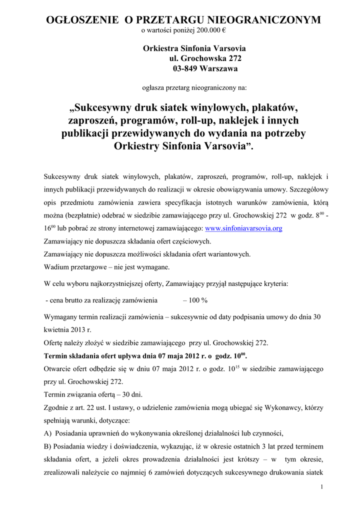OGŁOSZENIE O PRZETARGU NIEOGRANICZONYM o wartości poniżej 200.000 € Orkiestra Sinfonia Varsovia ul. Grochowska 272 03-849 Warszawa ogłasza przetarg nieograniczony na: „Sukcesywny druk siatek winylowych, plakatów, zaproszeń, programów, roll-up, naklejek i innych publikacji przewidywanych do wydania na potrzeby Orkiestry Sinfonia Varsovia”. Sukcesywny druk siatek winylowych, plakatów, zaproszeń, programów, roll-up, naklejek i innych publikacji przewidywanych do realizacji w okresie obowiązywania umowy. Szczegółowy opis przedmiotu zamówienia zawiera specyfikacja istotnych warunków zamówienia, którą można (bezpłatnie) odebrać w siedzibie zamawiającego przy ul. Grochowskiej 272 w godz. 8 00 1600 lub pobrać ze strony internetowej zamawiającego: www.sinfoniavarsovia.org Zamawiający nie dopuszcza składania ofert częściowych. Zamawiający nie dopuszcza możliwości składania ofert wariantowych. Wadium przetargowe – nie jest wymagane. W celu wyboru najkorzystniejszej oferty, Zamawiający przyjął następujące kryteria: - cena brutto za realizację zamówienia – 100 % Wymagany termin realizacji zamówienia – sukcesywnie od daty podpisania umowy do dnia 30 kwietnia 2013 r. Ofertę należy złożyć w siedzibie zamawiającego przy ul. Grochowskiej 272. Termin składania ofert upływa dnia 07 maja 2012 r. o godz. 1000. Otwarcie ofert odbędzie się w dniu 07 maja 2012 r. o godz. 10 15 w siedzibie zamawiającego przy ul. Grochowskiej 272. Termin związania ofertą – 30 dni. Zgodnie z art. 22 ust. l ustawy, o udzielenie zamówienia mogą ubiegać się Wykonawcy, którzy spełniają warunki, dotyczące: A) Posiadania uprawnień do wykonywania określonej działalności lub czynności, B) Posiadania wiedzy i doświadczenia, wykazując, iż w okresie ostatnich 3 lat przed terminem składania ofert, a jeżeli okres prowadzenia działalności jest krótszy – w tym okresie, zrealizowali należycie co najmniej 6 zamówień dotyczących sukcesywnego drukowania siatek 1 winylowych, albumów i/lub broszur i/lub folderów, zawierających zdjęcia o wartości każdego z zamówień nie mniejszej niż 150.000 zł. brutto C) Dysponowania odpowiednim potencjałem technicznym oraz osobami zdolnymi do wykonania zamówienia. D) Sytuacji ekonomicznej i finansowej. W celu wykazania spełniania przez Wykonawcę warunków oraz braku podstaw do wykluczenia z powodu niespełnienia warunków, o których mowa w art. 24 ust. 1 ustawy Prawo zamówień publicznych wraz z ofertą należy załączyć: 1. Oświadczenie Wykonawcy o spełnianiu warunków określonych w art. 22 ust. 1 pkt 1 - 4 ustawy Prawo zamówień publicznych, 2. Oświadczenie Wykonawcy, o braku podstaw do wykluczenia na podstawie art. 24 ust. 1 ustawy Prawo zamówień publicznych, 3. Wykaz („Doświadczenie zawodowe” – wzór wykazu stanowi Załącznik do SIWZ), w zakresie niezbędnym do wykazania spełniania warunku wiedzy i doświadczenia określonego w pkt. B) powyżej, usług wykonanych w okresie ostatnich 3 lat przed upływem terminu składania ofert, a jeżeli okres prowadzenia działalności jest krótszy – w tym okresie, wraz z załączeniem dokumentu potwierdzającego, że usługi wymienione w wykazie zostały wykonane należycie. 4. Aktualny odpis z właściwego rejestru, jeżeli odrębne przepisy wymagają wpisu do rejestru, w celu wykazania braku podstaw do wykluczenia w oparciu o art. 24 ust. 1 pkt 2 ustawy, a w stosunku do osób fizycznych oświadczenia w zakresie art. 24 ust 1 pkt 2 ustawy.4. 5. Jeżeli Wykonawca ma siedzibę lub miejsce zamieszkania poza terytorium Rzeczypospolitej Polskiej, zamiast dokumentów, o których mowa w pkt 4 składa odpowiedni dokument lub dokumenty, wystawione w kraju, w którym ma siedzibę lub miejsce zamieszkania, potwierdzające odpowiednio, że: a) nie otwarto jego likwidacji ani nie ogłoszono upadłości, b) nie zalega z uiszczaniem podatków, opłat, składek na ubezpieczenie społeczne i zdrowotne albo że uzyskał przewidziane prawem zwolnienie, odroczenie lub rozłożenie na raty zaległych płatności lub wstrzymanie w całości wykonania decyzji właściwego organu, c) nie orzeczono wobec niego zakazu ubiegania się o zamówienie; 6. Dokument o którym mowa w pkt 4 i 5 musi być wystawiony nie wcześniej niż 6 m-cy przed upływem terminu składania ofert. 7. Jeżeli w miejscu zamieszkania osoby lub w kraju, w którym Wykonawca ma siedzibę 2 lub miejsce zamieszkania, nie wydaje się dokumentów, o których mowa w pkt 5 powyżej, zastępuje się je dokumentem zawierającym oświadczenie złożone przed notariuszem, właściwym organem sądowym, administracyjnym albo organem samorządu zawodowego lub gospodarczego odpowiednio miejsca zamieszkania osoby lub kraju, w którym wykonawca ma siedzibę lub miejsce zamieszkania. Zapis pkt 6 stosuje się odpowiednio. 8. Jeżeli Wykonawca będzie polegać na wiedzy i doświadczeniu, potencjale technicznym, osobach zdolnych do wykonania zamówienia lub zdolnościach finansowych innych podmiotów, niezależnie od charakteru prawnego łączących go z nimi stosunków, w takiej sytuacji zobowiązany jest udowodnić zamawiającemu, iż będzie dysponował zasobami niezbędnymi do realizacji zamówienia, w szczególności przedstawiając w tym celu pisemne zobowiązanie tych podmiotów do oddania mu do dyspozycji niezbędnych zasobów na okres korzystania z nich przy wykonaniu zamówienia. 9. Jeżeli Wykonawca, wykazując spełnianie warunków, o których mowa w pkt. A-D powyżej, polega na zasobach innych podmiotów, a podmioty te będą brały udział w realizacji części zamówienia, Zamawiający żąda od Wykonawców przedstawienia w odniesieniu do tych podmiotów dokumentów wymienionych w pkt. 2, 4, powyżej. 11. Wykonawcy wspólnie ubiegający się o udzielenie niniejszego zamówienia muszą wykazać, że warunki określone w pkt A-D powyżej, spełniają łącznie wszyscy Wykonawcy. 12. Zamawiający wymaga, aby Wyko
