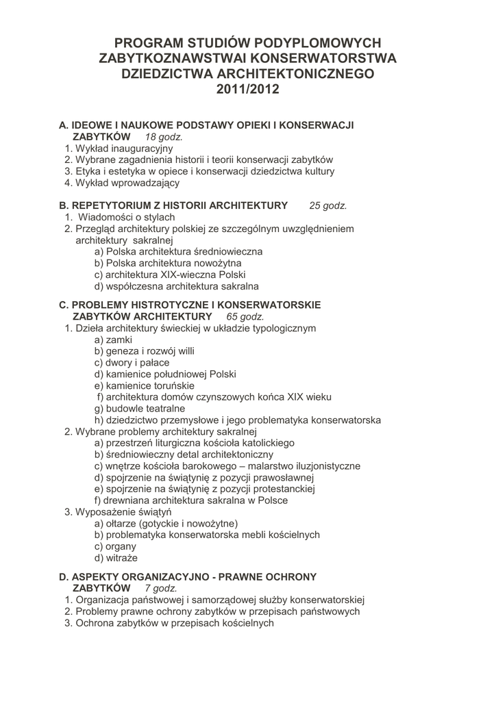 PROGRAM STUDIÓW PODYPLOMOWYCH ZABYTKOZNAWSTWAI KONSERWATORSTWA DZIEDZICTWA ARCHITEKTONICZNEGO 2011/2012 A. IDEOWE I NAUKOWE PODSTAWY OPIEKI I KONSERWACJI ZABYTKÓW 18 godz. 1. Wykład inauguracyjny 2. Wybrane zagadnienia historii i teorii konserwacji zabytków 3. Etyka i estetyka w opiece i konserwacji dziedzictwa kultury 4. Wykład wprowadzający B. REPETYTORIUM Z HISTORII ARCHITEKTURY 25 godz. 1. Wiadomości o stylach 2. Przegląd architektury polskiej ze szczególnym uwzględnieniem architektury sakralnej a) Polska architektura średniowieczna b) Polska architektura nowoŜytna c) architektura XIX-wieczna Polski d) współczesna architektura sakralna C. PROBLEMY HISTROTYCZNE I KONSERWATORSKIE ZABYTKÓW ARCHITEKTURY 65 godz. 1. Dzieła architektury świeckiej w układzie typologicznym a) zamki b) geneza i rozwój willi c) dwory i pałace d) kamienice południowej Polski e) kamienice toruńskie f) architektura domów czynszowych końca XIX wieku g) budowle teatralne h) dziedzictwo przemysłowe i jego problematyka konserwatorska 2. Wybrane problemy architektury sakralnej a) przestrzeń liturgiczna kościoła katolickiego b) średniowieczny detal architektoniczny c) wnętrze kościoła barokowego – malarstwo iluzjonistyczne d) spojrzenie na świątynię z pozycji prawosławnej e) spojrzenie na świątynię z pozycji protestanckiej f) drewniana architektura sakralna w Polsce 3. WyposaŜenie świątyń a) ołtarze (gotyckie i nowoŜytne) b) problematyka konserwatorska mebli kościelnych c) organy d) witraŜe D. ASPEKTY ORGANIZACYJNO - PRAWNE OCHRONY ZABYTKÓW 7 godz. 1. Organizacja państwowej i samorządowej słuŜby konserwatorskiej 2. Problemy prawne ochrony zabytków w przepisach państwowych 3. Ochrona zabytków w przepisach kościelnych E. DAWNE TECHNIKI BUDOWLANE I ICH PROBLEMATYKA KONSERWATORSKA 64 godz. 1. Kamień w architekturze polskiej 2. Fundamenty i rusztowania 3. Mury 4. Sklepienia 5. Stropy drewniane 6. Konstrukcje wieńcowe 7. Konstrukcje szkieletowe i przysłupowe oraz konstrukcje podwójne 8. Konstrukcje dachów i ich złącza oraz znaki ciesielskie 9. Pokrycia dachów 10. Stolarka (okien, witryn, drzwi) 11. Schody oraz posadzki i podłogi 12. Historia i technologia dawnych zapraw 13. Sztukaterie 14. Technologie zapraw we współczesnej konserwacji zabytków architektury 15. Typy urządzeń grzewczych od średniowiecza do XIX wieku F. PODSTAWY DOKUMENTACJI KONSERWATORSKIEJ I PROJEKTOWO – KONSERWATORSKIEJ 29 godz. 1. Dokumentacja historyczna zabytków architektury 2. Źródła rękopiśmienne do historii zabytków architektury i urbanistyki 3. Zasady inwentaryzacji pomiarowo-rysunkowej zabytków architektury i jej detali (okna, drzwi, schody i więźby) 4. Zagadnienia badań architektonicznych a) budowli murowanych b) kościóła św. Jakuba w Toruniu c) budowli drewnianych - wieńcowych d) budowli drewnianych - szkieletowych 5. Metoda badań archeologiczno - architektonicznych 6. Metoda datowania (dendrochronologiczna) zabytków drewnianych 7. Zasady i metoda dokumentacji projektowej dla zabytków architektury wraz z dokumentacją powykonawczą 8. Ewidencja zabytków G. METODY KONSERWACJI I RESTAURACJI ZABYTKÓW ARCHITEKTURY 58 godz. 1. Uwarunkowania wewnętrzne - kształtujące konserwację i restaurację zabytków architektury 2. Patologie w zabytkach architektury 3. Metoda konserwacji i restauracji zabytków architektury (wraz z terminologią prac) 4. Adaptacja zabytków architektury do współczesnych potrzeb 5. Dokumentowanie niektórych działań konserwatorskich na zabytkach architektonicznych (uczytelnienie interwencji, odkrywki ekspozycyjne, problem tzw. świadków) 6. Konserwacja i rewitalizacja ruin historycznych 7. Problematyka konserwatorska konstrukcji architektury szkieletowej 8. Problematyka konserwatorska ocieplenia architektury szkieletowej 9. Adaptacja zabytkowego prezbiterium do liturgii posoborowej 10. Problematyka rozbudowy zabytkowych kościołów 11. Problematyka artystyczna przy restauracji zabytkowej architektury 12. Problematyka faktury i kolorystyki ścian w zabytkowej architekturze 13. Farby w kolorystyce architektury zabytkowej 14. Iluminacja zabytków architektury 15. Problematyka konstrukcyjna zabytków architektury 16. Diagnostyka i naprawa dawnych konstrukcji murowanych 17. Wzmocnienie murów metodą Helifix 18. Zasady osuszania budowli zabytkowych 19. Wybrane zagadnienia fizyki budowli 20. Problematyka termoizolacji od wewnątrz budowli 21. Ochrona substancji zabytkowej – zagadnienia wilgotnościowe 22. Prezentacja dziejów Torunia H. PODSTAWY OPIEKI I PROFILAKTYKI KONSERWATORSKIEJ NAD DETALAMI ARCHITEKTONICZNYMI I ZABYTKAMI RUCHOMYMI 40 godz. 1. Nieniszczące metody badań 2. Wykorzystanie techniki laserowej w konserwacji zabytków 3. Ogólne zasady opieki i profilaktyki konserwatorskiej a) rzeźby kamiennej i detalu architektonicznego b) murów ceglanych c) malarstwa ściennego wraz z jego technologią d) zabytków z metalu e) przedmiotów z drewna 4. Grzyby i owady niszczące zabytki - metody zwalczania i zapobiegania 5. Zniszczenia biologiczne oraz dezynfekcja zabytków kamiennych I. ZAGADNIENIA INSTALACJI I BEZPIECZEŃSTWA BUDOWLI ZABYTKOWYCH 10 godz. 1. Zagadnienia ogrzewania i wentylacji zabytków architektury 2. Zagadnienia klimatu wnętrz kościelnych 3. Instalacje bezpieczeństwa w zabytkach architektury 4. Ochrona przeciwpoŜarowa zabytków architektury J. ĆWICZENIA TERENOWE – PREZENTACJE 44 godz. 1. Prezentacja zabytków Torunia (zajęcia w grupach) 2. Prezentacja wybranych realizacji konserwatorskich Torunia (zajęcia w grupach) 3. Prezentacja Zakładów Instytutu Zabytkoznawstwa i Konserwatorstwa (zajęcia w grupach) K. ĆWICZENIA PRAKTYCZNE Z INWENRTARYZACJI POMIAROWO - RYSUNKOWEJ ELEMENTÓW ARCHITEKTONICZNYCH OGÓŁEM - 360 GODZ. Kierownik studiów Prof. dr hab. inŜ. arch. Jan Tajchman