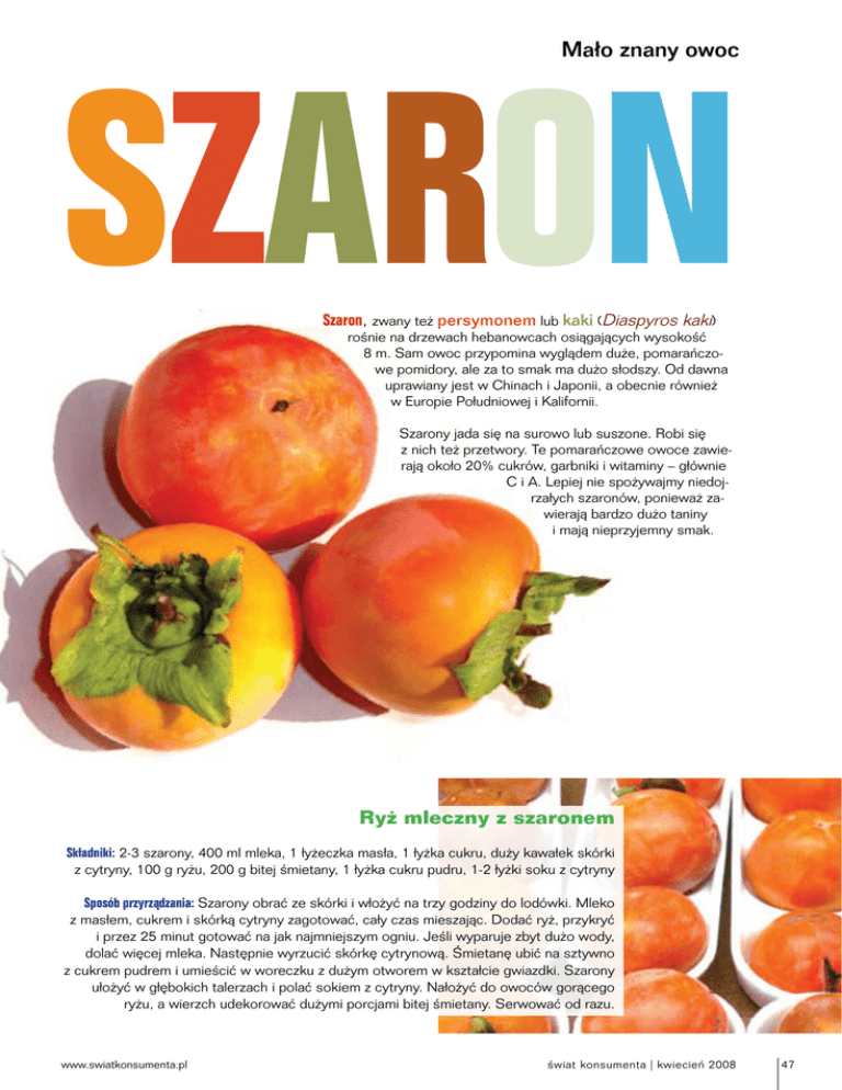 Mało znany owoc SZARON Szaron, zwany też persymonem lub kaki (Diaspyros kaki) rośnie na drzewach hebanowcach osiągających wysokość 8 m. Sam owoc przypomina wyglądem duże, pomarańczowe pomidory, ale za to smak ma dużo słodszy. Od dawna uprawiany jest w Chinach i Japonii, a obecnie również w Europie Południowej i Kalifornii. Szarony jada się na surowo lub suszone. Robi się z nich też przetwory. Te pomarańczowe owoce zawierają około 20% cukrów, garbniki i witaminy – głównie C i A. Lepiej nie spożywajmy niedojrzałych szaronów, ponieważ zawierają bardzo dużo taniny i mają nieprzyjemny smak. Ryż mleczny z szaronem Składniki: 2-3 szarony, 400 ml mleka, 1 łyżeczka masła, 1 łyżka cukru, duży kawałek skórki z cytryny, 100 g ryżu, 200 g bitej śmietany, 1 łyżka cukru pudru, 1-2 łyżki soku z cytryny Sposób przyrządzania: Szarony obrać ze skórki i włożyć na trzy godziny do lodówki. Mleko z masłem, cukrem i skórką cytryny zagotować, cały czas mieszając. Dodać ryż, przykryć i przez 25 minut gotować na jak najmniejszym ogniu. Jeśli wyparuje zbyt dużo wody, dolać więcej mleka. Następnie wyrzucić skórkę cytrynową. Śmietanę ubić na sztywno z cukrem pudrem i umieścić w woreczku z dużym otworem w kształcie gwiazdki. Szarony ułożyć w głębokich talerzach i polać sokiem z cytryny. Nałożyć do owoców gorącego ryżu, a wierzch udekorować dużymi porcjami bitej śmietany. Serwować od razu. www.swiatkonsumenta.pl świat konsumenta | kwiecień 2008 47