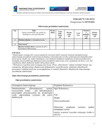 PROJEKT WSPÓŁFINANSOWANY PRZEZ UNIĘ EUROPEJSKĄ Z EUROPEJSKIEGO FUNDUSZU ROZWOJU REGIONALNEGO Załącznik Nr 4 do oferty Postępowanie Nr ZP/19/2011 Oferowany przedmiot zamówienia Lp. Opis Nazwa asortymentu, typ, model, nr katalogowy, nazwa producenta*) 1 Demineralizator w ukompletowaniu: *) n Inne koszty**) Il. szt. [kpl.] Cena jedn. netto [zł] Kwota netto [zł] VAT [%} Wartoś ć podatku VAT [zł] Kwota brutto [zł] 1 Razem wartość oferty (wpisana do pkt 1 Formularza Ofertowego) UWAGA *) Zamawiający wymaga aby w poszczególnych wierszach tabeli wymienić elementy ukompletowania zamawianego przedmiotu zamówienia pochodzące od producenta wyrobu i jednoznacznie identyfikowalne przez nazwę, model, typ, numer katalogowy oraz elementy dodatkowe zakupione od innych producentów niezbędne do prawidłowego funkcjonowania przedmiotu zamówienia wraz z podaniem ich ilości i cen. Nie wypełnienie tabeli skutkować będzie odrzuceniem oferty. **) Wykonawca wypełnia jeżeli występują inne koszty. Przez „Inne koszty” należy rozumieć koszty: np. transportu, ubezpieczenia, tłumaczenia dokumentów, przechowania, szkolenia, udzielonych gwarancji i rękojmi jeżeli nie są uwzględnione w cenach elementów składowych zamawianego przedmiotu zamówienia. Opis oferowanego przedmiotu zamówienia Opis przedmiotu zamówienia Wymagania Zamawiającego Wypełnia Wykonawca Demineralizator (Dwustopniowy system Opis Wykonawcy oczyszczania wody) - jest laboratoryjnym przyrządem przeznaczonym do uzyskiwania wody odpowiedniej czystości dla celów Typ: badawczych. Model: Nazwa producenta: Oferowane urządzenie następujące normy: (system) spełnia (należy wymienić wszystkie wskazując źródła w ofercie) 1 PROJEKT WSPÓŁFINANSOWANY PRZEZ UNIĘ EUROPEJSKĄ Z EUROPEJSKIEGO FUNDUSZU ROZWOJU REGIONALNEGO I. Wymaga się aby demineralizator (dwustopniowy system oczyszczania wody) spełniał następujące parametry techniczne: I stopień oczyszczania. Wymagania Zamawiającego 1. System zasilany wodą wodociągową, wykorzystujący odwróconą osmozę oraz wymianę jonową. 2. System przeznaczony do postawienia na stole laboratoryjnym, wymiary nie mogą przekraczać 400 x 350 mm (szer. x głęb.). Wypełnia Wykonawca Zamawiający wymaga aby Wykonawca w swoim opisie dotyczącym poszczególnych punktów Wymagań Zamawiającego podał rzeczywiste dane oferowanego przedmiotu zamówienia wskazując źródła w dokumentacji dołączonej do oferty bez kopiowania informacji z rubryki obok 3. Produkcja wody oczyszczonej z wydajnością co najmniej 40 l/h. 4. Parametry wody oczyszczonej nie gorsze niż: − przewodnictwo: 0,08 µS/cm − stopień oczyszczenia z bakterii min. 99% − ilość usuniętych krzemianów min. 99,9% 5. Wymagana jest prefiltracja mechaniczna składająca się z 2 oddzielnych filtrów wstępnych (w oddzielnych obudowach), jeden z filtrów musi zawierać węgiel aktywny. 6. Musi istnieć możliwość oddzielnej wymiany każdego z filtrów wstępnych, modułu odwróconej osmozy oraz jonowymiennego 7. System musi być wyposażony w zbiornik, w którym gromadzona jest woda oczyszczona o parametrach podanych powyżej. Pojemność zbiornika min. 60 l. 8. Zbiornik musi posiadać przynajmniej 2 punkty poboru wody oczyszczonej oraz stożkowe dno, umożliwiające całkowite opróżnienie zbiornika. 9. Obracany panel sterowania z podświetlanym wyświetlaczem LCD, pozwalający na ustawienie go w pozycji optymalnej dla użytkownika. 10.Czterowierszowy wyświetlacz, na którym muszą jednocześnie znajdować się 2 PROJEKT WSPÓŁFINANSOWANY PRZEZ UNIĘ EUROPEJSKĄ Z EUROPEJSKIEGO FUNDUSZU ROZWOJU REGIONALNEGO informacje o stanie, w jakim znajduje się system (np. spoczynku, pracy ciągłej, in.), stopniu wypełnienia zbiornika w procentach, parametry wody oczyszczonej, takie jak przewodnictwo elektryczne wyrażone w µS/cm oraz temperatura oraz ewentualnych błędów pracy systemu. 11.Wymagane są minimum 2 komórki konduktometryczne (dla wody wstępnie i finalnie oczyszczonej), których wskazania są widoczne na wyświetlaczu. 12.Pomiar przewodnictwa elektrycznego wody oczyszczonej musi zachodzić z kompensacją temperaturową. 13.System musi działać automatycznie, bez dozoru. 14.System wyposażony w Menu, z którego użytkownik może samodzielnie aktywować następujące czynności: płukanie membrany odwróconej osmozy, sanityzacja i dezynfekcja systemu, przywoływanie historii alarmów, ustawianie wartości granicznych parametrów wody dla wody wstępnie i finalnie oczyszczonej w zależności od własnych potrzeb. 15.System musi automatycznie informować o potrzebie wymiany materiałów eksploatacyjnych – wymagana jest dokładna informacja, jaki element należy wymienić. 16.Wymagana łatwa wymiana materiałów eksploatacyjnych. 17.System energooszczędny – maksymalny pobór mocy 0,1 kW. 18.Oferowany system musi zawierać wszystkie materiały eksploatacyjne wymagane do prawidłowej pracy systemu. 5.System musi w sposób automatyczny podawać wodę na II stopień oczyszczania. III. Wymaga się aby demineralizator (dwustopniowy system oczyszczania wody) spełniał następujące parametry techniczne: II stopień oczyszczania Wymagania Zamawiającego Wypełnia Wykonawca 3 PROJEKT WSPÓŁFINANSOWANY PRZEZ UNIĘ EUROPEJSKĄ Z EUROPEJSKIEGO FUNDUSZU ROZWOJU REGIONALNEGO 1. Parametry produkowanej wody ultraczystej: − przewodnictwo: nie więcej niż 0,06 µS/cm, − woda sterylna, − wartość TOC nie więcej niż 5 ppb. Zamawiający wymaga aby Wykonawca w swoim opisie dotyczącym poszczególnych punktów Wymagań Zamawiającego podał rzeczywiste dane oferowanego przedmiotu zamówienia wskazując źródła w dokumentacji dołączonej do oferty bez kopiowania informacji z rubryki obok 2. System produkuje wodę ultraczystą o podanych parametrach z wody wstępnie oczyszczonej dostarczanej przez I stopień oczyszczania; oba systemy I i II stopnia oczyszczania muszą być ze sobą fizycznie poł