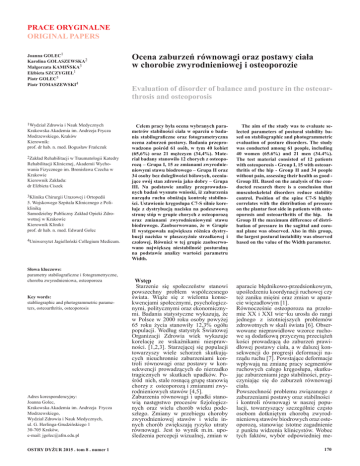 PRACE ORYGINALNE ORIGINAL PAPERS Joanna GOLEC1 Karolina GOŁASZEWSKA2 Małgorzata KAMIŃSKA3 Elżbieta SZCZYGIEŁ1 Piotr GOLEC3 Piotr TOMASZEWSKI4 Ocena zaburzeń równowagi oraz postawy ciała w chorobie zwyrodnieniowej i osteoporozie 1Wydział Zdrowia i Nauk Medycznych Celem pracy była ocena wybranych parametrów stabilności ciała w oparciu o badania stabilograficzne oraz fotogrametryczna ocena zaburzeń postawy. Badania przeprowadzono pośród 61 osób, w tym 40 kobiet (65,6%) oraz 21 mężczyzn (34,4%). Materiał badany stanowiło 12 chorych z osteoporozą – Grupa I, 15 ze zmianami zwyrodnieniowymi stawu biodrowego – Grupa II oraz 34 osoby bez dolegliwości bólowych, oceniające swój stan zdrowia jako dobry – Grupa III. Na podstawie analizy przeprowadzonych badań wysnuto wnioski, iż zaburzenia narządu ruchu obniżają kontrolę stabilności. Ustawienie kręgosłupa C7-S silnie koreluje z dystrybucją nacisku na podeszwową stronę stóp w grupie chorych z osteoporozą oraz zmianami zwyrodnieniowymi stawu biodrowego. Zaobserwowano, że w Grupie II występowała największa różnica dystrybucji nacisku w płaszczyźnie strzałkowej i czołowej. Również w tej grupie zaobserwowano największą niestabilność posturalną na podstawie analizy wartości parametru Width. Krakowska Akademia im. Andrzeja Frycza Modrzewskiego, Kraków Kierownik: prof. dr hab. n. med. Bogusław Frańczuk 2Zakład Rehabilitacji w Traumatologii Katedry Rehabilitacji Klinicznej, Akademii Wychowania Fizycznego im. Bronisława Czecha w Krakowie Kierownik Zakładu: dr Elżbieta Ciszek 3Klinika Chirurgii Urazowej i Ortopedii 5. Wojskowego Szpitala Klinicznego z Polikliniką Samodzielny Publiczny Zakład Opieki Zdrowotnej w Krakowie Kierownik Kliniki: prof. dr hab. n. med. Edward Golec 4Uniwersytet Jagielloński Collegium Medicum. Słowa kluczowe: parametry stabilograficzne i fotogrametryczne, choroba zwyrodnieniowa, osteoporoza Key words: stabliographic and photogrammetric parameters, osteoarthritis, osteoporosis Adres korespondencyjny: Joanna Golec, Krakowska Akademia im. Andrzeja Frycza Modrzewskiego, Wydział Zdrowia i Nauk Medycznych, ul. G. Herlinga-Grudzińskiego 1 30-705 Kraków, e-mail: [email protected] OSTRY DYŻUR 2015 . tom 8 . numer 1 Evaluation of disorder of balance and posture in the osteoarthrosis and osteoporosis Wstęp Starzenie się społeczeństw stanowi powszechny problem współczesnego świata. Wiąże się z wieloma konsekwencjami społecznymi, psychologicznymi, politycznymi oraz ekonomicznymi. Badania statystyczne wykazują, że w Polsce w 2000 roku osoby powyżej 65 roku życia stanowiły 12,3% ogółu populacji. Według statystyk Światowej Organizacji Zdrowia wiek wykazuje korelację ze wskaźnikami niesprawności. [1,2,3]. Starzejącej się populacji towarzyszy wiele schorzeń skutkujących nieuchronnie zaburzeniami kontroli równowagi oraz postawy w konsekwencji prowadzących do nierzadko tragicznych w skutkach upadków. Pośród nich, stale rosnącą grupę stanowią chorzy z osteoporozą i zmianami zwyrodnieniowych stawów [4,5]. Zaburzenia równowagi i upadki stanowią następstwo procesów fizjologicznych oraz wielu chorób wieku podeszłego. Zmiany w przebiegu choroby zwyrodnieniowej stawów i wielu innych chorób zwiększają ryzyko utraty równowagi. Jest to wynik m.in. upośledzenia percepcji wizualnej, zmian w The aim of the study was to evaluate selected parameters of postural stability based on stabilographic and photogrammetric evaluation of posture disorders. The study was conducted among 61 people, including 40 women (65.6%) and 21 men (34.4%). The test material consisted of 12 patients with osteoporosis - Group I, 15 with osteoarthritis of the hip - Group II and 34 people without pain, assessing their health as good Group III. Based on the analysis of the conducted research there is a conclusion that musculoskeletal disorders reduce stability control. Position of the spine C7-S highly correlates with the distribution of pressure on the plantar foot side in patients with osteoporosis and osteoarthritis of the hip. In Group II the maximum difference of distribution of pressure in the sagittal and coronal plane was observed. Also in this group, the largest postural instability was observed based on the value of the Width parameter. aparacie błędnikowo-przedsionkowym, upośledzeniu koordynacji ruchowej czy też zaniku mięśni oraz zmian w aparacie więzadłowym [1]. Równocześnie osteoporoza na przełomie XX i XXI wie¬ku urosła do rangi jednego z istotniejszych problemów zdrowotnych w skali świata [6]. Obserwowane nieprawidłowe wzorce ruchowe są dodatkową przyczyną przeciążeń kości prowadzącą do zaburzeń prawidłowej postawy ciała, a w dalszej konsekwencji do progresji deformacji narządu ruchu [7]. Powstające deformacje wpływają na zmianę pracy segmentów ruchowych całego kręgosłupa, skutkując zaburzeniami jego stabilności, przyczyniając się do zaburzeń równowagi ciała. Powszechność problemu związanego z zaburzeniami postawy oraz stabilności i kontroli równowagi w naszej populacji, towarzyszący szczególnie często osobom dotkniętym chorobą zwyrodnieniową stawów biodrowych oraz osteoporozą, stanowiąc istotne zagadnienie z punktu widzenia klinicystów. Wobec tych faktów, wybór odpowiedniej me170 tody oceny postawy ciała i sprawności układu równowagi nabiera wysokiego znaczenia. Cel pracy Celem pracy była ocena występowania zaburzeń równowagi i postawy ciała u osób z chorobą zwyrodnieniową stawu biodrowego oraz z osteoporozą. Postawiono następujące pytania badawcze: 1. Czy występujące zaburzenia narządu ruchu mają wpływ na zmianę wybranych parametrów stabilności ciała w oparciu o badanie stabilograficzne? 2. Czy istnieje korelacja pomiędzy ustawieniem kręgosłupa C7-S a dystrybucją nacisku na podeszwową stronę stóp w płaszczyźnie strzałkowej i czołowej? 3. Jak w analizowanych grup