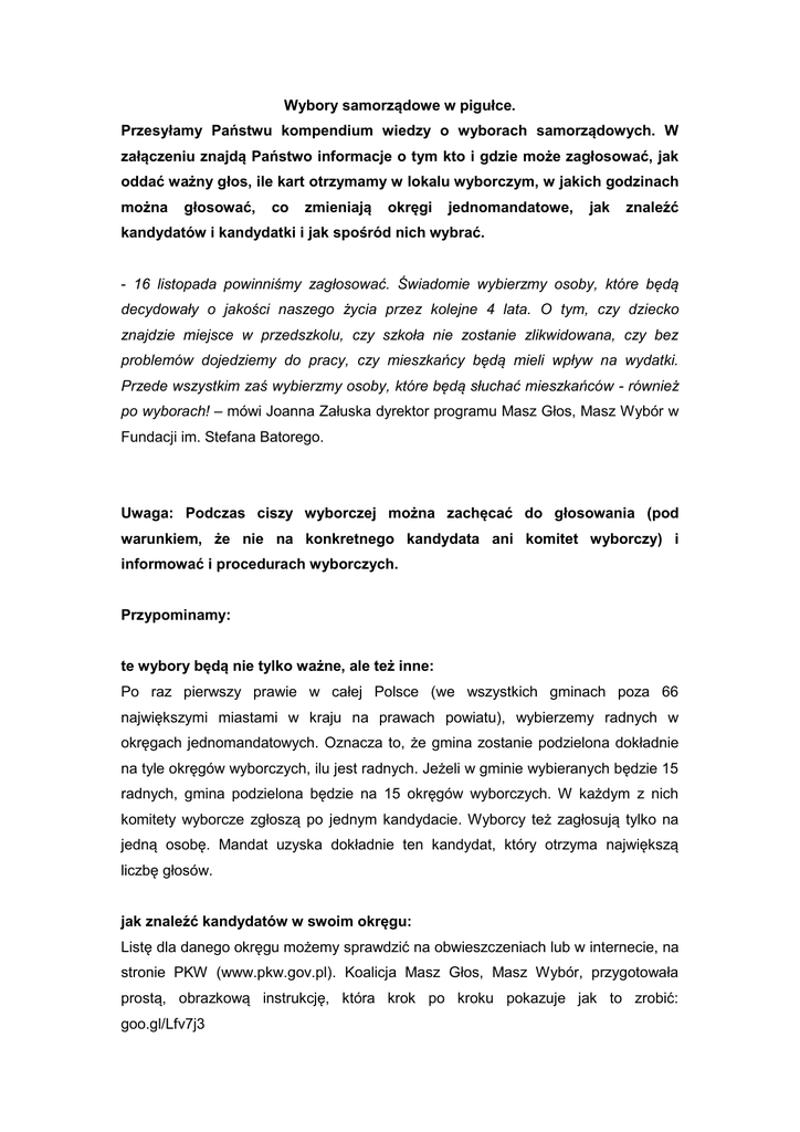 Wybory samorządowe w pigułce. Przesyłamy Państwu kompendium wiedzy o wyborach samorządowych. W załączeniu znajdą Państwo informacje o tym kto i gdzie może zagłosować, jak oddać ważny głos, ile kart otrzymamy w lokalu wyborczym, w jakich godzinach można głosować, co zmieniają okręgi jednomandatowe, jak znaleźć kandydatów i kandydatki i jak spośród nich wybrać. - 16 listopada powinniśmy zagłosować. Świadomie wybierzmy osoby, które będą decydowały o jakości naszego życia przez kolejne 4 lata. O tym, czy dziecko znajdzie miejsce w przedszkolu, czy szkoła nie zostanie zlikwidowana, czy bez problemów dojedziemy do pracy, czy mieszkańcy będą mieli wpływ na wydatki. Przede wszystkim zaś wybierzmy osoby, które będą słuchać mieszkańców - również po wyborach! – mówi Joanna Załuska dyrektor programu Masz Głos, Masz Wybór w Fundacji im. Stefana Batorego. Uwaga: Podczas ciszy wyborczej można zachęcać do głosowania (pod warunkiem, że nie na konkretnego kandydata ani komitet wyborczy) i informować i procedurach wyborczych. Przypominamy: te wybory będą nie tylko ważne, ale też inne: Po raz pierwszy prawie w całej Polsce (we wszystkich gminach poza 66 największymi miastami w kraju na prawach powiatu), wybierzemy radnych w okręgach jednomandatowych. Oznacza to, że gmina zostanie podzielona dokładnie na tyle okręgów wyborczych, ilu jest radnych. Jeżeli w gminie wybieranych będzie 15 radnych, gmina podzielona będzie na 15 okręgów wyborczych. W każdym z nich komitety wyborcze zgłoszą po jednym kandydacie. Wyborcy też zagłosują tylko na jedną osobę. Mandat uzyska dokładnie ten kandydat, który otrzyma największą liczbę głosów. jak znaleźć kandydatów w swoim okręgu: Listę dla danego okręgu możemy sprawdzić na obwieszczeniach lub w internecie, na stronie PKW (www.pkw.gov.pl). Koalicja Masz Głos, Masz Wybór, przygotowała prostą, obrazkową instrukcję, która krok po kroku pokazuje jak to zrobić: goo.gl/Lfv7j3 aby dobrze wybrać kandydata lub kandydatkę sprawdź: czy pomysły i plany, zamieszczone w programie wyborczym odpowiadają ci. czy kandydat lub kandydatka wie jakie kompetencje ma samorząd i co za tym idzie – czy jego/jej obietnice wyborcze, są możliwe do spełnienia. Na www.maszglos.pl znajdziesz ściągę za co odpowiada samorząd. czym do tej pory zajmowal/ła się kandydat lub kandydatka, czy mają doświadczenie, które będzie przydatne w pracy na rzecz mieszkańców czy są otwarci na rozmowę z wyborcami. Jeśli kandydat lub kandydatka nie chce rozmawiać z wyborcami, to czy jako radny znajdzie czas i chęci aby kontaktować się z mieszkańcami? W czym możemy pomóc? Umożliwić kontakt z ekspertami i prawnikami Dostarczyć dane dotyczące samorządów i wyborów samorządowych w Polsce Udostępnić infografiki na temat kompetencji władz samorządowych i wyborów samorządowych Wskazać ciekawe przykłady działań profrekwencyjnych z całej Polski Kontakt: Olga Skarżyńska, [email protected], tel. 22 536 02 62 Marta Gliszczyńska, [email protected], tel. 507 000 835 Magda Oleś, [email protected], tel. 503 012 765 Czym jest Koalicja Masz Głos, Masz Wybór: Celem jej działania jest zachęcanie Polaków do licznego i świadomego udziału w wyborach. Koalicja nie prowadzi agitacji na rzecz określonych opcji politycznych, komitetów wyborczych czy kandydatów. Koalicja Masz Głos, Masz Wybór od lat prowadzi kampanie profrekwencyjne np. „Zmień kraj, idź na wybory” (przed wyborami parlamentarnymi w 2007) i „Pępek Europy” (przed wyborami do Parlamentu Europejskiego w 2009). Dzięki działaniom Koalicji udało się m.in. powstrzymać tendencję spadkową uczestnictwa obywateli w wyborach. Doprowadzono również do zmian w prawie, które umożliwiają: głosowanie poprzez pełnomocników osobom niepełnosprawnym i po 75 roku życia, głosowanie korespondencyjne dla osób niepełnosprawnych, zastosowanie nakładek na karty do głosowania dla osób niewidomych, głosowanie w wybranym lokalu wyborczym, dostosowanym do potrzeb osób niepełnosprawnych. Członkowie koalicji: Fundacja im. Stefana Batorego (koordynuje prace Koalicji), Centrum Edukacji Obywatelskiej, Forum Obywatelskiego Rozwoju FOR, Fundacja Projekt: Polska, Fundacja Rozwoju Społeczeństwa Informacyjnego, Instytut Spraw Publicznych, Izba Gospodarcza Reklamy Zewnętrznej, Izba Wydawców Prasy, Polska Fundacja im. Roberta Schumana, Konfederacja Lewiatan, Stowarzyszenie Komunikacji Marketingowej SAR, Stowarzyszenie Prasy Lokalnej, Stowarzyszenie Przyjaciół Integracji, Stowarzyszenie Szkoła Liderów.
