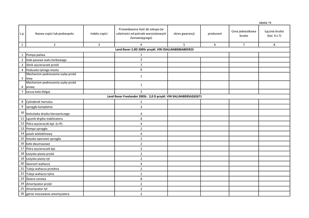 tabela 14 L.p. Nazwa części lub podzespołu indeks części 1 2 3 Przewidywana ilość do zakupu (w zależności od potrzeb warsztatowych Zamawiającego) 4 5 Land Rover 2.0D 2005r przykł. VIN SALLNABE86A805923 1 Pompa paliwa 1 2 Koło pasowe wału korbowego 2 3 Silnik wycieraczek przód 1 4 Poduszka tylnego mostu Mechanizm podnoszenia szyby przód 5 lewy Mechanizm podnoszenia szyby przód 6 prawy 6 7 tarcza koła (felga) okres gwarancji 1 1 2 Land Rover Freelander 2003r. 2,0 D przykł. VIN SALLNABE83A262671 8 Cylinderek hamulca 9 sprzęgło kompletne 2 10 Końcówka drażka kierowniczego 11 Łącznik drążka stabilizatora 4 12 Pióra wycieraczki kpl. (L+P) 13 Pompa sprzęgła 4 14 pasek wieloklinowy 15 łożysko oporowe sprzęgła 4 16 koło dwumasowe 17 Pióra wycieraczek kpl. 2 18 Łożysko piasty przód 19 Łożysko piasty tył 2 20 Sworzeń wahacza 21 Tuleja wahacza przednia 4 22 Tuleja wahacza tylna 23 Świece żarowa 2 24 Amortyzator przód 25 Amortyzator tył 2 26 górne mocowanie amortyzatora 2 3 6 2 2 2 2 2 8 2 producent Cena jednostkowa brutto Łącznie brutto (kol. 4 x 7) 6 7 8 27 sprężyna zawieszenia przód 28 sprężyna zawieszenia tył 2 29 chłodnica wody 30 wentylator chlodnicy 1 31 opornik dmuchawy 32 tarcza koła (felga) 1 33 34 2 1 2 Końcówka drażka kierowniczego prawa 2 Końcówka drążka kierowniczego lewa 2 35 Drążek kierowniczy 2 RAZEM BRUTTO ……………………………… pieczęć i podpis Wykoanwcy lub osoby upoważnionej