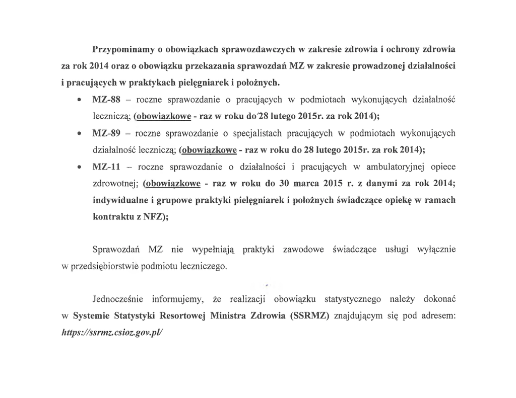 Przypominamy o obowiązkach sprawozdawczych w zakresie zdrowia i ochrony zdrowia za rok 2014 oraz o obowiązku przekazania sprawozdań MZ w zakresie prowadzonej działalności i pracujących w praktykach pielęgniarek i położnych. o MZ-88 - roczne sprawozdanie o pracujących w podmiotach wykonujących działalność leczniczą (obowiązkowe - raz w roku do'28 lutego 2015r. za rok 2014); o MZ-89 - roczne sprawozdanie o specjalistach pracujących w podmiotach wykonujących działalność leczniczą; (obowiązkowe - raz w roku do 28 lutego 2015r. za rok 2014); e MZ-11 - roczne sprawozdanie o działalności i pracujących w ambulatoryjnej opiece zdrowotnej; (obowiązkowe - raz w roku do 30 marca 2015 r. z danymi za rok 2014; indywidualne i grupowe praktyki pielęgniarek i położnych świadczące opiekę w ramach kontraktu z NFZ); Sprawozdań MZ nie wypełniają praktyki zawodowe świadczące usługi wyłącznie statystycznego należy dokonać w przedsiębiorstwie podmiotu leczniczego. Jednocześnie informujemy, że realizacji obowiązku w Systemie Statystyki Resortowej Ministra Zdrowia (SSRMZ) znajdującym się pod adresem: https ://ssrmz. csioz.gov.pl/ Dla praktyk zawodowych o liczbie pracujących nie większej niż 5 osób dopuszczalne jest przekazywanie danych na formularzach MZ w formie papierowej do Śląskiego Urzędu Wojewódzkiego w Katowicach, ul. Jagiellońska 25,40-032 Katowice. Szczegółowe informacje dostępne są na stronach internetowych: - Śląskiego Urzędu Wojewódzkiego w Katowicach www.katowice.uw.gov.pl/wdznnsoz/Sprawozdawczosc_statystyczna.html - Centrum Systemów Informacyjnych Ochrony Zdrowia w Warszawie http://www.csioz.gov.pl/statystyka.php Obowiązek udziału w badaniach statystycznych wynika z przepisów ustawy z dnia 29 czerwca 1995r. o statystyce publicznej (t.j. Dz. U. z 2012 r. poz. 591 z późn. zm.), art. 56 wymienionej ustawy mówi: „Kto wbrew obowiązkowi odmawia wykonania obowiązku statystycznego albo udzielenia informacji w spisie powszechnym lub innym badaniu statystycznym podlega grzywnie”, nierzetelne lub nieterminowe wykonywanie obowiązków sprawozdawczych zagrożone jest również zastosowaniem sankcji, wynikających z cytowanej wyżej ustawy. W załączeniu przekazuję również informacje przekazane przez Ministerstwo Zdrowia odnośnie uwzględnienia przy zakupie oprogramowania wymogu spełniania krajowych ram interoperacyjności przez nabywane składniki majątku oraz wymogi określone w przepisach rozporządzenia Ministra Zdrowia z dnia 21 grudnia 2010r. w sprawie rodzajów i zakresu dokumentacji medycznej oraz sposobu jej przetwarzania (Dz.U. 2014r. poz. 177 j.t., z późn. zm.). / Załącznik: 1. Pismo M inistra Zdrowia z dnia 16 października 2014r. znak MZ-PP-W PS-075-3/W K/14 (2 strony). Z poważaniem 8 M ? Ż 4 8 3 9 4 /M W P fś L A S K I URZĄD WOJEW ÓDZKI Minister Z drow ilANCELAR1A [ Wpt.dn. 20 “ 10- 201^ Warszawa, 16-10-2014 r. Zał. M a rio la K o z ik MŻ-PP-WPS-075-3/WK/14 Panie/Panowie Wojewodowie ¡wg rozdzielnika/ Na podstawie art. 3 ust. 2 ustawy z dnia 28 kwietnia 2011 r. o systemie informacji w ochronie zdrowia (Dz. U. z 2011 r. Nr 117, poz, 657, z późn. zm.) zwracam się do Państwa Wojewodów z uprzejmą prośbą o skierowanie, na podstawie art. 106 ustawy z dnia 15 kwietnia 2011 r. o działalności leczniczej (Dz. U. z 2013 r. poz. 217 j.t., z późn. zm.), w do kierowników podmiotów wykonujących dźlałalność leczniczą podległym Państwu oprogramowania województwie, wymogu spełniania prośby krajowych o uwzględnianie ram przy zakupie interoperacyjności przez nabywane składniki majątku, w rozumieniu rozporządzenia Rady Ministrów z dnia 12 kwietnia 2012 r. w sprawie wprowadzenia Krajowych Ram Interoperacyjności oraz minimalnych wymagań dla rejestrów publicznych i wymiany informacji w postaci elektronicznej oraz minimalnych wymagań dla systemów teleinformatycznych (Dz. U. z 2012. poz. 526), w celu przygotowania w podmiotach leczniczych bazy teleinformatycznej umożliwiającej, w ramach Systemu Informacji Medycznej (SIM) wprowadzenie w przyszłości dokumentacji pielęgniarskiej w postaci elektronicznej, wykorzystującej standardy Międzynarodowej Klasyfikacji Praktyki Pielęgniarskiej (iCNP). Wdrażane i użytkowane, przez podmioty wykonujące działalność leczniczą programy informatyczne powinny również spełniać wymogi określone w przepisach rozporządzenia Ministra Zdrowia z dnia 21 grudnia 2010 r. w sprawie rodzajów i zakresu dokumentacji medycznej oraz sposobu jej przetwarzania (Dz. U. 2014 r. poz. Miiiistaislwo Z ifiiw ia TelBlui. (22) 634 96 00 ul. Miodowa 15 e-mail: [email protected] 00-952 Warszawa www.mz.gov.pl AAZ 177 j.t., z późn. zm.) wydanego na podstawie art. 30 ust. 1 ustawy z dnia 6 listopada 2008 r. o prawach pacjenta i Rzeczniku Praw Pacjenta (Dz. U. z 2012 r. poz. 159 i 742 oraz z 2013 r. poz. 1245). W przepisach rozporządzenia zostały określone m.in. sposoby prowadzenia dokumentacji, w tym wymogi dotyczące prowadzenia dokumentacji indywidualnej wewnętrznej zawierającej w szczególności kartę indywidualnej opieki pielęgniarskiej oraz kartę indywiduaJnej opieki prowadzonej przez położną, obejmującą informacje dotyczące stanu zdrowia i przebiegu choroby oraz procesu diagnostycznego, leczniczego, pielęgnacyjnego lub rehabilitacji, a także opis udzielonych świadczeń zdrowotnych. W tej sprawie, pismem z dnia 17 września 2014 r. Przewodnicząca Rady do spraw e-Zdrowie w Pielęgniarstwie przy Centrum Systemów Informacyjnych Ochrony Zdrowia (CSIOZ), powołanej . w celu przygotowania minimalnego zbioru danych o pielęgniarstwie (NMDS) dla potrzeb polityki zdrowotnej w Polsce, poinformowała Ministerstwo Zdrowia współpracujące z o podjętych nią zespoły, i zrealizowanych, przez ww. czynnościach zmierzających Radę oraz do zastosowania w dokumentowaniu pracy pielęgniarek I położnych ICNP. W ramach prac Rada ds. e-Zdrowia wydała m.in. reko
