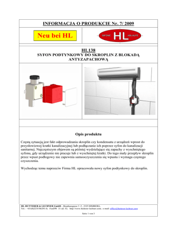 INFORMACJA O PRODUKCIE Nr. 7/ 2009 Neu bei HL HL138 SYFON PODTYNKOWY DO SKROPLIN Z BLOKADĄ ANTYZAPACHOWĄ Opis produktu Częstą sytuacją jest fakt odprowadzania skroplin czy kondensatu z urządzeń wprost do przysłowiowej kratki kanalizacyjnej lub podłączanie ich poprzez syfon do kanalizacji sanitarnej. Najczęstszym objawem są później wydzielające się zapachy z wyschniętego syfonu, gdy urządzenie nie pracuje lub z wyschniętej kratki. Do tego mały przepływ skroplin przez wpust podłogowy nie zapewnia samooczyszczenia się wpustu i wymaga częstego czyszczenia. Wychodząc temu naprzeciw Firma HL opracowała nowy syfon podtynkowy do skroplin. HL HUTTERER & LECHNER GmbH. , Brauhausgasse 3 -5 , 2325 HIMBERG, Tel.: +43/(0)2235/86291-0; FaxDW 31 od. 52; http://www.hutterer-lechner.com; e-mail: [email protected] Seite 1 von 3 Cechy produktu: • Zabudowa: Montaż w ścianie, ze specjalną obudową do ściany, skracalną ze wzgledu na grubośc ściany i np. płytek naściennych. Z deklem koloru białego. • Obsługa i czyszczenie: 1. Łatwo ściągalny dekiel 2. Wyciągalna kaseta z kulką antyzapachową, przy jej wyjęciu nie wylewa się woda z syfonu – tak jest skonstruowany 3. Łatwe czyszczenie kasety w przypadkach szczególnego zabrudzenia wymiana na nową w prosty sposób. • Bezzapachowy? Przy wyschnięciu zasyfonowania w środku znajduje się kulka opadająca na szczelne posadowienie, uniemożliwiając wydzielanie się zapachów • Przyłącza: Elastyczna złączka przejściowa Ø20- Ø32mm umożliwia bezproblemowe podłączenie. Odpływ DN32. • Przepływ – 0,15l/s (9 l/min). HL138K HL01096D → Korpus syfonu, Przyłącza DN32 Materiał PP, Zawiera 1 Szt. 01096D Gumową redukcję (Ø20- Ø32mm) HL0138.1E Obudowa montażowa do ściany regulowalna, Materiał PP, HL0138.2E Dekiel 110x110mm Materiał ABS HL HUTTERER & LECHNER GmbH. , Brauhausgasse 3 -5 , 2325 HIMBERG, Tel.: +43/(0)2235/86291-0; FaxDW 31 od. 52; http://www.hutterer-lechner.com; e-mail: [email protected] Seite 2 von 3 HL0138.3E Kaseta syfonu Materiał ABS Zawiera 2 Szt. złączek 01097D. HL01097D → HL01096D Redukcja gumowa (Ø20- Ø32mm) - 1 Szt. HL01097D Gumowe złączki (zu HL0138.3E) – 2 Szt. Opakowania: ; 10 Szt. w kartonie; Waga: HL138: Netto 0,27kg EAN-Code: 9003076030705 Cena katalogowa: 104 zł netto HL HUTTERER & LECHNER GmbH. , Brauhausgasse 3 -5 , 2325 HIMBERG, Tel.: +43/(0)2235/86291-0; FaxDW 31 od. 52; http://www.hutterer-lechner.com; e-mail: [email protected] Seite 3 von 3
