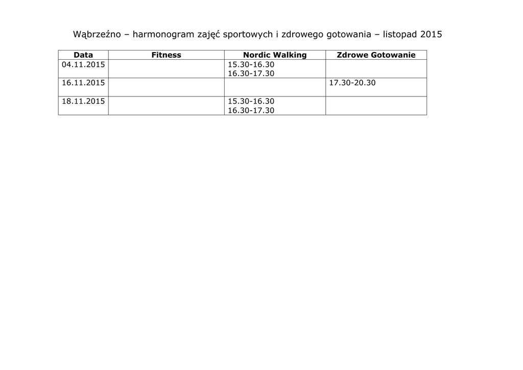 Wąbrzeźno – harmonogram zajęć sportowych i zdrowego gotowania – listopad 2015 Data 04.11.2015 Fitness Nordic Walking 15.30-16.30 16.30-17.30 16.11.2015 18.11.2015 Zdrowe Gotowanie 17.30-20.30 15.30-16.30 16.30-17.30