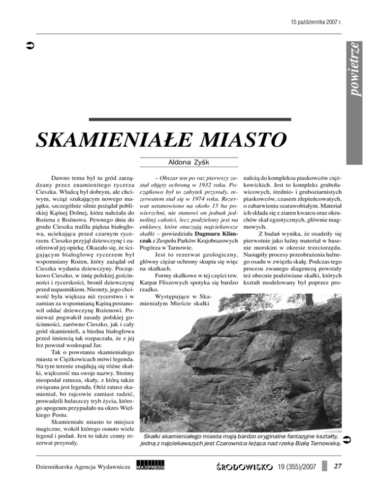 15 paŸdziernika 2007 r. powietrze  SKAMIENIA£E MIASTO Aldona Zyœk Dawno temu by³ tu gród zarz¹dzany przez znamienitego rycerza Cieszka. W³adc¹ by³ dobrym, ale chciwym, wci¹¿ szukaj¹cym nowego maj¹tku, szczególnie silnie po¿¹da³ pobliskiej K¹œnej Dolnej, która nale¿a³a do Ro¿ena z Ro¿nowa. Pewnego dnia do grodu Cieszka trafi³a piêkna bia³og³owa, uciekaj¹ca przed czarnym rycerzem. Cieszko przyj¹³ dziewczynê i zaoferowa³ jej opiekê. Okaza³o siê, ¿e œcigaj¹cym bia³og³owê rycerzem by³ wspomniany Ro¿en, który za¿¹da³ od Cieszka wydania dziewczyny. Pocz¹tkowo Cieszko, w imiê polskiej goœcinnoœci i rycerskoœci, broni³ dziewczynê przed napastnikiem. Niestety, jego chciwoœæ by³a wiêksza ni¿ rycerstwo i w zamian za wspomnian¹ K¹œn¹ postanowi³ oddaæ dziewczynê Ro¿enowi. Poniewa¿ pogwa³ci³ zasady polskiej goœcinnoœci, zarówno Cieszko, jak i ca³y gród skamienieli, a biedna bia³og³owa przed œmierci¹ tak rozpacza³a, ¿e z jej ³ez powsta³ wodospad Jar. Tak o powstaniu skamienia³ego miasta w Ciê¿kowicach mówi legenda. Na tym terenie znajduj¹ siê ró¿ne ska³ki, wiêkszoœæ ma swoje nazwy. Stoimy nieopodal ratusza, ska³y, z któr¹ tak¿e zwi¹zana jest legenda. Otó¿ ratusz skamienia³, bo rajcowie zamiast radziæ, prowadzili hulaszczy tryb ¿ycia, którego apogeum przypada³o na okres Wielkiego Postu. Skamienia³e miasto to miejsce magiczne, wokó³ którego osnuto wiele legend i podañ. Jest to tak¿e cenny rezerwat przyrody. Dziennikarska Agencja Wydawnicza – Obszar ten po raz pierwszy zosta³ objêty ochron¹ w 1932 roku. Pocz¹tkowo by³ to zabytek przyrody, rezerwatem sta³ siê w 1974 roku. Rezerwat ustanowiono na oko³o 15 ha powierzchni, nie stanowi on jednak jednolitej ca³oœci, lecz podzielony jest na enklawy, które otaczaj¹ najciekawsze ska³ki – powiedzia³a Dagmara Klimczak z Zespo³u Parków Krajobrazowych Pogórza w Tarnowie. Jest to rezerwat geologiczny, g³ówny ciê¿ar ochrony skupia siê wiêc na ska³kach. Formy ska³kowe w tej czêœci tzw. Karpat Fliszowych spotyka siê bardzo rzadko. Wystêpuj¹ce w Skamienia³ym Mieœcie ska³ki nale¿¹ do kompleksu piaskowców ciê¿kowickich. Jest to kompleks grubo³awicowych, œrednio- i gruboziarnistych piaskowców, czasem zlepieñcowatych, o zabarwieniu szarawobia³ym. Materia³ ich sk³ada siê z ziaren kwarcu oraz okruchów ska³ egzotycznych, g³ównie magmowych. Z badañ wynika, ¿e osadzi³y siê pierwotnie jako luŸny materia³ w basenie morskim w okresie trzeciorzêdu. Nast¹pi³y procesy przeobra¿enia luŸnego osadu w zwiêz³a ska³ê. Podczas tego procesu zwanego diagenez¹ powsta³y te¿ obecnie podziwiane ska³ki, których kszta³t modelowany by³ poprzez pro- Ska³ki skamienia³ego miasta maj¹ bardzo oryginalne fantazyjne kszta³ty, jedn¹ z najciekawszych jest Czarownica le¿¹ca nad rzek¹ Bia³¹ Tarnowsk¹. ŒRODOWISKO 19 (355)/2007  27 15 paŸdziernika 2007 r. przyroda  cesy wietrzenia przez setki lat. Ska³ki skamienia³ego miasta maj¹ bardzo oryginalne fantazyjne kszta³ty, jedn¹ z najciekawszych jest Czarownica le¿¹ca nad rzek¹ Bia³¹ Tarnowsk¹. Wysokoœæ tej ska³y od strony rzeki Bia³ej siêga 13 m, a jej górna czêœæ wygl¹da jak profil baœniowej czarownicy, z wyraŸnie wykszta³conymi oczodo³ami, zakrzywionym, d³ugim nosem i podbródkiem. Za czasów legendarnego miasta by³o tu wiêzienie, w którym trzymano najgorszych ³otrów z ca³ej okolicy. Gdy wiêzienie skamienia³o wraz z ca³ym miastem, uradowane diab³y nada³y mu w³aœnie taki kszta³t. Inna legenda mówi, ¿e jest to czarownica, która zosta³a zamieniona w ska³ê, poniewa¿ z³orzeczy³a dzia³a Dagmara Klimczak. K³adka to nie jedyna inwestycja, która zosta³a wykonana w rezerwacie w ramach projektu ochrona walorów przyrodniczych rezerwatu skamienia³e miasto, ze szczególnym uwzglêdnieniem brio- i lichenofauny oraz hieropterofauny. Ta doœæ obco brzmi¹ca nazwa projektu oznacza, ¿e w jego ramach prowadzono ochronê mchów, porostów i nietoperzy. Sponsorem strategicznym projektu by³a Fundacja EkoFundusz. Jak ju¿ wspomnia³am, k³adka to jedno z najbardziej spektakularnych dzia³añ, lecz nie jedyne, podjêto próbê uporz¹dkowania ruchu turystycznego i skierowania go w miejsca najmniej nara¿one na niekorzystne oddzia³ywanie na œrodowisko. Wykonano takie ele- Aby zwiedzanie rezerwatu by³o bezpieczne zarówno dla zwiedzaj¹cych, jak i dla przyrody, wykonano szereg prac, z których najwa¿niejsza to budowa k³adki nad bardzo ruchliw¹ i niebezpieczn¹ drog¹. ksiêdzu jad¹cemu do ciê¿ko chorego menty infrastruktury turystycznej, jak cz³owieka. m.in. ³awki sto³y, kosze na œmieci, schoDo Czarownicy trzeba by³o prze- dy skarpowe i barierki ochronne. chodziæ z parkingu przez ruchliw¹ uliUwagê zwiedzaj¹cych przykucê. waj¹ te¿ oryginalnie tablice informa– Aby zwiedzanie rezerwatu by³o cyjne, wykonane przez miejscowego bezpieczne zarówno dla zwiedzaj¹cych, artystê rzeŸbiarza Stanis³awa Sochê. jak i dla przyrody, wykonano szereg Rezerwat czêsto odwiedzaj¹ grupy zorprac, z których najwa¿niejsza to budo- ganizowane, dlatego przygotowano te¿ wa k³adki nad bardzo ruchliw¹ i nie- miejsce wypoczynkowo-rekreacyjne bezpieczn¹ drog¹. Pomys³odawc¹ k³ad- (mo¿liwoœæ rozpalenia ogniska, wypoki by³ wiceprezes EkoFunduszu Stani- czynek na ³awkach itp.). s³aw Sitnicki. Zosta³a te¿ wybudowa–Zosta³y tak¿e przeprowadzone na podwieszana platforma, z której zabiegi pielêgnacyjne w rezerwacie, mo¿na ogl¹daæ dolinê Bia³ej – powie- pas wokó³ ska³ek zosta³ oczyszczony z 28 ŒRODOWISKO 19 (355)/2007 krzewów i odroœli gatunków liœciastych, usuniêto z³omy, wykroty i ga³êzie z trasy œcie¿ki dydaktycznej – powiedzia³a Dagmara Klimczak i doda³a: – Nasza inwestycja zmobilizowa³a tak¿e gminê do podjecia dzia³añ. Gminie uda³o siê pozyskaæ dofinansowanie z funduszu europejskiego n