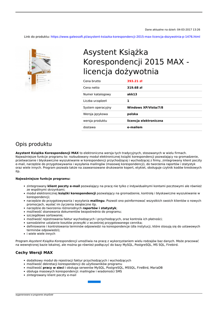 Dane aktualne na dzień: 04-03-2017 13:26 Link do produktu: https://www.galeosoft.pl/asystent-ksiazka-korespondencji-2015-max-licencja-dozywotnia-p-1476.html Asystent Książka Korespondencji 2015 MAX licencja dożywotnia Cena brutto 393.21 zł Cena netto 319.68 zł Numer katalogowy akk13 Liczba urządzeń 1 System operacyjny Windows XP/Vista/7/8 Wersja językowa polska wersja produktu licencja elektroniczna dostawa e-mailem Opis produktu Asystent Książka Korespondencji MAX to elektroniczna wersja tych tradycyjnych, stosowanych w wielu firmach. Najważniejsze funkcje programu to: rozbudowany moduł elektronicznej książki korespondencji pozwalający na gromadzenie, przetwarzanie i błyskawiczne wyszukiwanie w korespondencji przychodzącej i wychodzącej z firmy, zintegrowany klient poczty e-mail, narzędzie do przygotowywania i wysyłania mailingów (masowej korespondencji), do tworzenia raportów i statystyk oraz wiele innych. Program pozwala także na zaawansowane drukowanie kopert, etykiet, obsługuje czytnik kodów kreskowych itp. Najważniejsze funkcje programu: zintegrowany klient poczty e-mail pozwalający na pracę nie tylko z indywidualnymi kontami pocztowymi ale również ze wspólnymi skrzynkami; moduł elektronicznej książki korespondencji pozwalający na gromadzenie, kontrolę i błyskawiczne wyszukiwanie w korespondencji; narzędzie do przygotowywania i wysyłania mailingu. Pozwoli ono poinformować wszystkich swoich klientów o nowych promocjach, wysłać im życzenia świąteczne itp. narzędzie do tworzenia różnorodnych raportów i statystyk; możliwość skanowania dokumentów bezpośrednio do programu; szczegółowe sortowanie; możliwość rejestrowania faktur wychodzących i przychodzących, oraz kontrola ich płatności; samodzielne ustalanie kosztów przesyłki z wcześniej przygotowanego cennika; definiowanie i kontrolowania terminów odpowiedzi na korespondencje (dla instytucji, które stosują się do ustawowych terminów odpowiedzi); i wiele wiele innych Program Asystent Książka Korespondencji umożliwia na pracę z wykorzystaniem wielu rodzajów baz danych. Może pracować na wewnętrznej bazie lokalnej, ale można go również podłączyć do bazy MySQL, PostgreSQL, MS SQL, Firebird. Cechy Wersji MAX dodatkowy moduł do rejestracji faktur przychodzących i wychodzących możliwość dekretacji korespondencji do użytkowników programu możliwość pracy w sieci i obsługa serwerów MySQL, PostgreSQL, MSSQL, FireBird, MariaDB obsługa masowych korespondencji: mailingów i wiadomości SMS zintegrowany klient poczty e-mail wygenerowano w programie shopGold Moduł/Funkcja Opcje Rozbudowane informacje o firmie Obsługa grup/kategorii Zarządzanie użytkownikami Zarządzanie symbolami dokumentów (numeracja ciągła, miesięczna, roczna) Przypomnienia Logi systemowe Obsługa załączników Oznaczanie rekordów kolorem Baza wiedzy Tworzenie kopii bezpieczeństwa Wysyłanie wiadomości do użytkowników Szyfrowanie plików konfiguracyjnych Statystyki Praca z urządzeń USB (portable) Brak limitów na ilość baz danych System masowych SMS-ów Zarządzanie etatami Możliwość edycji wydruków wygenerowano w programie shopGold PRO BIZNES MAX Stałe komentarze na dokumentach Import bezpośrednio do wybranej kategorii Przeszukiwanie raportów zmian Nadawanie wyjątków (uprawnień) dla użytkowników Obsługa baz zdalnych (MySQL, MariaDB, PostgreSQL, MSSQL 2010/2012, Firebird), możliwość pracy przez internet Zarządzanie oddziałami firmy System mailingowy Powiadomienia SMS Odtwarzania kopii bezpieczeństwa w innych silnikach bazodanowych *Ukrywanie statystyk, cen zakupu (dla modułów sprzedażowych) Ograniczenie widoku użytkownika do zadanej liczby rekordów Możliwość przenoszenia uprawnień na innych użytkowników Moduł: Skrzynka pocztowa Obsługa dowolnie wielu kont pocztowych Możliwość podglądu /danych ko ntaktowych/faktur/produktów/ z poziomu wiadomości Obsługa ticketów Możliwość pracy na wspólnej skrzynce pocztowej Moduł: Dane kontaktowe wygenerowano w programie shopGold Obsługa dowolnie wielu kontrahentów i osób Możliwość dowolnego grupowania danych kontaktowych Tworzenie kategorii Raport zmian Możliwość przypisywania pracowników do wprowadzonych firm Możliwość tworzenia oddziałów w ramach kontrahentów Możliwość przekazania danych osobowych wg. wytycznych GIODO Generalny Inspektor Ochrony Danych Osobowych Moduł: Książka Korespondencji Tworzenie kategorii Możliwość tworzenia odrębnej numeracji dla oddziałów Raport zmian Dekretacja korespondencji *Możliwość rozbudowy programu o dostęp online klientów przez stronę WWW + Asystent [sprawdź ofertę] MożliwośćCMS prowadzenia rejestru faktur Możliwość wysyłania korespondencji w imieniu zleceniodawcy Statystyki dla klientów i użytkowników Dekretacja korespondencji na oddziały oraz na pracowników (z Akt osobowych) Moduł: Historia kontaktów wygenerowano w programie shopGold Tworzenie kategorii Raport zmian Moduł: Projekty Tworzenie kategorii Raport zmian Wypowiedzi do projektów *Możliwość rozbudowy programu o dodawanie historii kontaktów do projektów online, dostęp klientów przez stronę WWW + Asystent CMS [sprawdź ofertę] Galerie Uprawnienia dostępu dla wybranych użytkowników Moduł: Raporty i statystyki * - dla poszczególnych modułów Raporty Kasowe (*wymagany moduł Dokumenty Kasowe) Rejestr VAT (* wymagany modułu Faktur) Sprzedaż i zakupy (* wymagany modułu Faktur) Sprzedaż i zakupy (towary) (* wymagany modułu Faktur) Zysk ze sprzedaży (* wymagany modułu Faktur) Spis z natury (* wymagany modułu Faktur) Raport zmian wygenerowano w programie shopGold Rozliczenie finansów Dokumenty Kasowe roczny (* wymagany moduł Dokumenty Kasowe) Zestawienie nadanych przesyłek (* wymagany modułu Książki Korespondencji) Rozliczenie prowizji dla pracowników (* wymagany modułu Faktur) Raport sprzedaży dla partnerów (* wymagany m