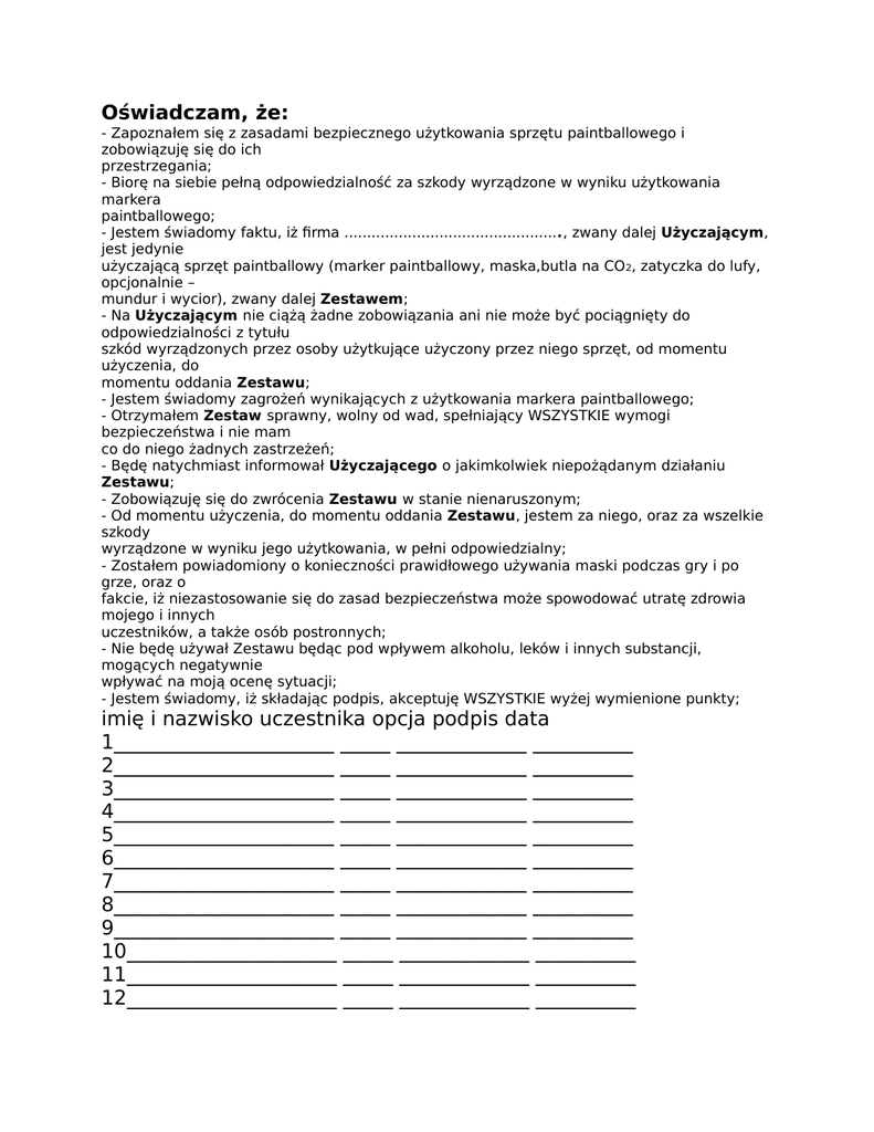 Oświadczam, że: - Zapoznałem się z zasadami bezpiecznego użytkowania sprzętu paintballowego i zobowiązuję się do ich przestrzegania; - Biorę na siebie pełną odpowiedzialność za szkody wyrządzone w wyniku użytkowania markera paintballowego; - Jestem świadomy faktu, iż firma ................................................, zwany dalej Użyczającym, jest jedynie użyczającą sprzęt paintballowy (marker paintballowy, maska,butla na CO 2, zatyczka do lufy, opcjonalnie – mundur i wycior), zwany dalej Zestawem; - Na Użyczającym nie ciążą żadne zobowiązania ani nie może być pociągnięty do odpowiedzialności z tytułu szkód wyrządzonych przez osoby użytkujące użyczony przez niego sprzęt, od momentu użyczenia, do momentu oddania Zestawu; - Jestem świadomy zagrożeń wynikających z użytkowania markera paintballowego; - Otrzymałem Zestaw sprawny, wolny od wad, spełniający WSZYSTKIE wymogi bezpieczeństwa i nie mam co do niego żadnych zastrzeżeń; - Będę natychmiast informował Użyczającego o jakimkolwiek niepożądanym działaniu Zestawu; - Zobowiązuję się do zwrócenia Zestawu w stanie nienaruszonym; - Od momentu użyczenia, do momentu oddania Zestawu, jestem za niego, oraz za wszelkie szkody wyrządzone w wyniku jego użytkowania, w pełni odpowiedzialny; - Zostałem powiadomiony o konieczności prawidłowego używania maski podczas gry i po grze, oraz o fakcie, iż niezastosowanie się do zasad bezpieczeństwa może spowodować utratę zdrowia mojego i innych uczestników, a także osób postronnych; - Nie będę używał Zestawu będąc pod wpływem alkoholu, leków i innych substancji, mogących negatywnie wpływać na moją ocenę sytuacji; - Jestem świadomy, iż składając podpis, akceptuję WSZYSTKIE wyżej wymienione punkty; imię i nazwisko uczestnika opcja podpis data 1______________________ _____ _____________ __________ 2______________________ _____ _____________ __________ 3______________________ _____ _____________ __________ 4______________________ _____ _____________ __________ 5______________________ _____ _____________ __________ 6______________________ _____ _____________ __________ 7______________________ _____ _____________ __________ 8______________________ _____ _____________ __________ 9______________________ _____ _____________ __________ 10_____________________ _____ _____________ __________ 11_____________________ _____ _____________ __________ 12_____________________ _____ _____________ __________ 13_____________________ 14_____________________ 15_____________________ 16_____________________ 17_____________________ 18_____________________ 19_____________________ 20_____________________ 21_____________________ _____ _____ _____ _____ _____ _____ _____ _____ _____ _____________ _____________ _____________ _____________ _____________ _____________ _____________ _____________ _____________ __________ __________ __________ __________ __________ __________ __________ __________ __________