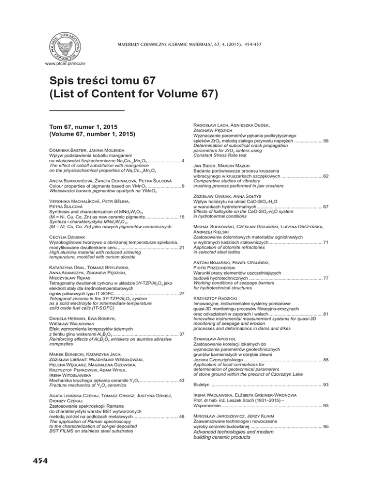 MATERIA£Y CERAMICZNE /CERAMIC MATERIALS/, 67, 4, (2015), 454-457 www.ptcer.pl/mccm Spis treści tomu 67 (List of Content for Volume 67) Tom 67, numer 1, 2015 (Volume 67, number 1, 2015) D B ,J M Wpływ podstawienia kobaltu manganem na właściwości fizykochemiczne NaxCo1-yMnyO2 .......................... 4 The effect of cobalt substitution with manganese on the physicochemical properties of NaxCo1-yMnyO2 A B ,Ž D ,P Š Colour properties of pigments based on YMnO3 .......................... 9 Właściwości barwne pigmentów opartych na YMnO3 V M ,P B , P Š Synthesis and characterization of MNd2W2O10 (M = Ni, Cu, Co, Zn) as new ceramic pigments.......................... 15 Synteza i charakterystyka MNd2W2O10 (M = Ni, Cu, Co, Zn) jako nowych pigmentów ceramicznych C D Wysokoglinowe tworzywo o obniżonej temperaturze spiekania, modyfikowane dwutlenkiem ceru................................................ 21 High alumina material with reduced sintering temperature, modified with cerium dioxide K O ,T B , A A ,Z P , M R Tetragonalny dwutlenek cyrkonu w układzie 3Y-TZP/Al2O3 jako elektrolit stały dla średniotemperaturowych ogniw paliwowych typu IT-SOFC .................................................. 27 Tetragonal zirconia in the 3Y-TZP/Al2O3 system as a solid electrolyte for intermediate-temperature solid oxide fuel cells (IT-SOFC) D H ,E B , W W Efekt wzmocnienia kompozytów ściernych z tlenku glinu wiskerami Al4B2O9 ................................................... 37 Reinforcing effects of Al4B2O9 whiskers on alumina abrasive composites M B ,K J , Z L ,W W , H W ,M G , K P ,A W , I W Mechanika kruchego pękania ceramiki Y2O3 .............................. 43 Fracture mechanics of Y2O3 ceramics A L -C ,T O ,J O , D C Zastosowanie spektroskopii Ramana do charakterystyki warstw BST wytworzonych metodą zol-żel na podłożach metalowych ................................... 48 The application of Raman spectroscopy to the characterization of sol-gel deposited BST FILMS on stainless steel substrates 454 R L ,A D , Z P Wyznaczanie parametrów pękania podkrytycznego spieków ZrO2 metodą stałego przyrostu naprężeń ...................... 56 Determination of subcritical crack propagation parameters for ZrO2 sinters using Constant Stress Rate test J S ,M M Badania porównawcze procesu kruszenia wibracyjnego w kruszarkach szczękowych ................................ 62 Comparative studies of vibratory crushing process performed in jaw crushers Z O ,A S Wpływ haloizytu na układ CaO-SiO2-H2O w warunkach hydrotermalnych ................................................... 67 Effects of halloysite on the CaO-SiO2-H2O system in hydrothermal conditions M S ,C G ,L O , A K Zastosowanie dolomitowych materiałów ogniotrwałych w wybranych kadziach stalowniczych.......................................... 71 Application of dolomite refractories in selected steel ladles A B ,P O , P P Warunki pracy elementów uszczelniających budowli hydrotechnicznych ......................................................... 77 Working conditions of seepage barriers for hydrotechnical structures K R Innowacyjne, instrumentalne systemy pomiarowe quasi-3D monitoringu procesów filtracyjno-erozyjnych oraz odkształceń w zaporach i wałach .......................................... 81 Innovative instrumental measurement systems for quasi-3D monitoring of seepage and erosion processes and deformations in dams and dikes S A Zastosowanie korelacji lokalnych do wyznaczania parametrów geotechnicznych gruntów kamienistych w obrębie zlewni Jeziora Czorsztyńskiego ............................................................. 88 Application of local correlations for determination of geotechnical parameters of stone ground within the precinct of Czorsztyn Lake Biuletyn ....................................................................................... 93 I W ,E G -W Prof. dr hab. inż. Leszek Stoch (1931–2015) – Wspomnienie............................................................................... 93 M J ,J K Zaawansowane technologie i nowoczesne wyroby ceramiki budowlanej ........................................................ 95 Advanced technologies and modern building ceramic products S Tom 67, numer 2, 2015 (Volume 67, number 2, 2015) M P ,J L ,R E Ś Pianki korundowe wytworzone metodą gel-casting przeznaczone do infiltracji polimerami ............................................................. 104 Alumina foams manufactured by the gel-casting method designed for polymer infiltration S J ,A P ,M B ,A C ,G K Mechanizm reakcji tworzenia się heksaglinianiu wapnia w układzie CaAl4O7-Al2O3 ............................................................. 109 The reaction mechanism of calcium hexa-aluminate formation in the CaAl4O7-Al2O3 system W P ,P R ,G G Stałe materiałowe anizotropowych kompozytów Al2O3-hBN ................................................................................ 113 The material constants of anisotropic Al2O3-hBN composites J S ,P T Badania procesu mielenia wibracyjnego węglika krzemu na sucho ......................................................... 117 The investigation of the vibratory dry milling of silicon carbide J S Kruszarki odśrodkowe w procesach drobnego kruszenia .................................................................. 121 Centrifugal crushers in processes of fine crushing A W W ,K B ,M S N C PO4-S O2 ......................................................... 127 Influence of the direct crystallization process on bioactivity of silicate-phosphate glasses from the NaCaPO4-SiO2 system M C ,W H ,P P Ceramika węglikowa w lekkich osłonach balistycznych ............................................................. 132 Carbide ceramics in lightweight armour applications A I ,A H , M M Badanie porowatości oraz właściwości optycznych proszków TiO2-SiO2 z grupami organicznymi ........................................... 137 Porosity and optical properties o