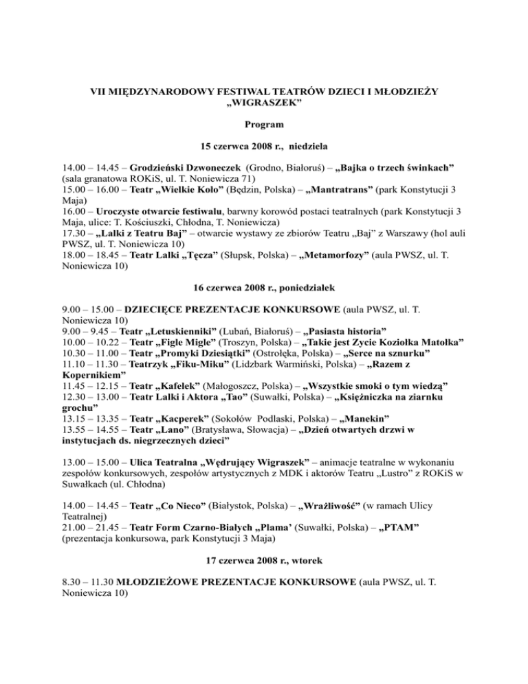 VII MIĘDZYNARODOWY FESTIWAL TEATRÓW DZIECI I MŁODZIEśY „WIGRASZEK” Program 15 czerwca 2008 r., niedziela 14.00 – 14.45 – Grodzieński Dzwoneczek (Grodno, Białoruś) – „Bajka o trzech świnkach” (sala granatowa ROKiS, ul. T. Noniewicza 71) 15.00 – 16.00 – Teatr „Wielkie Koło” (Będzin, Polska) – „Mantratrans” (park Konstytucji 3 Maja) 16.00 – Uroczyste otwarcie festiwalu, barwny korowód postaci teatralnych (park Konstytucji 3 Maja, ulice: T. Kościuszki, Chłodna, T. Noniewicza) 17.30 – „Lalki z Teatru Baj” – otwarcie wystawy ze zbiorów Teatru „Baj” z Warszawy (hol auli PWSZ, ul. T. Noniewicza 10) 18.00 – 18.45 – Teatr Lalki „Tęcza” (Słupsk, Polska) – „Metamorfozy” (aula PWSZ, ul. T. Noniewicza 10) 16 czerwca 2008 r., poniedziałek 9.00 – 15.00 – DZIECIĘCE PREZENTACJE KONKURSOWE (aula PWSZ, ul. T. Noniewicza 10) 9.00 – 9.45 – Teatr „Letuskienniki” (Lubań, Białoruś) – „Pasiasta historia” 10.00 – 10.22 – Teatr „Figle Migle” (Troszyn, Polska) – „Takie jest Zycie Koziołka Matołka” 10.30 – 11.00 – Teatr „Promyki Dziesiątki” (Ostrołęka, Polska) – „Serce na sznurku” 11.10 – 11.30 – Teatrzyk „Fiku-Miku” (Lidzbark Warmiński, Polska) – „Razem z Kopernikiem” 11.45 – 12.15 – Teatr „Kafelek” (Małogoszcz, Polska) – „Wszystkie smoki o tym wiedzą” 12.30 – 13.00 – Teatr Lalki i Aktora „Tao” (Suwałki, Polska) – „KsięŜniczka na ziarnku grochu” 13.15 – 13.35 – Teatr „Kacperek” (Sokołów Podlaski, Polska) – „Manekin” 13.55 – 14.55 – Teatr „Lano” (Bratysława, Słowacja) – „Dzień otwartych drzwi w instytucjach ds. niegrzecznych dzieci” 13.00 – 15.00 – Ulica Teatralna „Wędrujący Wigraszek” – animacje teatralne w wykonaniu zespołów konkursowych, zespołów artystycznych z MDK i aktorów Teatru „Lustro” z ROKiS w Suwałkach (ul. Chłodna) 14.00 – 14.45 – Teatr „Co Nieco” (Białystok, Polska) – „WraŜliwość” (w ramach Ulicy Teatralnej) 21.00 – 21.45 – Teatr Form Czarno-Białych „Plama’ (Suwałki, Polska) – „PTAM” (prezentacja konkursowa, park Konstytucji 3 Maja) 17 czerwca 2008 r., wtorek 8.30 – 11.30 MŁODZIEśOWE PREZENTACJE KONKURSOWE (aula PWSZ, ul. T. Noniewicza 10) 8.30 – 9.10 – Teatr RKT Razem Kochać Tworzyć (Konstancin-Jeziorna, Polska) – „Jedenaste! Miłość” 9.25 – 10.05 – Teatr „Lano” (Bratysława, Słowacja) – „Śpiewy z Kalewali” 10.10 – 10.30 – Teatr M.I.O.D.E.K. (Chorzów, Polska) – „Sensacje XXI wieku, czyli M.I.O.D.E.K. na tropie” 10.40 – 11.05 – Wzorcowy Teatr-Studio „Natchnienie” (Mińsk, Białoruś) – „Wierajacja” 13.00 – 15.00 – Ulica Teatralna „Wędrujący Wigraszek” – animacje teatralne w wykonaniu zespołów konkursowych, zespołów artystycznych z MDK i aktorów Teatru „Lustro” z ROKiS w Suwałkach (ul. Chłodna) 14.00 – 14.30 – Teatr Lalki i Aktora „Tao” (Suwałki, Polska) – „Pan Fajnacki” (w ramach Ulicy Teatralnej) 18 czerwca 2008 r., środa 10.00 – Uroczyste zakończenie festiwalu (aula PWSZ, ul. T. Noniewicza 10) * „Wanted – czyli krótka historia o kowbojach” – spektakl w wykonaniu studentów Akademii Teatralnej im. Aleksandra Zelwerowicza w Białymstoku * wręczenie nagród
