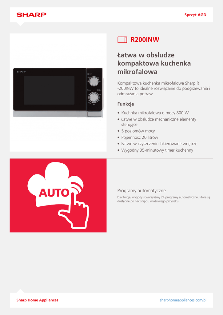 Sprzęt AGD  R200INW Łatwa w obsłudze kompaktowa kuchenka mikrofalowa Kompaktowa kuchenka mikrofalowa Sharp R -200INW to idealne rozwiązanie do podgrzewania i odmrażania potraw Funkcje Kuchnka mikrofalowa o mocy 800 W Łatwe w obsłudze mechaniczne elementy sterujące 5 poziomów mocy Pojemność 20 litrów Łatwe w czyszczeniu lakierowane wnętrze Wygodny 35-minutowy timer kuchenny Programy automatyczne Dla Twojej wygody stworzyliśmy 24 programy automatyczne, które są dostępne po naciśnięciu właściwego przycisku. Sharp Home Appliances sharphomeappliances.com/pl Sprzęt AGD Kluczowe cechy Automatyczne programy pieczenia ciasta Nie Zegar Nie Przycisk "Info" Nie Przycisk "Język" Nie Funkcja plus 1 minuta / +30s No / No Kolor kuchenki Inox Automatyczne programy gotowania i rozmrażania 5 Korekcja ustawień (WIĘCEJ/MNIEJ) Nie Materiał, z którego wykonane jest wnętrze kuchenki Grey paint Tryb pracy połączonej: grill (kwarcowy i w podczerwieni) Nie Automatyczne programy przygotowania pizzy Nie Tryb pracy połączonej: termoobieg + mikrofale No Funkcja podgrzewania Nie Timer (maks. podawanie minut i sekund) 35/00 Średnica talerza obrotowego w cm / materiał 25.5 / Glass Pojemność komory (w litrach) 20 Zakres regulacji temperatury termoobiegu (°C) – Tryb pracy połączonej: grill (kwarcowy lub w podczerwieni) + mikrofale Nie Tryb oszczędzania energii Nie Menu FUN lub automatyczne programy do zakąsek – Sharp Home Appliances sharphomeappliances.com/pl Sprzęt AGD Moc wyjściowa Moc wyjściowa (W) 800 Poziomy mocy mikrofal 5 Termoobieg (W) – Grill kwarcowy (W) – Grill w podczerwieni (W) – Waga (kg) 10.9 kg Mocy, zużycia i napięcia Bezpiecznik źródła zasilania/wyłącznik obwodu (A) 10 Wymiary i waga Wymiary wewnętrzne (szer.) x (wys.) x (gł.) mm 306 x 208.2 x 306.6 Wymiary zewnętrzne (szer.) x (wys.) x (gł.) mm 439.5 x 256.2 x 338.2 Wyposażenie Wysoki ruszt Nie Kwadratowa półka Nie Niski ruszt Nie Kwadratowy pojemnik Nie European article number Kod EAN Sharp Home Appliances Powered by TCPDF (www.tcpdf.org) 4974019756011 sharphomeappliances.com/pl