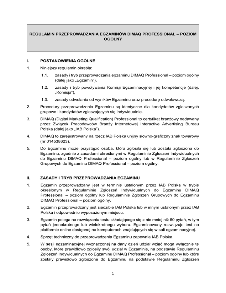 REGULAMIN PRZEPROWADZANIA EGZAMINÓW DIMAQ PROFESSIONAL – POZIOM OGÓLNY I. POSTANOWIENIA OGÓLNE 1. Niniejszy regulamin określa: 1.1. zasady i tryb przeprowadzania egzaminu DIMAQ Professional – poziom ogólny (dalej jako „Egzamin”), 1.2. zasady i tryb powoływania Komisji Egzaminacyjnej i jej kompetencje (dalej: „Komisja”), 1.3. zasady odwołania od wyników Egzaminu oraz procedurę odwoławczą. 2. Procedury przeprowadzenia Egzaminu są identyczne dla kandydatów zgłaszanych grupowo i kandydatów zgłaszających się indywidualnie. 3. DIMAQ (Digital Marketing Qualification) Professional to certyfikat branżowy nadawany przez Związek Pracodawców Branży Internetowej Interactive Advertising Bureau Polska (dalej jako „IAB Polska”). 4. DIMAQ to zarejestrowany na rzecz IAB Polska unijny słowno-graficzny znak towarowy (nr 014538623). 5. Do Egzaminu może przystąpić osoba, która zgłosiła się lub została zgłoszona do Egzaminu, zgodnie z zasadami określonymi w Regulaminie Zgłoszeń Indywidualnych do Egzaminu DIMAQ Professional – poziom ogólny lub w Regulaminie Zgłoszeń Grupowych do Egzaminu DIMAQ Professional – poziom ogólny. II. ZASADY I TRYB PRZEPROWADZANIA EGZAMINU 1. Egzamin przeprowadzany jest w terminie ustalonym przez IAB Polska w trybie określonym w Regulaminie Zgłoszeń Indywidualnych do Egzaminu DIMAQ Professional – poziom ogólny lub Regulaminie Zgłoszeń Grupowych do Egzaminu DIMAQ Professional – poziom ogólny. 2. Egzamin przeprowadzany jest siedzibie IAB Polska lub w innym ustalonym przez IAB Polska i odpowiednio wyposażonym miejscu. 3. Egzamin polega na rozwiązaniu testu składającego się z nie mniej niż 60 pytań, w tym pytań jednokrotnego lub wielokrotnego wyboru. Egzaminowany rozwiązuje test na platformie online dostępnej na komputerach znajdujących się w sali egzaminacyjnej. 4. Sprzęt techniczny do przeprowadzenia Egzaminu zapewnia IAB Polska. 5. W sesji egzaminacyjnej wyznaczonej na dany dzień udział wziąć mogą wyłącznie te osoby, które prawidłowo zgłosiły swój udział w Egzaminie, na podstawie Regulaminu Zgłoszeń Indywidualnych do Egzaminu DIMAQ Professional – poziom ogólny lub które zostały prawidłowo zgłoszone do Egzaminu na podstawie Regulaminu Zgłoszeń 1 Grupowych do Egzaminu DIMAQ Professional – poziom ogólny oraz którym IAB Polska, po otrzymaniu płatności za Egzamin, potwierdziło datę Egzaminu. 6. Na sali egzaminacyjnej, oprócz osób przystępujących do Egzaminu, mogą w czasie Egzaminu przebywać wyłącznie osoby wyznaczone przez Komisję Egzaminacyjną lub IAB Polska. 7. W dniu Egzaminu należy stawić się: 7.1. na co najmniej 15 minut przed rozpoczęciem Egzaminu (godzina rozpoczęcia Egzaminu wskazana jest każdorazowo w potwierdzeniu daty Egzaminu, które IAB Polska wysyła zdającemu Egzamin). Osoby, które stawią się w siedzibie IAB Polska na mniej niż 15 minut przed rozpoczęciem Egzaminu, mogą nie zostać dopuszczone do Egzaminu, 7.2. z ważnym dowodem tożsamości zawierającym numer PESEL, 7.3. bez aparatu telefonicznego; w przypadku przybycia wraz z aparatem telefonicznym, osoba egzaminowana zobowiązana jest do jego wyłączenia. Podczas Egzaminu nie można korzystać z żadnych urządzeń telekomunikacyjnych lub utrwalających obraz lub dźwięk. 8. Osoby przystępujące do Egzaminu, przed wejściem na salę egzaminacyjną, zobowiązane są do okazania dowodu tożsamości w celu weryfikacji ich tożsamości. Lista obecności sporządzona jest w formie tabeli zawierającej imiona i nazwiska oraz numery PESEL osób zapisanych na Egzamin, według wzoru określonego w załączniku nr 1 do niniejszego Regulaminu. Po potwierdzeniu tożsamości i wpisaniu godziny wejścia na salę, przystępujący do Egzaminu składa podpis w odpowiedniej rubryce w tabeli listy obecności. 9. Po wejściu na salę, egzaminowany zajmuje wskazane stanowisko i uruchamia znajdujący się na tym stanowisku sprzęt komputerowy. 10. Przed rozpoczęciem Egzaminu, przedstawiciel składu Komisji wyznaczonego na dany Egzamin przypomina egzaminowanym główne zasady przeprowadzenia Egzaminu, tj.: na rozwiązanie Egzaminu przeznaczono 60 minut, egzaminowani nie mogą w trakcie Egzaminu używać aparatów telefonicznych ani żadnych innych urządzeń pozwalających rejestrować obraz lub dźwięk; egzaminowani nie mogą w trakcie trwania Egzaminu opuszczać sali, wcześniejsze opuszczenie sali możliwe jest dopiero po zakończeniu rozwiązywania testu egzaminacyjnego; po rozpoczęciu rozwiązywania testu nie można rozmawiać ani zadawać pytań związanych z treścią pytań egzaminacyjnych Członkom Komisji ani osobom przebywającym w czasie Egzaminu na sali egzaminacyjnej; każdy egzaminowany rozwiązuje test egzaminacyjny samodzielnie; wyniki zostaną podane niezwłocznie po zakończeniu rozwiązywania testu. 2 11. Po przedstawieniu powyższych zasad przedstawiciel składu Komisji wyznaczonego na dany Egzamin krótko wyjaśnia zasady działania programu egzaminującego oraz odpowiada na ewentualne pytania egzaminowanych, a następnie rozpoczyna Egzamin. 12. Odpowiedzi w teście można poprawiać przez cały czas trwania Egzaminu. Po upływie 60 minut lub po ostatecznym zatwierdzeniu i wysłaniu odpowiedzi przez zdającego, edycja pytań nie jest możliwa. 13. W trakcie Egzaminu zdający powinien na bieżąco zgłaszać usterki techniczne (tj. związane z działaniem komputera i sprzętu oraz platformy online przeznaczonej do rozwiązywania testu), które uniemożliwiają lub utrudniają uczestnictwo w Egzaminie. Przedstawiciel Komisji odnotuje zgłoszenie w protokole przeprowadzenia Egzaminu. 14. Egzamin kończy się: a) z chwilą zatwierdzenia wszystkich odpowiedzi (zatwierdzenie następuje poprzez zaznaczenie opcji ”zaznacz jeśli chcesz zamknąć okno z testem po zapisaniu” i kliknięcie przycisku „zapisz”) przez egzaminowanego albo, b) z upływem czasu przeznaczonego na Egzamin; prz