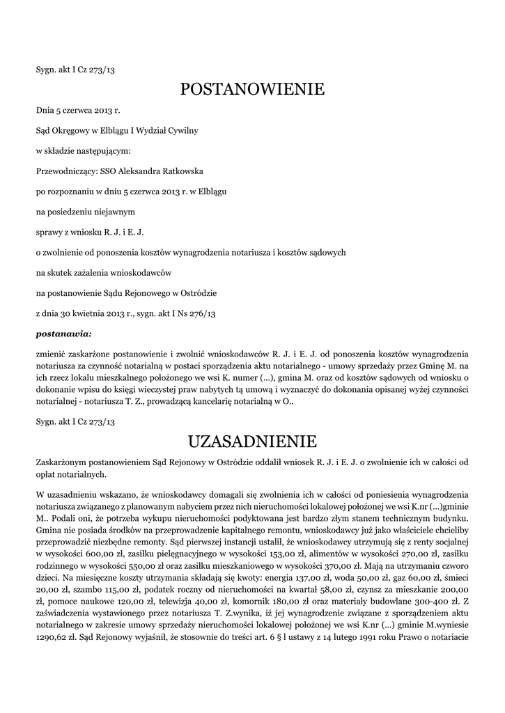 Sygn. akt I Cz 273/13 POSTANOWIENIE Dnia 5 czerwca 2013 r. Sąd Okręgowy w Elblągu I Wydział Cywilny w składzie następującym: Przewodniczący: SSO Aleksandra Ratkowska po rozpoznaniu w dniu 5 czerwca 2013 r. w Elblągu na posiedzeniu niejawnym sprawy z wniosku R. J. i E. J. o zwolnienie od ponoszenia kosztów wynagrodzenia notariusza i kosztów sądowych na skutek zażalenia wnioskodawców na postanowienie Sądu Rejonowego w Ostródzie z dnia 30 kwietnia 2013 r., sygn. akt I Ns 276/13 postanawia: zmienić zaskarżone postanowienie i zwolnić wnioskodawców R. J. i E. J. od ponoszenia kosztów wynagrodzenia notariusza za czynność notarialną w postaci sporządzenia aktu notarialnego - umowy sprzedaży przez Gminę M. na ich rzecz lokalu mieszkalnego położonego we wsi K. numer (...), gmina M. oraz od kosztów sądowych od wniosku o dokonanie wpisu do księgi wieczystej praw nabytych tą umową i wyznaczyć do dokonania opisanej wyżej czynności notarialnej - notariusza T. Z., prowadzącą kancelarię notarialną w O.. Sygn. akt I Cz 273/13 UZASADNIENIE Zaskarżonym postanowieniem Sąd Rejonowy w Ostródzie oddalił wniosek R. J. i E. J. o zwolnienie ich w całości od opłat notarialnych. W uzasadnieniu wskazano, że wnioskodawcy domagali się zwolnienia ich w całości od poniesienia wynagrodzenia notariusza związanego z planowanym nabyciem przez nich nieruchomości lokalowej położonej we wsi K.nr (...)gminie M.. Podali oni, że potrzeba wykupu nieruchomości podyktowana jest bardzo złym stanem technicznym budynku. Gmina nie posiada środków na przeprowadzenie kapitalnego remontu, wnioskodawcy już jako właściciele chcieliby przeprowadzić niezbędne remonty. Sąd pierwszej instancji ustalił, że wnioskodawcy utrzymują się z renty socjalnej w wysokości 600,00 zł, zasiłku pielęgnacyjnego w wysokości 153,00 zł, alimentów w wysokości 270,00 zł, zasiłku rodzinnego w wysokości 550,00 zł oraz zasiłku mieszkaniowego w wysokości 370,00 zł. Mają na utrzymaniu czworo dzieci. Na miesięczne koszty utrzymania składają się kwoty: energia 137,00 zł, woda 50,00 zł, gaz 60,00 zł, śmieci 20,00 zł, szambo 115,00 zł, podatek roczny od nieruchomości na kwartał 58,00 zł, czynsz za mieszkanie 200,00 zł, pomoce naukowe 120,00 zł, telewizja 40,00 zł, komornik 180,00 zł oraz materiały budowlane 300-400 zł. Z zaświadczenia wystawionego przez notariusza T. Z.wynika, iż jej wynagrodzenie związane z sporządzeniem aktu notarialnego w zakresie umowy sprzedaży nieruchomości lokalowej położonej we wsi K.nr (...) gminie M.wyniesie 1290,62 zł. Sąd Rejonowy wyjaśnił, że stosownie do treści art. 6 § l ustawy z 14 lutego 1991 roku Prawo o notariacie (Dz.U. 2002, Nr 42, póz. 369 z późn. zm.) strona czynności notarialnej - jeżeli nie jest w stanie bez uszczerbku utrzymania koniecznego dla siebie i rodziny ponieść żądanego przez notariusza wynagrodzenia - może wystąpić do sądu rejonowego właściwego ze względu na jej miejsce zamieszkania o zwolnienie w całości lub w części od ponoszenia tego wynagrodzenia. Stosownie do § 3 tego artykułu sąd po ustaleniu, że zachodzi potrzeba dokonania czynności notarialnej, uwzględnia wniosek i wyznacza notariusza do dokonania żądanej przez stronę czynności notarialnej. Analizując akta sprawy i wynikającą z nich sytuację faktyczną wnioskodawców, Sąd Rejonowy uznał, że nie istnieje obecnie potrzeba pilnego wykupu przez nich nieruchomości, nie posiadają bowiem żadnego obowiązku prawnego w nabyciu na własność od Gminy M.zajmowanego przez nich - na warunkach umowy najmu - lokalu mieszkalnego. Sąd Rejonowy stwierdził, że wnioskodawcy nie przedstawili jakichkolwiek dalszych dokumentów wskazujących na obiektywną konieczność zawarcia umowy sprzedaży lokalu mieszkalnego - inną, aniżeli własna chęć stania się właścicielem lokalu mieszkalnego i przeprowadzenia w nim kapitalnego remontu. Zdaniem Sądu pierwszej instancji ma to wpływ na ostateczną ocenę zasadności wniosku, albowiem nie zachodzi nagła potrzeba sporządzenia umowy sprzedaży w formie aktu notarialnego przez wnioskodawców. Stąd winni oni, w granicach zabezpieczenia swoich kosztów utrzymania, czynić oszczędności we własnych wydatkach na potrzeby zawarcia umowy sprzedaży lokalu, choćby miało to mieć miejsce w dłuższym okresie czasu. Podstawę prawną orzeczenia stanowił 6 § l, 3 i 5 ustawy Prawo o notariacie (Dz.U. 2002, Nr 42, póz.369 z póżn. zm.) w zw. z art. 102 ust. l ustawy z dnia 28 lipca 2005 roku o kosztach w sprawach cywilnych (Dz.U. 2005, Nr 167, póz.1398 ze zm.). W zażaleniu wnioskodawcy – R. J. i E. J. domagali się zmiany zaskarżonego postanowienia i orzeczenia zgodnie ze złożonym przez nich wnioskiem. Motywując swe stanowisko wskazali, że do mieszkania położonego we wsi K. wprowadzili się w 2010 r. Mieszkanie to było w bardzo złym stanie, zatem jeszcze przed przeprowadzką ponieśli znaczne koszty remontu. Remont trwa do dnia dzisiejszego. W kosztach, które powstają, Gmina partycypuje jedynie w niewielkim zakresie. Wobec braku środków niezbędnych na remont Gmina wyraża wolę sprzedaży wnioskodawcom mieszkania. Skarżący podkreślili, że wbrew stanowisku Sądu pierwszej instancji nie są w stanie zgromadzić odpowiednich środków na zakup tego lokalu, albowiem ponoszą wysokie koszty utrzymania. Co więcej, skarżący podkreślili, że obawiają się, iż w przyszłości Gmina dokona zamiany lokalu, w którym obecnie mieszkają na inny. Sąd Okręgowy zważył co następuje: Zażalenie zasługiwało na uwzględnienie. Wbrew stanowisku Sądu pierwszej instancji w niniejszej sprawie zachodzi potrzeba dokonania żądanej przez wnioskodawców czynności notarialnej, w rozumieniu przepisu art. 6 § 2 Ustawy z dnia 14 lutego 1991 r. Prawo o notariacie ( Dz. U. nr .2008.189. (...).t.). Przewidzianą w tym przepisie przesłankę ,,potrzeby dokonania czynności notar