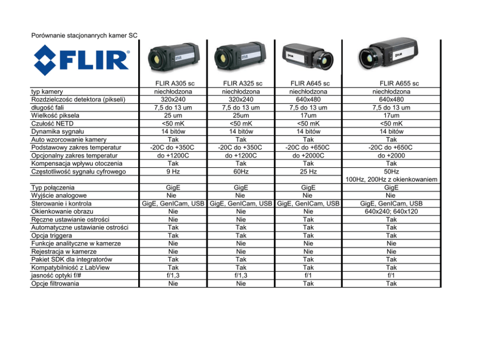 Porównanie stacjonanrych kamer SC typ kamery Rozdzielczośc detektora (pikseli) długość fali Wielkość piksela Czułość NETD Dynamika sygnału Auto wzorcowanie kamery Podstawowy zakres temperatur Opcjonalny zakres temperatur Kompensacja wpływu otoczenia Częstotliwość sygnału cyfrowego Typ połączenia Wyjście analogowe Sterowanie i kontrola Okienkowanie obrazu Ręczne ustawianie ostrości Automatyczne ustawianie ostrości Opcja triggera Funkcje analityczne w kamerze Rejestracja w kamerze Pakiet SDK dla integratorów Kompatybilniość z LabView jasność optyki f/# Opcje filtrowania FLIR A305 sc niechłodzona 320x240 7,5 do 13 um 25 um <50 mK 14 bitów Tak -20C do +350C do +1200C Tak 9 Hz FLIR A325 sc niechłodzona 320x240 7,5 do 13 um 25um <50 mK 14 bitów Tak -20C do +350C do +1200C Tak 60Hz FLIR A645 sc niechłodzona 640x480 7,5 do 13 um 17um <50 mK 14 bitów Tak -20C do +650C do +2000C Tak 25 Hz FLIR A655 sc niechłodzona 640x480 7,5 do 13 um 17um <50 mK 14 bitów Tak -20C do +650C do +2000 Tak 50Hz 100Hz, 200Hz z okienkowaniem GigE GigE GigE GigE Nie Nie Nie Nie GigE, GenICam, USB GigE, GenICam, USB GigE, GenICam, USB GigE, GenICam, USB Nie Nie Nie 640x240; 640x120 Nie Nie Tak Tak Tak Tak Tak Tak Tak Tak Tak Tak Nie Nie Nie Nie Nie Nie Nie Nie Tak Tak Tak Tak Tak Tak Tak Tak f/1,3 f/1,3 f/1 f/1 Nie Nie Tak Tak Dostępna optyka Przedstawicielstwo Handlowe Rakowiecka 39A/3, 02-521 Warszawa tel: 22-849 71 90 faks: 22-849 70 01 gsm: 601-25 10 25 e-miał: [email protected] 18 mm - 25° x 19° (wbudowany) 4 mm - 90° x 67,5° 30 mm - 15° x 11,3° 10 mm - 45º x 33,8° 76 mm - 6° x 4,5º Close-up 100µ - odległość pomiarowa 79 mm Close-up 50µ - odległość pomiarowa 33 mm Close-up 25µ - odległość pomiarowa 21 mm www.kameryir.com.pl UWAGA: specyfikacja może ulec zmianie bez uprzedniego powiadamiania 18 mm - 25° x 19° 10 mm - 45º x 33,8° 30 mm - 15° x 11,3° close-up