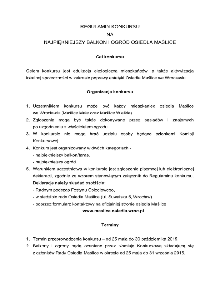 REGULAMIN KONKURSU NA NAJPIĘKNIEJSZY BALKON I OGRÓD OSIEDLA MAŚLICE Cel konkursu Celem konkursu jest edukacja ekologiczna mieszkańców, a także aktywizacja lokalnej społeczności w zakresie poprawy estetyki Osiedla Maślice we Wrocławiu. Organizacja konkursu 1. Uczestnikiem konkursu może być każdy mieszkaniec osiedla Maślice we Wrocławiu (Maślice Małe oraz Maślice Wielkie) 2. Zgłoszenia mogą być także dokonywane przez sąsiadów i znajomych po uzgodnieniu z właścicielem ogrodu. 3. W konkursie nie mogą brać udziału osoby będące członkami Komisji Konkursowej. 4. Konkurs jest organizowany w dwóch kategoriach:- najpiękniejszy balkon/taras, - najpiękniejszy ogród. 5. Warunkiem uczestnictwa w konkursie jest zgłoszenie pisemnej lub elektronicznej deklaracji, zgodnie ze wzorem stanowiącym załącznik do Regulaminu konkursu. Deklaracje należy składad osobiście: - Radnym podczas Festynu Osiedlowego, - w siedzibie rady Osiedla Maślice (ul. Suwalska 5, Wrocław) - poprzez formularz kontaktowy na oficjalniej stronie osiedla Maślice www.maslice.osiedla.wroc.pl Terminy 1. Termin przeprowadzenia konkursu – od 25 maja do 30 października 2015. 2. Balkony i ogrody będą oceniane przez Komisję Konkursową składającą się z członków Rady Osiedla Maślice w okresie od 25 maja do 31 września 2015. 3. Komisja Konkursowa: Marta Nenycz-Galbierz -Przewodnicząca Komisji Maja Lose Tomasz Patoła Ocena 1. W czasie przeglądu Komisja Konkursowa dokona oceny estetyki oraz utrzymania balkonu/ogrodu według poniższych kryteriów: rozwiązania proekologiczne max 100 punktów (kompostownik, nawadnianie, ochrona roślin, ochrona owadów, balkon/ogród przyjazny dla zwierząt) ogólne wrażenie – estetyka max 50 punktów zróżnicowanie biologiczne max 50 punktów (dobór materiału roślinnego) staranność wykonania max 30 punktów stan zieleni max 30 punktów funkcjonalność max 30 puntów (nawierzchnie, elementy małej architektury) wyjątkowe elementy max 30 punktów (elementy wodne, unikatowe rośliny, rośliny jadalne) 2. W trakcie oceny ogrodów Komisja Konkursowa może zadawać pytania dotyczące pielęgnacji ogrodu. 3. O uzyskaniu kolejności miejsc w konkursie decyduje średnia ocena punktowa obliczana jako iloraz sumy ocen uzyskanych podczas przeglądu i liczby tych ocen. 4. Komisja sporządzi protokół koocowy, w którym podsumowuje liczbę punktów uzyskanych przez poszczególnych uczestników i liczbę dokonanych ocen. 5. Rozstrzygnięcie konkursu nastąpi w terminie do 30 października 2015r. po sporządzeniu protokołu końcowego przez Komisję, a wyniki zostaną ogłoszone w czasie Specjalnej Sesji Rady Osiedla. Postanowienia ogólne 1. Uroczyste podsumowanie konkursu odbędzie się w październiku 2015 r. O terminie uczestnicy zostaną powiadomieni mailowo/telefonicznie. 2. Zwycięzcy konkursu otrzymają nagrody ustalone przez Radę Osiedla:w kategorii każdej z kategorii (najpiękniejszy balkon, najpiękniejszy ogród): I miejsce - bon do centrum ogrodniczego o wartości 200zł II miejsce –bon do centrum ogrodniczego o wartości 150zł III miejsce –bon do centrum ogrodniczego o wartości 100zł Dla wszytskich uczestników konkursu przewidziano upominki. 3. Decyzje Komisji Konkursowej są ostateczne i nie podlegają odwołaniu.Wszystkie sprawy sporne zostrzyga Komisja Konkursowa.