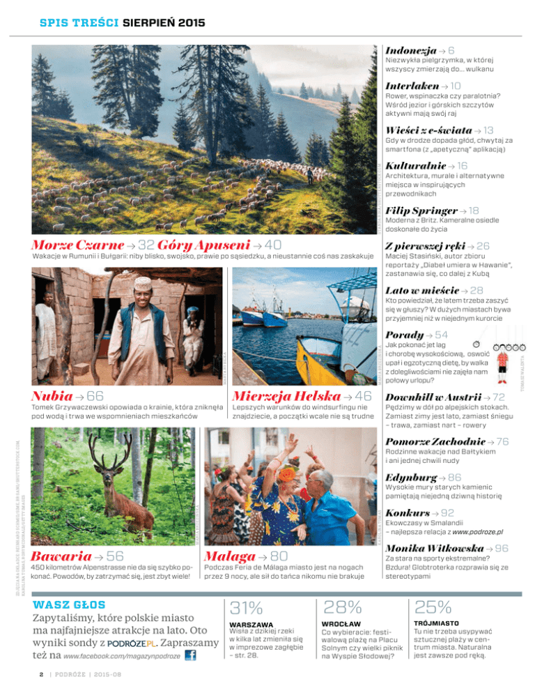 SPIS TREŚCI SIERPIEŃ 2015 Indonezja / 6 Niezwykła pielgrzymka, w której wszyscy zmierzają do... wulkanu Interlaken / 10 Rower, wspinaczka czy paralotnia? Wśród jezior i górskich szczytów aktywni mają swój raj Wieści z e-świata / 13 STANDA RIHA/SHUTTERSTOCK.COM Gdy w drodze dopada głód, chwytaj za smartfona (z „apetyczną” aplikacją) Kulturalnie / 16 Architektura, murale i alternatywne miejsca w inspirujących przewodnikach Filip Springer / 18 Moderna z Britz. Kameralne osiedle doskonałe do życia Morze Czarne / 32 Góry Apuseni / 40 Z pierwszej ręki / 26 Wakacje w Rumunii i Bułgarii: niby blisko, swojsko, prawie po sąsiedzku, a nieustannie coś nas zaskakuje Maciej Stasiński, autor zbioru reportaży „Diabeł umiera w Hawanie”, zastanawia się, co dalej z Kubą Lato w mieście / 28 Kto powiedział, że latem trzeba zaszyć się w głuszy? W dużych miastach bywa przyjemniej niż w niejednym kurorcie Mierzeja Helska / 46 Downhill w Austrii / 72 Tomek Grzywaczewski opowiada o krainie, która zniknęła pod wodą i trwa we wspomnieniach mieszkańców Lepszych warunków do windsurfingu nie znajdziecie, a początki wcale nie są trudne Pędzimy w dół po alpejskich stokach. Zamiast zimy jest lato, zamiast śniegu – trawa, zamiast nart – rowery Pomorze Zachodnie / 76 Rodzinne wakacje nad Bałtykiem i ani jednej chwili nudy Edynburg / 86 Wysokie mury starych kamienic pamiętają niejedną dziwną historię KAROLINA TOMAS Bawaria / 56 Malaga / 80 450 kilometrów Alpenstrasse nie da się szybko pokonać. Powodów, by zatrzymać się, jest zbyt wiele! Podczas Feria de Málaga miasto jest na nogach przez 9 nocy, ale sił do tańca nikomu nie brakuje WASZ GŁOS Zapytaliśmy, które polskie miasto ma najfajniejsze atrakcje na lato. Oto . Zapraszamy wyniki sondy z też na www.facebook.com/magazynpodroze 2 | P O DR ÓŻ E | 201 5 - 08 Konkurs / 92 Ekowczasy w Smalandii – najlepsza relacja z www.podroze.pl Monika Witkowska / 96 Za stara na sporty ekstremalne? Bzdura! Globtroterka rozprawia się ze stereotypami 31% 28% 25% WARSZAWA Wisła z dzikiej rzeki w kilka lat zmieniła się w imprezowe zagłębie – str. 28. WROCŁAW Co wybieracie: festiwalową plażę na Placu Solnym czy wielki piknik na Wyspie Słodowej? TRÓJMIASTO Tu nie trzeba usypywać sztucznej plaży w centrum miasta. Naturalna jest zawsze pod ręką. TOMASZ WALENTA Jak pokonać jet lag i chorobę wysokościową, oswoić upał i egzotyczną dietę, by walka z dolegliwościami nie zajęła nam połowy urlopu? Nubia / 66 MARIA BRZEZIŃSKA ZDJĘCIA NA OKŁADCE: REINHARD SCHMID/SIME, BR SANG/SHUTTERSTOCK.COM, KAROLINA TOMAS, RORY MCDONALD/GETTY IMAGES MARTA RYBICKA MARIA BRZEZIŃSKA Porady / 54