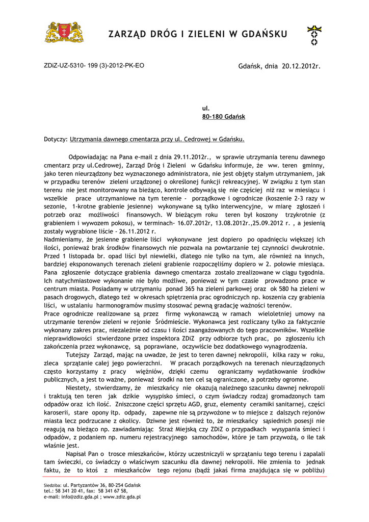 ZARZĄD DRÓG I ZIELENI W GDAŃSKU ZDiZ-UZ-5310- 199 (3)-2012-PK-EO Gdańsk, dnia 20.12.2012r. ul. 80-180 Gdańsk Dotyczy: Utrzymania dawnego cmentarza przy ul. Cedrowej w Gdańsku. Odpowiadając na Pana e-mail z dnia 29.11.2012r., w sprawie utrzymania terenu dawnego cmentarz przy ul.Cedrowej, Zarząd Dróg i Zieleni w Gdańsku informuje, że ww. teren gminny, jako teren nieurządzony bez wyznaczonego administratora, nie jest objęty stałym utrzymaniem, jak w przypadku terenów zieleni urządzonej o określonej funkcji rekreacyjnej. W związku z tym stan terenu nie jest monitorowany na bieżąco, kontrole odbywają się nie częściej niż raz w miesiącu i wszelkie prace utrzymaniowe na tym terenie - porządkowe i ogrodnicze (koszenie 2-3 razy w sezonie, 1-krotne grabienie jesienne) wykonywane są tylko interwencyjne, w miarę zgłoszeń i potrzeb oraz możliwości finansowych. W bieżącym roku teren był koszony trzykrotnie (z grabieniem i wywozem pokosu), w terminach- 16.07.2012r, 13.08.2012r.,25.09.2012 r. , a jesienią zostały wygrabione liście - 26.11.2012 r. Nadmieniamy, że jesienne grabienie liści wykonywane jest dopiero po opadnięciu większej ich ilości, ponieważ brak środków finansowych nie pozwala na powtarzanie tej czynności dwukrotnie. Przed 1 listopada br. opad liści był niewielki, dlatego nie tylko na tym, ale również na innych, bardziej eksponowanych terenach zieleni grabienie rozpoczęliśmy dopiero w 2. połowie miesiąca. Pana zgłoszenie dotyczące grabienia dawnego cmentarza zostało zrealizowane w ciągu tygodnia. Ich natychmiastowe wykonanie nie było możliwe, ponieważ w tym czasie prowadzono prace w centrum miasta. Posiadamy w utrzymaniu ponad 365 ha zieleni parkowej oraz ok 580 ha zieleni w pasach drogowych, dlatego też w okresach spiętrzenia prac ogrodniczych np. koszenia czy grabienia liści, w ustalaniu harmonogramów musimy stosować pewną gradację ważności terenów. Prace ogrodnicze realizowane są przez firmę wykonawczą w ramach wieloletniej umowy na utrzymanie terenów zieleni w rejonie Śródmieście. Wykonawca jest rozliczany tylko za faktycznie wykonany zakres prac, niezależnie od czasu i ilości zaangażowanych do tego pracowników. Wszelkie nieprawidłowości stwierdzone przez inspektora ZDiZ przy odbiorze tych prac, po zgłoszeniu ich zakończenia przez wykonawcę, są poprawiane, oczywiście bez dodatkowego wynagrodzenia. Tutejszy Zarząd, mając na uwadze, że jest to teren dawnej nekropolii, kilka razy w roku, zleca sprzątanie całej jego powierzchni. W pracach porządkowych na terenach nieurządzonych często korzystamy z pracy więźniów, dzięki czemu ograniczamy wydatkowanie środków publicznych, a jest to ważne, ponieważ środki na ten cel są ograniczone, a potrzeby ogromne. Niestety, stwierdzamy, że mieszkańcy nie okazują należnego szacunku dawnej nekropoli i traktują ten teren jak dzikie wysypisko śmieci, o czym świadczy rodzaj gromadzonych tam odpadów oraz ich ilość. Zniszczone części sprzętu AGD, gruz, elementy ceramiki sanitarnej, części karoserii, stare opony itp. odpady, zapewne nie są przywożone w to miejsce z dalszych rejonów miasta lecz podrzucane z okolicy. Dziwne jest również to, że mieszkańcy sąsiednich posesji nie reagują na bieżąco np. zawiadamiając Straż Miejską czy ZDiZ o przypadkach wysypania śmieci i odpadów, z podaniem np. numeru rejestracyjnego samochodów, które je tam przywożą, o ile tak właśnie jest. Napisał Pan o trosce mieszkańców, którzy uczestniczyli w sprzątaniu tego terenu i zapalali tam świeczki, co świadczy o właściwym szacunku dla dawnej nekropolii. Nie zmienia to jednak faktu, że to ktoś z mieszkańców tego rejonu (bądź jakaś firma znajdująca się w pobliżu) Siedziba: ul. Partyzantów 36, 80-254 Gdańsk tel.: 58 341 20 41, fax: 58 341 67 58, e-mail: [email protected] ; www.zdiz.gda.pl ZARZĄD DRÓG I ZIELENI W GDAŃSKU oszczędza swoje wydatki nie wywożąc odpadów na wysypisko, tylko podrzucając je na dawny cmentarz. Częstsze sprzątanie tego terenu przez służby miejskie, wiąże się tylko z ponoszeniem coraz większych wydatków na ten cel, nie eliminując zjawiska. Zaprzestanie takich praktyk możliwe jest jednak przy aktywnej pomocy mieszkańców najbliższych posesji, którzy najlepiej wiedzą kiedy i kto zanieczyszcza ten teren. Przypuszczamy, że znaczącą rolę w tej sprawie mogłaby odegrać również Rada Osiedla Ujeścisko. Nadmieniamy, iż wszelkie zaobserwowane przypadki podrzucania odpadów i dewastacji mogą być zgłaszane telefonicznie do Straży Miejskiej w Gdańsku, albo do ZDiZ, lub całodobowo do Inżyniera Miasta. Realizacja Pana wniosku o ogrodzenie terenu dawnego cmentarza metalowym ogrodzeniem z bramką wejściową , wymagałaby dużych nakładów finansowych, wstępnie szacowanych na kilkadziesiąt tysięcy złotych, których zabezpieczenie nie jest aktualnie możliwe, ze względu na inne potrzeby w zakresie zagospodarowania i utrzymania terenów zieleni i czynnych cmentarzy komunalnych. Taki wydatek byłby uzasadniony dopiero w przypadku podjęcia kompleksowych prac związanych z zagospodarowaniem tego terenu pod określoną funkcję. W przeszłości ZDiZ kilkakrotnie składał wnioski do WPI (Wieloletniego Planu Inwestycyjnego) o przyznanie środków finansowych na zadanie inwestycyjne polegające na zaadoptowaniu terenu dawnego cmentarza przy ul.Cedrowej na teren zieleni o funkcji spacerowo-kontemplacyjnej, z zachowaniem części dawnych pomników, wykonaniem nawierzchni, placów z ławkami i zieleni ozdobnej. Jednak w sytuacji innych, ważnych potrzeb inwestycyjnych miasta, których efekty są przecież widoczne również w tym rejonie miasta, w którym znajduje się dawny cmentarz, to zadanie nie znalazło się na liście zadań przyjętych przez Radę Miasta do realizacji. Nie jesteśmy zresztą pewni, czy ww. funkcja planowana dla tego miejsca, już teraz byłaby zaakceptowana i wła
