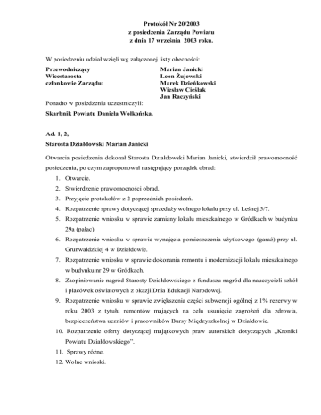 Protokół Nr 20/2003 z posiedzenia Zarządu Powiatu z dnia 17