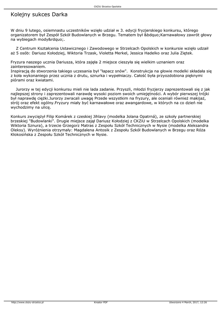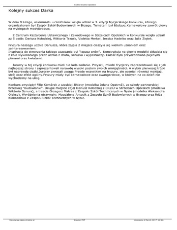 CKZiU Strzelce Opolskie Kolejny sukces Darka W dniu 9 lutego, osiemnastu uczestników wzięło udział w 3. edycji fryzjerskiego konkursu, którego organizatorem był Zespół Szkół Budowlanych w Brzegu. Tematem był „Karnawałowy zawrót głowy na wybiegach mody”. Z Centrum Kształcenia Ustawicznego i Zawodowego w Strzelcach Opolskich w konkursie wzięło udzaił aż 5 osób: Dariusz Kołodziej, Wiktoria Trzask, Violetta Merkel, Jessica Hadelko oraz Julia Ziętek. Fryzura naszego ucznia Dariusza, która zajęła 2 miejsce cieszyła się wielkim uznaniem oraz zainteresowaniem. Inspiracją do stworzenia takiego uczesania był "łapacz snów". Konstrukcja na głowie modelki składała się z koła wykonaniego przez ucznia z drutu, sznurka i wypełniaczy. Całość była przyozdobiona pięknymi piórami oraz kwiatami. Jurorzy w tej edycji konkursu mieli nie lada zadanie. Przyszli, młodzi fryzjerzy zaprezentowali się z jak najlepszej strony i zaprezentowali narawdę wysoki poziom swoich umiejętności. A wybór pierwszej trójki był naprawdę ciężki.Jurorzy zwracali uwagę Przede wszystkim na fryzury, ale oceniali również makijaż, strój oraz efekt ogólny.Fryzury miały być karnawałowe oraz awangardowe, w których na co dzień nie wychodzimy na ulicę. Konkurs zwyciężył Filip Komárek z czeskiej Jihlavy (modelka Jolana Opatrná), ze szkoły partnerskiej brzeskiej "Budowlanki". Drugie miejsce zajął Dariusz Kołodziej z CKZiU w Strzelcach Opolskich (modelka Wiktoria Sznura), a trzecie Grzegorz Matras z Zespołu Szkół Technicznych w Nysie (modelka Aleksandra Oleksy). Wyróżnienia otrzymały: Magdalena Antosik z Zespołu Szkół Budowlanych w Brzegu oraz Róża Kłokosińska z Zespołu Szkół Technicznych w Nysie. http://www.ckziu-strzelce.pl Kreator PDF Utworzono 4 March, 2017, 12:26