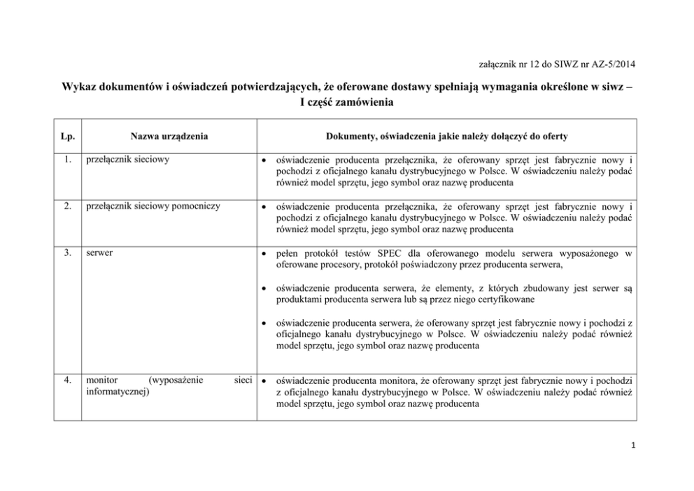 załącznik nr 12 do SIWZ nr AZ-5/2014 Wykaz dokumentów i oświadczeń potwierdzających, że oferowane dostawy spełniają wymagania określone w siwz – I część zamówienia Nazwa urządzenia Lp. Dokumenty, oświadczenia jakie należy dołączyć do oferty 1. przełącznik sieciowy oświadczenie producenta przełącznika, że oferowany sprzęt jest fabrycznie nowy i pochodzi z oficjalnego kanału dystrybucyjnego w Polsce. W oświadczeniu należy podać również model sprzętu, jego symbol oraz nazwę producenta 2. przełącznik sieciowy pomocniczy oświadczenie producenta przełącznika, że oferowany sprzęt jest fabrycznie nowy i pochodzi z oficjalnego kanału dystrybucyjnego w Polsce. W oświadczeniu należy podać również model sprzętu, jego symbol oraz nazwę producenta 3. serwer pełen protokół testów SPEC dla oferowanego modelu serwera wyposażonego w oferowane procesory, protokół poświadczony przez producenta serwera, oświadczenie producenta serwera, że elementy, z których zbudowany jest serwer są produktami producenta serwera lub są przez niego certyfikowane oświadczenie producenta serwera, że oferowany sprzęt jest fabrycznie nowy i pochodzi z oficjalnego kanału dystrybucyjnego w Polsce. W oświadczeniu należy podać również model sprzętu, jego symbol oraz nazwę producenta sieci oświadczenie producenta monitora, że oferowany sprzęt jest fabrycznie nowy i pochodzi z oficjalnego kanału dystrybucyjnego w Polsce. W oświadczeniu należy podać również model sprzętu, jego symbol oraz nazwę producenta 4. monitor (wyposażenie informatycznej) 1 sieci oświadczenie producenta zasilacza, że oferowany sprzęt jest fabrycznie nowy i pochodzi z oficjalnego kanału dystrybucyjnego w Polsce. W oświadczeniu należy podać również model sprzętu, jego symbol oraz nazwę producenta zarządzane punkty dostępowe Wi-Fi oświadczenie producenta sprzętu, że oferowany model jest fabrycznie nowy i pochodzi z oficjalnego kanału dystrybucyjnego w Polsce. W oświadczeniu należy podać również model sprzętu, jego symbol oraz nazwę producenta komputer (stanowisko kasowe) oświadczenie producenta komputera, że oferowany sprzęt jest fabrycznie nowy i pochodzi z oficjalnego kanału dystrybucyjnego w Polsce. W oświadczeniu należy podać również model sprzętu, jego symbol oraz nazwę producenta dla potwierdzenia, że oferowany sprzęt odpowiada postawionym wymaganiom i był wykonany przez Wykonawcę (a jeżeli Wykonawca nie jest producentem to przez producenta) w systemie zapewnienia jakości wg normy ISO 9001 do oferty należy dołączyć certyfikat ISO 9001 lub inne zaświadczenie/dokument wydane przez niezależny podmiot zajmujący się poświadczaniem zgodności działań wykonawcy z normami jakościowymi – odpowiadające normie ISO 9001 5. zasilacz UPS informatycznej) 6. 7. (wyposażenie 8. monitor (stanowisko kasowe) oświadczenie producenta monitora, że oferowany sprzęt jest fabrycznie nowy i pochodzi z oficjalnego kanału dystrybucyjnego w Polsce. W oświadczeniu należy podać również model sprzętu, jego symbol oraz nazwę producenta 9. drukarka komputerowa faktur oświadczenie producenta drukarki, że oferowany sprzęt jest fabrycznie nowy i pochodzi z oficjalnego kanału dystrybucyjnego w Polsce. W oświadczeniu należy podać również model sprzętu, jego symbol oraz nazwę producenta 10. drukarka fiskalna oświadczenie producenta drukarki, że oferowany sprzęt jest fabrycznie nowy i pochodzi z oficjalnego kanału dystrybucyjnego w Polsce. W oświadczeniu należy podać również model sprzętu, jego symbol oraz nazwę producenta 2 atest Urzędu Skarbowego do drukarki atest Urzędu Skarbowego do serwisowania drukarki zasilacz UPS (wyposażenie stanowisk kasowych) oświadczenie producenta zasilacza, że oferowany sprzęt jest fabrycznie nowy i pochodzi z oficjalnego kanału dystrybucyjnego w Polsce. W oświadczeniu należy podać również model sprzętu, jego symbol oraz nazwę producenta komputer (wyposażenie administracji i edukacji) oświadczenie producenta komputera, że oferowany sprzęt jest fabrycznie nowy i pochodzi z oficjalnego kanału dystrybucyjnego w Polsce. W oświadczeniu należy podać również model sprzętu, jego symbol oraz nazwę producenta dla potwierdzenia, że oferowany sprzęt odpowiada postawionym wymaganiom i był wykonany przez Wykonawcę (a jeżeli Wykonawca nie jest producentem to przez producenta) w systemie zapewnienia jakości wg normy ISO 9001 do oferty należy dołączyć certyfikat ISO 9001 lub inne zaświadczenie/dokument wydane przez niezależny podmiot zajmujący się poświadczaniem zgodności działań wykonawcy z normami jakościowymi – odpowiadające normie ISO 9001 13. monitor (wyposażenie administracji i edukacji) oświadczenie producenta monitora, że oferowany sprzęt jest fabrycznie nowy i pochodzi z oficjalnego kanału dystrybucyjnego w Polsce. W oświadczeniu należy podać również model sprzętu, jego symbol oraz nazwę producenta 14. notebook oświadczenie producenta notebooka, że oferowany sprzęt jest fabrycznie nowy i pochodzi z oficjalnego kanału dystrybucyjnego w Polsce. W oświadczeniu należy podać również model sprzętu, jego symbol oraz nazwę producenta 15. drukarka wielofunkcyjna kolorowa oświadczenie producenta drukarki, że oferowany sprzęt jest fabrycznie nowy i pochodzi z oficjalnego kanału dystrybucyjnego w Polsce. W oświadczeniu należy podać również model sprzętu, jego symbol oraz nazwę producenta 11. 12. 3 16. drukarka monochromatyczna wielofunkcyjna oświadczenie producenta drukarki, że oferowany sprzęt jest fabrycznie nowy i pochodzi z oficjalnego kanału dystrybucyjnego w Polsce. W oświadczeniu należy podać również model sprzętu, jego symbol oraz nazwę producenta 17. zasilacz UPS (wyposażenie administracji i edukacji) oświadczenie producenta zasilacza, że oferowany sprzęt jest fabrycznie nowy i pochodzi z oficjalnego kanału dyst