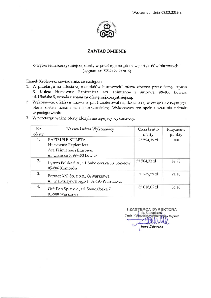 1'. W przetargu na ,,dostawg materiat6w biurowych" oferta zlohona przez firmg Papirus