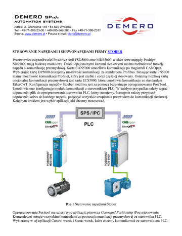 DEMERO sp.j. AUTOMATION SYSTEMS Adres: ul. Graniczna 145 • 54-530 Wrocław Tel. +48-71-388-23-00 / +48-605-242-283 • Fax +48-71-388-2311 Strona: www.demero.pl • Poczta e-mail: [email protected] STEROWANIE NAPĘDAMI I SERWONAPĘDAMI FIRMY STOBER Przetwornice częstotliwości Posidrive serii FSD5000 oraz MDS5000, a także serwonapędy Posidyn SDS5000 mają budowę modułową. Dzięki opcjonalnymi kartami sieciowymi można rozbudować funkcję napędu o komunikację przemysłową. Karta CAN5000 umożliwia komunikacje po magistrali CANOpen. Wybierając kartę DP5000 dostajemy możliwość komunikacji ze standardem Profibus. Stosując kartę PN5000 mamy możliwość komunikacji Profinet, który jest szybki i coraz częściej stosowany. Ostatnią możliwą kartą opcjonalną komunikacji przemysłowej jest karta ECS5000, która umożliwia komunikacje ze standardem EtherCAT. Konfiguracja napędów Stoeber możliwa jest za pomocą bezpłatnego oprogramowania PosiTool. Umożliwia ono konfigurację modułu komunikacji z sterownikiem PLC. W każdym przypadku należy wgrać odpowiedni plik do oprogramowania sterownika PLC, który stosujemy. Następnie należy przypisać odpowiedni adres do każdego napędu, połączyć wszystkie urządzenia przewodem do komunikacji sieciowej. Kolejnym krokiem jest wybór aplikacji jaki chcemy zastosować. Rys.1 Sterowanie napędami Stober Oprogramowanie Positool ma cztery typy aplikacji, pierwsza Command Positioning (Pozycjonowanie Komendowe) steruje wszystkimi komendami za pomocą komunikacji przemysłowej ze sterownika PLC. Wybieramy w tej aplikacji Control words i Status words, które chcemy komunikować ze sterownikiem PLC. W zależności od ich stanów falownik wykonuje odpowiednie funkcje, które wcześniej zaprogramowaliśmy. Kolejną aplikacją jest Motion Block Positioning (Pozycjonowanie Blokowe). W tej aplikacji część funkcji zaprogramowana jest w blokach, której liczbę możemy określić. Aplikacja ta może być stosowana do pracy falownika bez sterownika PLC. Mamy możliwość wywoływania bloków za pomocą sygnałów binarnych z wejść cyfrowych. Stosując jednak tą aplikację do pracy ze sterownikiem PLC mamy korzyć polegającą na szybszej komunikacji między sterownikiem PLC, a falownikiem w porównaniu do pierwszej aplikacji. Dzieje się tak, ponieważ wysyłamy mniej komend oraz ich wielkość jest mniejsza. Kolejną aplikacją jest aplikacja Fast Reference Value (Szybka Wartość Zadana). Jest to prosta aplikacja do zaprogramowania potencjometru jako zadajnika prędkości obrotowej bądź ogranicznika momentu. Następna aplikacja Comfort Reference Value (Komfortowa wartość Zadana). Jest to aplikacja bardzo rozbudowana, umożliwia zaprogramowanie sterowania momentowego, prędkościowego lub aplikacji typu master- slave. Ostatnią aplikacją są te do trybu synchronizacji Synchronous mode. Synchronous Command Positioning jest podobną aplikacją do Pozycjonowania komendowego z rozbudowaną opcją do synchronizacji. Jest jeszcze Electroni Cam Command Positioning, które umożliwia pracę dwóch napędów po elektronicznej krzywce. Odbywa się to w trzecim poziomie, do którego można się dostać po wgraniu klucza. Taki klucz można otrzymać po ukończeniu szkolenia, które odbywa się w naszej firmie. Dzięki temu możemy zaprogramować dodatkowe funkcje, które nie są dostępne w standardowym wizardzie np. funkcja licznika, konwersja typów zmiennych. Dodatkowe funkcje po odblokowaniu trzeciego poziomu zmieniają falownik w prosty sterownik PLC. Wszystkie przetwornice częstotliwości wspierają programowanie zgodne ze standardem PLCOpen w języku FBD. Rys.2 Sterowanie napędami Stober Oprócz opcjonalnych kart komunikacyjnych falowniki Stobera MDS5000 i SDS5000 mają możliwość opcjonalnych kart wejść/wyjść cyfrowych/analogowych. Podstawową kartą jest karta SEA5001, która ma dwa analogowe wejścia i dwa analogowe wyjścia, pięć wejść cyfrowych i dwa wyjścia cyfrowe. Rozbudowaną kartą jest karta XEA5001, która ma trzynaście wejść i dziesięć wyjść cyfrowych, trzy wejścia i dwa wejścia analogowe. Jest jeszcze karta REA5001, która ma możliwość podłączenia enkodera typu Resolver. Przetwornice FDS5000 i MSD5000 mają komunikację z PC poprzez złącze RS232, umożliwia on komunikację po protokole USS. Można dzięki temu podłączyć panel HMI Weinteka i odczytywać/zadawać parametry. Posidyn SDS5000 posiada szybką komunikację IGB opartą o Ethernet do komunikacji z PC, który umożliwia również komunikację między napędami. Interfejs tej komunikacji umożliwia synchronizację 32 napędów. Falowniki firmy Stober obsługują następujące enkodery: enkoder absolutny EnDAT 2.1, EnDAT 2.2, SSI, Inkrementalny HTL, Inkrementalny TTL, Resolver. Enkodery absolutne mają pamięć w postaci elektronicznej tabliczki znamionowej. Nie ma potrzeby wpisywania parametrów silnika do programu PosiTool. Falowniki mają opcjonalnie funkcję STO (ASP) bezpiecznego wyłączenia momentu, która montowana jest na etapie produkcji. Dodatkowym atutem jest paramoduł, przechowujący pamięć programu. W przypadku awarii falownika wystarczy przełożyć paramoduł do nowego falownika, aplikacja wystartuje automatycznie. Przetwornice SDS5000 mają możliwość sterowania dwoma hamulcami, jeden może być umieszczony w silniku, drugi w adapterze przekładni. Rozwiązanie to pozwala na budowę maszyn o wysokim poziomie bezpieczeństwa do PL e. Rys.3 Sterowanie napędami Stober Przetwornice Stoeber standardowo mają możliwość zapamiętania do 4 zestawów parametrów. Można zaprogramować 4 aplikacje na jednej osi i je przełączać binarnie lub cztery osie pracujące na przemian. Do tego rozwiązania potrzebny jest układ POSISwitch AX 5000. Zaletą falowników jest dwuwierszowy wyświetlacz z klawiaturą. Dzięki temu można zmienić nastawy, sprawdzić silnik za pomocą jazdy ręcznej, zdiagnozować usterkę. Oprogram