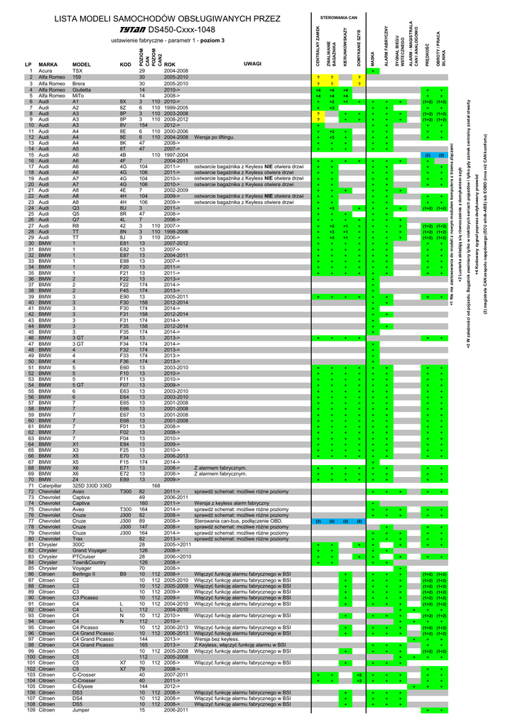 T300 T300 J300 J300 J300 J300 B9 L L N N X7 X7 2011-> 2006-2011 2011-> 2014-> 2008-> 2008-> 2008-> 2014-> 2013-> 2005->2011 2008-> 2006->2010 2008-> 2008-> 2008-> 2005-2010 2005-2009 2009-> 2009-> 2004-2010 2004-2010 2010-> 2010-> 2006-2013 2006-2013 2013-> 2013-> 2005-2008 2005-2008 2008-> 2008-> 2007-2011 2011-> 2012-> 2008-> 2008-> 2008-> 2006-2011 +4 +4 + + ? ? + + + + + +4 +4 +3 +3 +3 +3 + + + + + + + + + + + + + + + + + + + + + + + + + + + + + + + + + + +3 + + +3 +3 +3 + + + + + + + + + +1 +1 +1 + + + + + + + + + + + + + + + + + + + + ALARM - MAGISTRALA CAN I ANALOGOWO ? SYGNAŁ BIEGU WSTECZNEGO ? ? ALARM FABRYCZNY ? ? + + (1+2) + (1+2) (1+2) + + + + + (1+2) + (1+2) (1+2) + + + (2) + + + + + (2) + + (1+2) + + (1+2) (1+2) (1+2) (1+2) + + + + + + (1+2) (1+2) (1+2) + + + + + + + + + + ostwarcie bagażnika z Keyless NIE otwiera drzwi ostwarcie bagażnika z Keyless otwiera drzwi + + + + + + + + + + + + + + + + + + + + + + + + + + + + + + + + + + + + + + + + + + + + + + + + + + + + + + + + + + + + + + + + + + + + + + + + + + + + + + + + + + + + + + + + + + + + + + + + + + + + + + + + + + + + + + + + + + + + + + + + + + + + + + + + + + + + + + + + + + + + + + + + + + + + + + + + + + + + + + + + + + + + + + + + + + + + + + + + + + sprawdź schemat: możliwe różne poziomy + + + + + Wersja z keyless alarm fabryczny sprawdź schemat: możliwe różne poziomy sprawdź schemat: możliwe różne poziomy Sterowania can-bus, podłączenie OBD. sprawdź schemat: możliwe różne poziomy sprawdź schemat: możliwe różne poziomy sprawdź schemat: możliwe różne poziomy + + + + + + + + + + + + + + + + + + + + + + + + + + (1+2) (1+2) (1+2) (1+2) (1+2) (1+2) + (1+2) + (1+2) (1+2) + + (1+2) + (1+2) (1+2) (1+2) (1+2) (1+2) (1+2) + (1+2) + (1+2) (1+2) + + (1+2) + + + + + + + + + + + + Z alarmem fabrycznym. Z alarmem fabrycznym. + + + + + + + + + + + + + + + + + + + + + + + + + + + + + + + + + + + + + + + + + + + + + + + + + + + + + + + + + + + + + + + + + + + + + + + + + + + + (2) + + + + (2) (2) + + + + (2) + + + + + + + + + + + + + + + + + + + + + + + + + Włączyć funkcję alarmu fabrycznego w BSI Włączyć funkcję alarmu fabrycznego w BSI Włączyć funkcję alarmu fabrycznego w BSI Włączyć funkcję alarmu fabrycznego w BSI Włączyć funkcję alarmu fabrycznego w BSI Włączyć funkcję alarmu fabrycznego w BSI + + + + + + + + + + + + + + + + + + Włączyć funkcję alarmu fabrycznego w BSI + + + Włączyć funkcję alarmu fabrycznego w BSI Włączyć funkcję alarmu fabrycznego w BSI Wersja bez keyless. Z Keyless, włączyć funkcję alarmu w BSI Włączyć funkcję alarmu fabrycznego w BSI + + + + + + + + + + + Włączyć funkcję alarmu fabrycznego w BSI + + + + + + + + + + + + + + + + + + + + + + + + + + Włączyć funkcję alarmu fabrycznego w BSI Włączyć funkcję alarmu fabrycznego w BSI Włączyć funkcję alarmu fabrycznego w BSI + + + +2 +2 + + + +4 Kodowany sygnał poprzez dedykowany przewód ostwarcie bagażnika z Keyless NIE otwiera drzwi ostwarcie bagażnika z Keyless otwiera drzwi ostwarcie bagażnika z Keyless NIE otwiera drzwi ostwarcie bagażnika z Keyless otwiera drzwi + (2) magistrala CAN zespołu napędowego (ECU silnik-ABS) lub EOBD (inna niż CAN komfortu) Wersja po liftingu. +4 +4 +1 +2 Lusterka składają się równocześnie z domykaniem szyb + +3 W zależności od pojazdu. Bagażnik zwalniany tylko w niektórych seriach pojazdów i tylko gdy zamek centralny został otwarty 110 7 104 106 104 106 7 104 106 3 47 7 3 110 3 110 3 110 13 13 13 13 13 13 13 174 174 13 158 174 158 174 158 174 13 174 174 174 174 13 13 13 13 13 13 13 13 13 13 13 13 13 13 13 13 174 13 13 13 168 82 49 160 164 82 89 147 164 82 28 126 28 126 70 10 112 10 112 10 112 10 112 10 112 10 112 112 10 112 112 10 112 10 112 144 165 10 112 112 10 112 79 40 40 144 10 112 10 112 10 112 15 ? OBROTY / PRACA SILNIKA 110 110 UWAGI +1 Nie ma zastosowania do modeli z nowym modułem komputera z trzema złączami 110 110 110 110 ROK 2004-2008 2005-2010 2005-2010 2010-> 2008-> 2010-> 1999-2005 2003-2008 2008-2012 2012-> 2000-2006 2004-2008 2008-> 2007-> 1997-2004 2004-2011 2011-> 2011-> 2010-> 2010-> 2002-2009 2009-> 2009-> 2011-> 2008-> 2006-> 2007-> 1998-2006 2006-> 2007-2012 2007-> 2004-2011 2007-> 2011-> 2011-> 2013-> 2014-> 2013-> 2005-2011 2012-2014 2014-> 2012-2014 2014-> 2012-2014 2014-> 2013-> 2014-> 2013-> 2013-> 2013-> 2003-2010 2010-> 2010-> 2009-> 2003-2010 2003-2010 2001-2008 2001-2008 2001-2008 2001-2008 2008-> 2008-> 2010-> 2009-> 2010-> 2006-2013 2014-> 2008-> 2008-> 2009-> PRĘDKOŚĆ 8X 8Z 8P 8P 8V 8E 8E 8K 8T 4B 4F 4G 4G 4G 4G 4E 4H 4H 8U 8R 4L 42 8N 8J E81 E82 E87 E88 F20 F21 F22 F22 F45 E90 F30 F30 F31 F31 F35 F35 F34 F34 F32 F33 F36 E60 F10 F11 F07 E63 E64 E65 E66 E67 E68 F01 F02 F04 E84 F25 E70 F15 E71 E72 E89 29 30 30 14 14 3 6 3 3 154 6 6 47 47 MASKA KOD DOMYKANIE SZYB MODEL TSX 159 Brera Giulietta MiTo A1 A2 A3 A3 A3 A4 A4 A4 A5 A6 A6 A6 A6 A7 A7 A8 A8 A8 Q3 Q5 Q7 R8 TT TT 1 1 1 1 1 1 2 2 2 3 3 3 3 3 3 3 3 GT 3 GT 4 4 4 5 5 5 5 GT 6 6 7 7 7 7 7 7 7 X1 X3 X5 X5 X6 X6 Z4 325D 330D 336D Aveo Captiva Captiva Aveo Cruze Cruze Cruze Cruze Trax 300C Grand Voyager PTCruiser Town&Country Voyager Berlingo II C2 C3 C3 C3 Picasso C4 C4 C4 C4 C4 Picasso C4 Grand Picasso C4 Grand Picasso C4 Grand Picasso C5 C5 C5 C5 C-Crosser C-Crosser C-Elysee DS3 DS4 DS5 Jumper KIERUNKOWSKAZY MARKA Acura Alfa Romeo Alfa Romeo Alfa Romeo Alfa Romeo Audi Audi Audi Audi Audi Audi Audi Audi Audi Audi Audi Audi Audi Audi Audi Audi Audi Audi Audi Audi Audi Audi Audi Audi BMW BMW BMW BMW BMW BMW BMW BMW BMW BMW BMW BMW BMW BMW BMW BMW BMW BMW BMW BMW BMW BMW BMW BMW BMW BMW BMW BMW BMW BMW BMW BMW BMW BMW BMW BMW BMW BMW BMW BMW BMW Caterpillar Chevrolet Chevrolet Chevrolet Chevrolet Chevrolet Chevrolet Chevrolet Chevrolet Chevrolet Chrysler Chrysler Chrysler Chrysler Chrysler Citroen Citroen Citroen Citroen Citroen Citroen Citroen Citroen Citroen Citroen Citroen Citroen Citroen Citroen Citroen Citroen Citroen Citroen Citro