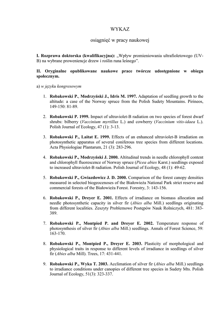 WYKAZ osiągnięć w pracy naukowej I. Rozprawa doktorska (kwalifikacyjna): „Wpływ promieniowania ultrafioletowego (UVB) na wybrane proweniencje drzew i roślin runa leśnego”. II. Oryginalne opublikowane naukowe prace twórcze udostępnione w obiegu społecznym. a) w języku kongresowym 1. Robakowski P., Modrzyński J., Idris M. 1997. Adaptation of seedling growth to the altitude: a case of the Norway spruce from the Polish Sudety Mountains. Pirineos, 149-150: 81-89. 2. Robakowski P. 1999. Impact of ultraviolet-B radiation on two species of forest dwarf shrubs: bilberry (Vaccinium myrtillus L.) and cowberry (Vaccinium vitis-idaea L.). Polish Journal of Ecology, 47 (1): 3-13. 3. Robakowski P., Laitat E. 1999. Effects of an enhanced ultraviolet-B irradiation on photosynthetic apparatus of several coniferous tree species from different locations. Acta Physiologiae Plantarum, 21 (3): 283-296. 4. Robakowski P., Modrzyński J. 2000. Altitudinal trends in needle chlorophyll content and chlorophyll fluorescence of Norway spruce (Picea abies Karst.) seedlings exposed to increased ultraviolet-B radiation. Polish Journal of Ecology, 48 (1): 49-62. 5. Robakowski P., Gwiazdowicz J. D. 2000. Comparison of the forest canopy densities measured in selected biogeocenoses of the BiałowieŜa National Park strict reserve and commercial forests of the BiałowieŜa Forest. Forestry, 3: 143-156. 6. Robakowski P., Dreyer E. 2001. Effects of irradiance on biomass allocation and needle photosynthetic capacity in silver fir (Abies alba Mill.) seedlings originating from different localities. Zeszyty Problemowe Postępów Nauk Rolniczych, 481: 383389. 7. Robakowski P., Montpied P. and Dreyer E. 2002. Temperature response of photosynthesis of silver fir (Abies alba Mill.) seedlings. Annals of Forest Science, 59: 163-170. 8. Robakowski P., Montpied P., Dreyer E. 2003. Plasticity of morphological and physiological traits in response to different levels of irradiance in seedlings of silver fir (Abies alba Mill). Trees, 17: 431-441. 9. Robakowski P., Wyka T. 2003. Acclimation of silver fir (Abies alba Mill.) seedlings to irradiance conditions under canopies of different tree species in Sudety Mts. Polish Journal of Ecology, 51(3): 323-337. 2 10. Robakowski P., Wyka T., Samardakiewicz S. and Kierzkowski D. 2004. Growth, photosynthesis and needle structure of silver fir (Abies alba Mill.) seedlings under different canopies. Forest Ecology and Management, 201(2-3): 211-227. 11. Robakowski P., Wyka T. 2004. Down-regulation of PSII in needles of silver fir (Abies alba Mill.) seedlings growing under the canopy of European larch and Norway spruce. Zeszyty Problemowe Postępów Nauk Rolniczych, 496: 421-431. 12. Robakowski P., Samardakiewicz S., Kierzkowski D. 2004. Variation in structure of needles of silver fir (Abies alba Mill.) saplings growing under the canopies of diverse tree species. Polish Journal of Ecology, 52(4): 563-568. Robakowski P., Samardakiewicz S., Kierzkowski D. 2004. Variation in structure of needles of silver fir (Abies alba Mill.) saplings growing under the canopies of diverse tree species. Opera Corcontica, 41(2): 400-406. 13. Robakowski P. 2004. Deficit in macroelements and variation in potential quantum yield of PSII in needles of silver fir (Abies alba Mill.) seedlings growing under different light conditions. Opera Corcontica, 41(2): 391-399. 14. Robakowski P. 2005. Susceptibility to low-temperature photoinhibition in three conifer tree species differing in successional status. Tree Physiology, 25: 1091-1100. 15. Robakowski P. 2005. Species-specific acclimation to strong shade modifies susceptibility of conifers to photoinhibition. Acta Physiologiae Plantarum, 27(3A): 255-263. 16. Robakowski P., Montpied P., Dreyer E. 2005. Responses to temperature and shade in Abies alba seedlings from diverse provenances. Scandinavian Journal of Forest Research, 20: 459 - 470. 17. Gwiazdowicz D., Olszowska G., Robakowski P. 2006. Preliminary research on mite fauna (Acari, Gamasida) and the activity of selected soil enzymes in the Karkonosze National Park. Acta Scientarum Polonorum. Silvarum Colendarum Ratio et Industria Lignaria, 5(2): 51-61. 18. Wyka T. Robakowski P., śytkowiak R. 2007. Leaf acclimation to contrasting irradiance in juvenile evergreen and deciduous trees. Tree Physiology 27: 1293-1306. 19. Kierzkowski D., Samardakiewicz S., Robakowski P. 2007. Variation in ultrastructure of chloroplasts of needles of silver fir ( Abies alba Mill.) saplings growing under the canopies of diverse tree species. Polish Journal of Ecology, 55(4): 821-825. 20. Robakowski P., Antczak P. 2008. Ability of silver fir and European beech saplings to acclimate photochemical processes to the light environment under different canopies of trees. Polish Journal of Ecology, 56(1): 3-16. 3 21. Wyka T., Robakowski P., śytkowiak R. 2008. Leaf age as a factor in anatomical and physiological acclimative responses of Taxus baccata L. needles to contrasting irradiance environments. Photosynthesis Research, 95: 87-99. b) w języku niekongresowym 22. Robakowski P. 1992. Zmienność fauny stawonogów glebowych w drzewostanach pozostających pod presją emisji Zakładów Chemicznych „Police”. Sylwan, 10: 73-82. 23. Robakowski P. 1998. Wpływ promieniowania ultrafioletowego (UV-B) na wybrane proweniencje niektórych gatunków drzew i roślin runa leśnego. W: Ekofizjologiczne aspekty reakcji roślin na działanie abiotycznych czynników stresowych. S. Grzesiak, A. Skoczowski, Z. Miszalski (red.). Polska Akademia Nauk, Zakład Fizjologii Roślin im. Franciszka Górskiego, Kraków, str.: 95 – 101. 24. Robakowski P. 1998. Wpływ promieniowania ultrafioletowego podwyŜszonym natęŜeniu na rośliny. Kosmos, 47 (1): 95-105. UV-B o 25. Robakowski P., Modrzyński J., Niemczyk M., Zwaduch P. 2000. AŜurowość i fotosyntetyczna gęstość strumienia fotonów w drzewostanach z odnowieniem jodły pospolitej (Abies alba Mill.). Opera Corcontic