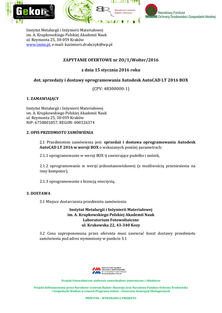 ZO/1/Wolter/2016 z dnia 15 stycznia 2016 dot. zakupu