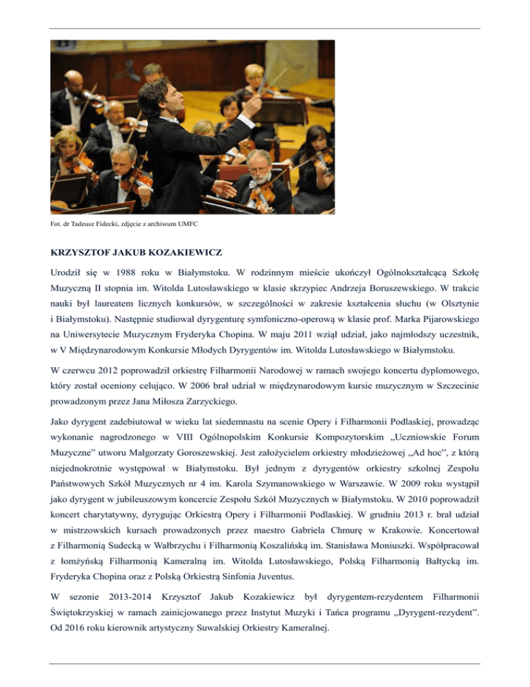 Fot. dr Tadeusz Fidecki, zdjęcie z archiwum UMFC KRZYSZTOF JAKUB KOZAKIEWICZ Urodził się w 1988 roku w Białymstoku. W rodzinnym mieście ukończył Ogólnokształcącą Szkołę Muzyczną II stopnia im. Witolda Lutosławskiego w klasie skrzypiec Andrzeja Boruszewskiego. W trakcie nauki był laureatem licznych konkursów, w szczególności w zakresie kształcenia słuchu (w Olsztynie i Białymstoku). Następnie studiował dyrygenturę symfoniczno-operową w klasie prof. Marka Pijarowskiego na Uniwersytecie Muzycznym Fryderyka Chopina. W maju 2011 wziął udział, jako najmłodszy uczestnik, w V Międzynarodowym Konkursie Młodych Dyrygentów im. Witolda Lutosławskiego w Białymstoku. W czerwcu 2012 poprowadził orkiestrę Filharmonii Narodowej w ramach swojego koncertu dyplomowego, który został oceniony celująco. W 2006 brał udział w międzynarodowym kursie muzycznym w Szczecinie prowadzonym przez Jana Miłosza Zarzyckiego. Jako dyrygent zadebiutował w wieku lat siedemnastu na scenie Opery i Filharmonii Podlaskiej, prowadząc wykonanie nagrodzonego w VIII Ogólnopolskim Konkursie Kompozytorskim „Uczniowskie Forum Muzyczne” utworu Małgorzaty Goroszewskiej. Jest założycielem orkiestry młodzieżowej „Ad hoc”, z którą niejednokrotnie występował w Białymstoku. Był jednym z dyrygentów orkiestry szkolnej Zespołu Państwowych Szkół Muzycznych nr 4 im. Karola Szymanowskiego w Warszawie. W 2009 roku wystąpił jako dyrygent w jubileuszowym koncercie Zespołu Szkół Muzycznych w Białymstoku. W 2010 poprowadził koncert charytatywny, dyrygując Orkiestrą Opery i Filharmonii Podlaskiej. W grudniu 2013 r. brał udział w mistrzowskich kursach prowadzonych przez maestro Gabriela Chmurę w Krakowie. Koncertował z Filharmonią Sudecką w Wałbrzychu i Filharmonią Koszalińską im. Stanisława Moniuszki. Współpracował z łomżyńską Filharmonią Kameralną im. Witolda Lutosławskiego, Polską Filharmonią Bałtycką im. Fryderyka Chopina oraz z Polską Orkiestrą Sinfonia Juventus. W sezonie 2013-2014 Krzysztof Jakub Kozakiewicz był dyrygentem-rezydentem Filharmonii Świętokrzyskiej w ramach zainicjowanego przez Instytut Muzyki i Tańca programu „Dyrygent-rezydent”. Od 2016 roku kierownik artystyczny Suwalskiej Orkiestry Kameralnej.